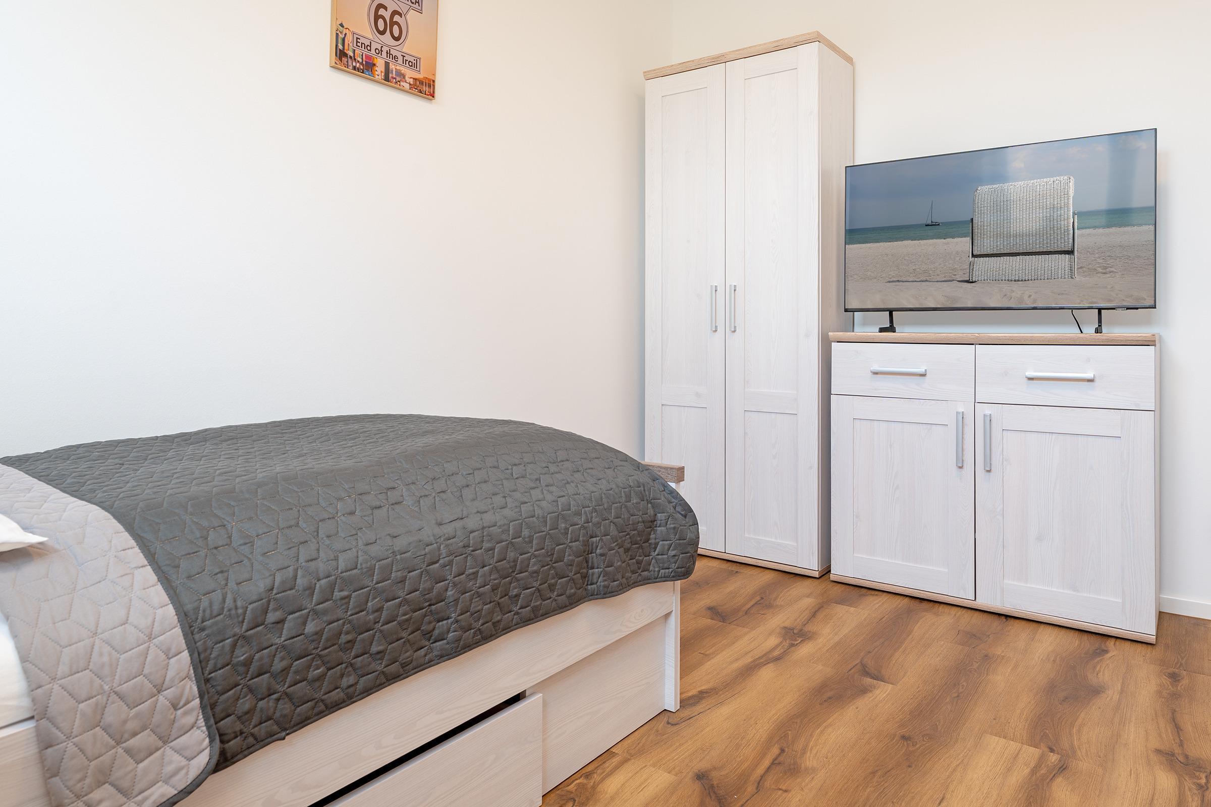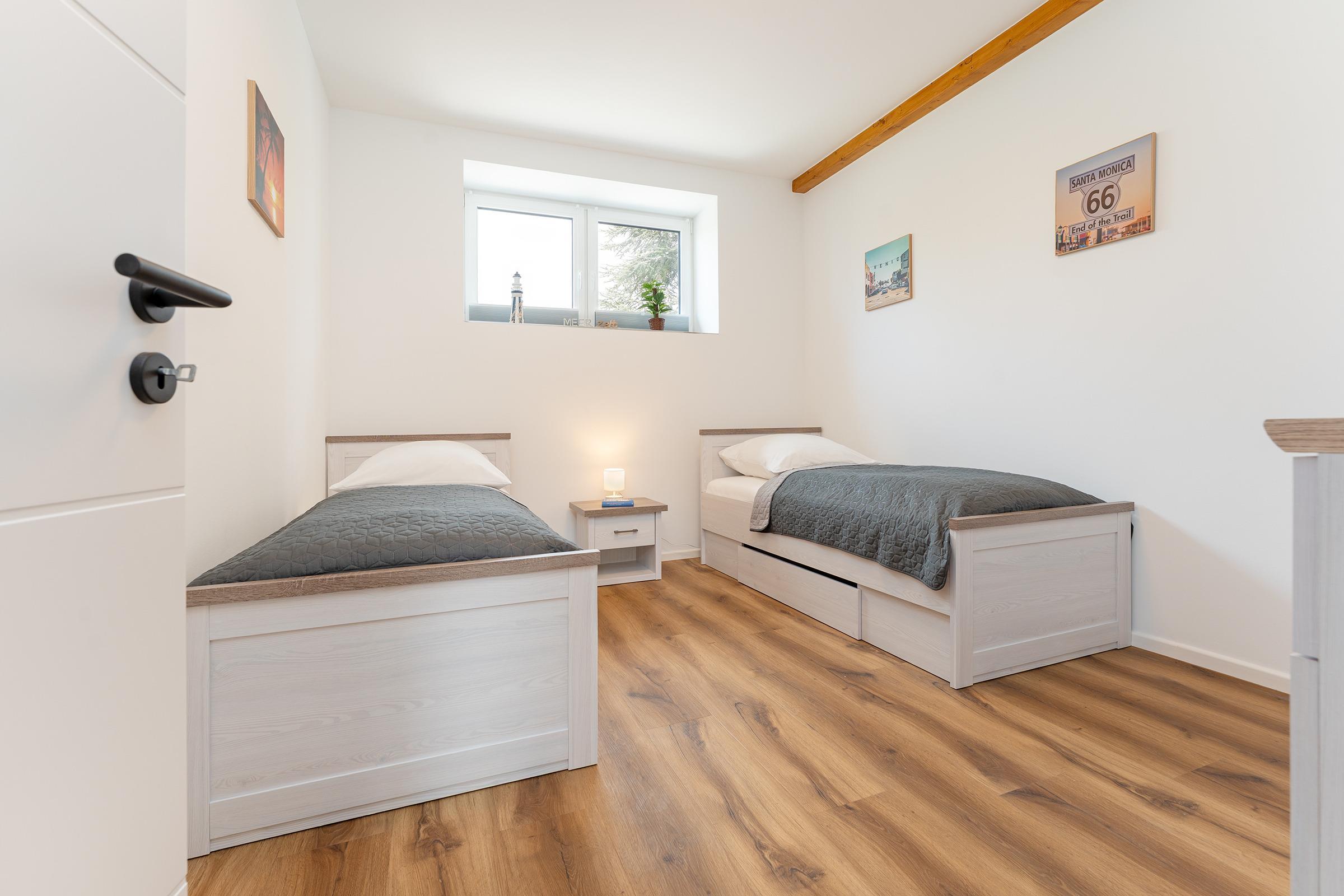 Schlafzimmer 2: 2 Einzelbetten (2x 90x200 cm), Kleiderschrank, Verdunkelung: Verdunkelungsplissees und -vorhänge, Platz für ein Babybett vorhanden