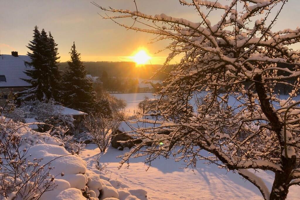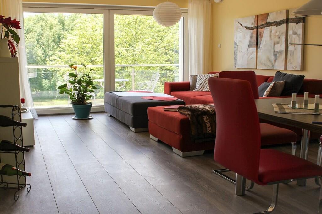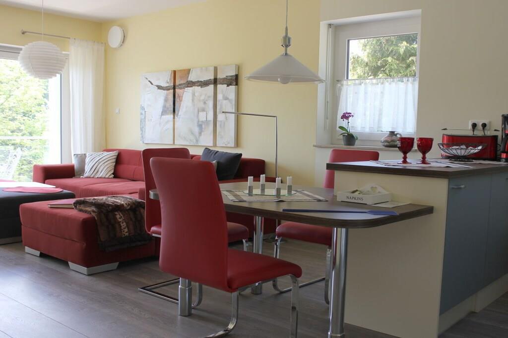 Unsere Ferienwohnung ist modern, liebevoll und komfortabel für Sie eingerichtet. Das große Wohnzimmer mit seiner Wohnlandschaft vor dem Panoramafenster wird Sie begeistern. Ein komplett ausgestatteter offener Küchenbereich und der Balkon vervollständigen Ihren Wohlfühlbereich. Die Ferienwohnung erstreckt sich über zwei Etagen. Über die innenliegende Holztreppe erreichen Sie Ihr Schlaf- und das Badezimmer im Dachgeschoss. Im Schlafzimmer finden Sie ein modernes Boxspring- Doppelbett und ein bequemes Tagesbett zum Relaxen, das Badezimmer ist mit bodentiefer Dusche, WC & Bidet exklusiv ausgestattet. Der Wellness- Bereich im Dachgeschoss von Haus Kallenberg mit Infra-Rot-Kabine kann gegen Aufpreis von Ihnen genutzt werden.