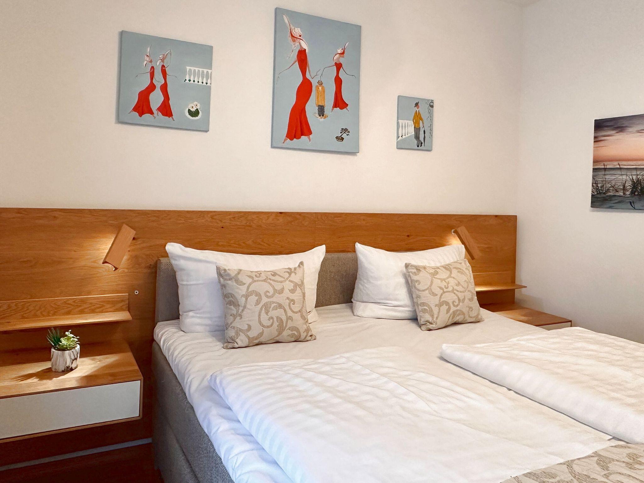 Das erste der beiden Schlafzimmer ist mit einem Doppelbett ( 160 x 200cm / zwei getrennte Matratzen), das zweite mit einem komfortablen Boxspringbett ( 160 x 200cm / eine durchgehende Matratze) ausgestattet. Während das eine Schlafzimmer mit einem Flachbildfernseher ausgestattet ist, überzeugt das zweite durch den zweiten direkten Zugang zum Privatbalkon mit nordöstlicher Ausrichtung.