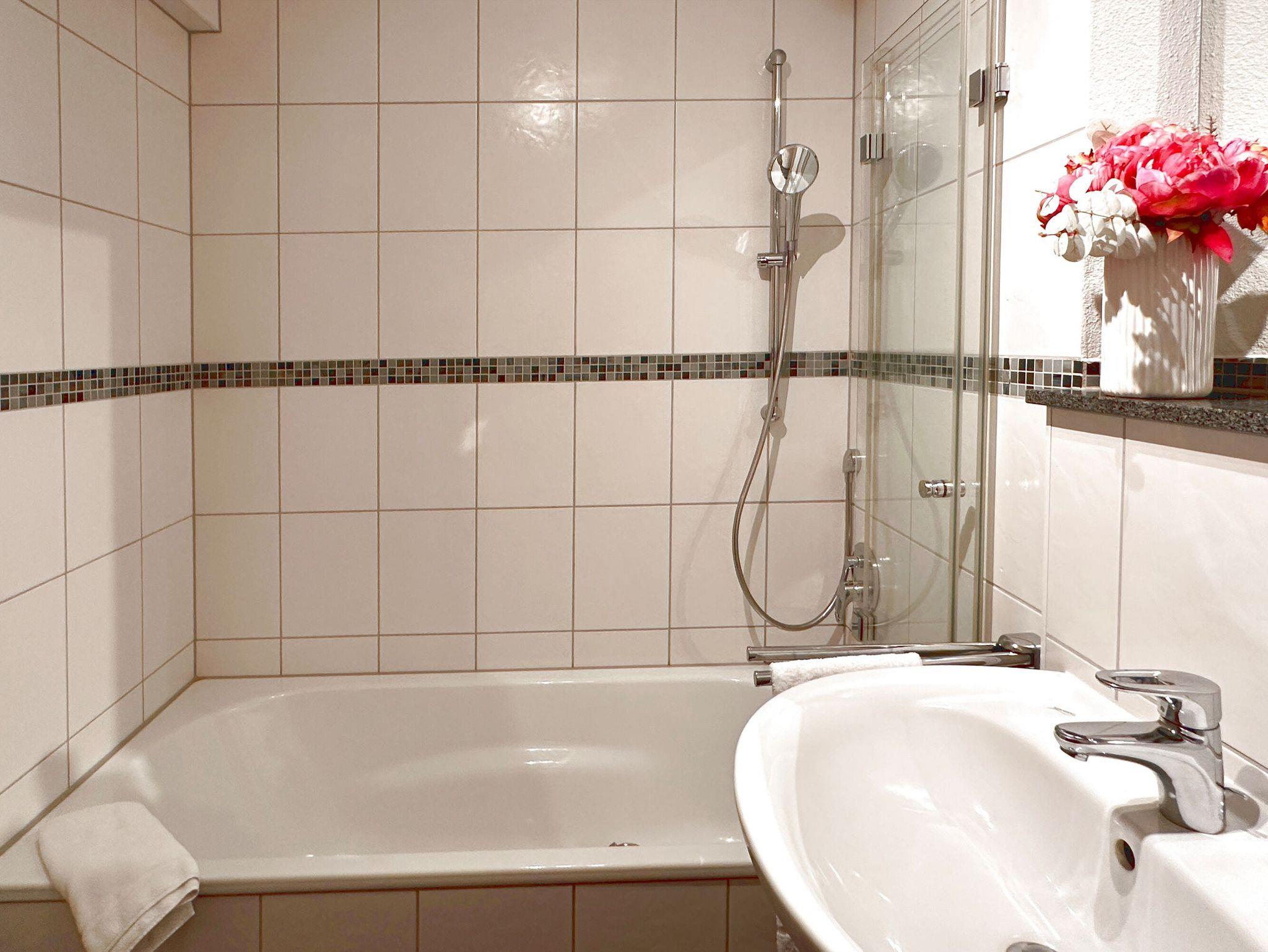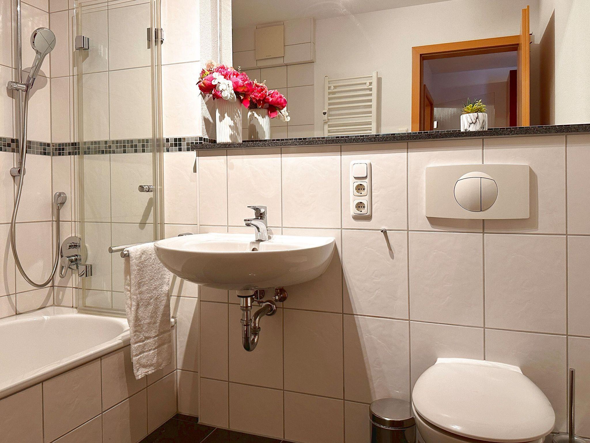 Damit Sie Ihre wohlverdiente Urlaubszeit bereits am Anreisetag in vollen Zügen genießen können, haben wir das Bett für Sie und das für Ihre lieben Mitreisenden bereits bezogen und ein Duschtuch sowie ein kleines Handtuch bereitgelegt. Das Appartement verfügt über ein Badezimmer mit Badewanne WC und einem Haartrockner. Ein Gäste-WC komplettiert den erstklassigen Urlaubskomfort.