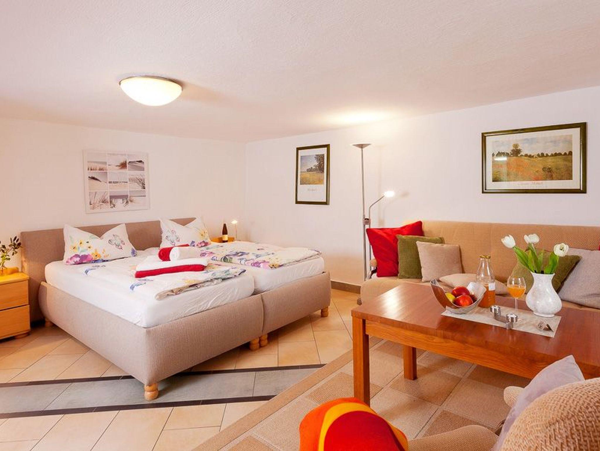 Das Zwei-Zimmer-Appartement befindet sich im Souterrain des vorderen Hauses und bietet mit seiner 35 Quadratmeter großen Wohnfläche ausreichend Platz für einen erholsamen Urlaub zu zweit. Warme mediterrane Farben schaffen in Wohn- und Schlafzimmer eine angenehme und gemütliche Atmosphäre. Der Wohnraum ist mit bequemen Polstermöbeln ausgestattet, die nach einem anstrengenden Tag zum Entspannen einladen. Ein moderner Flat-TV macht es möglich, dass Sie auch im Urlaub auf keine Ihrer Lieblingsserien verzichten müssen. Das gemütliche Doppelbett (180 x 200cm / zwei getrennte Matratzen) lockt für die Nachtruhe, aber auch für ein Schlummerstündchen am Nachmittag.