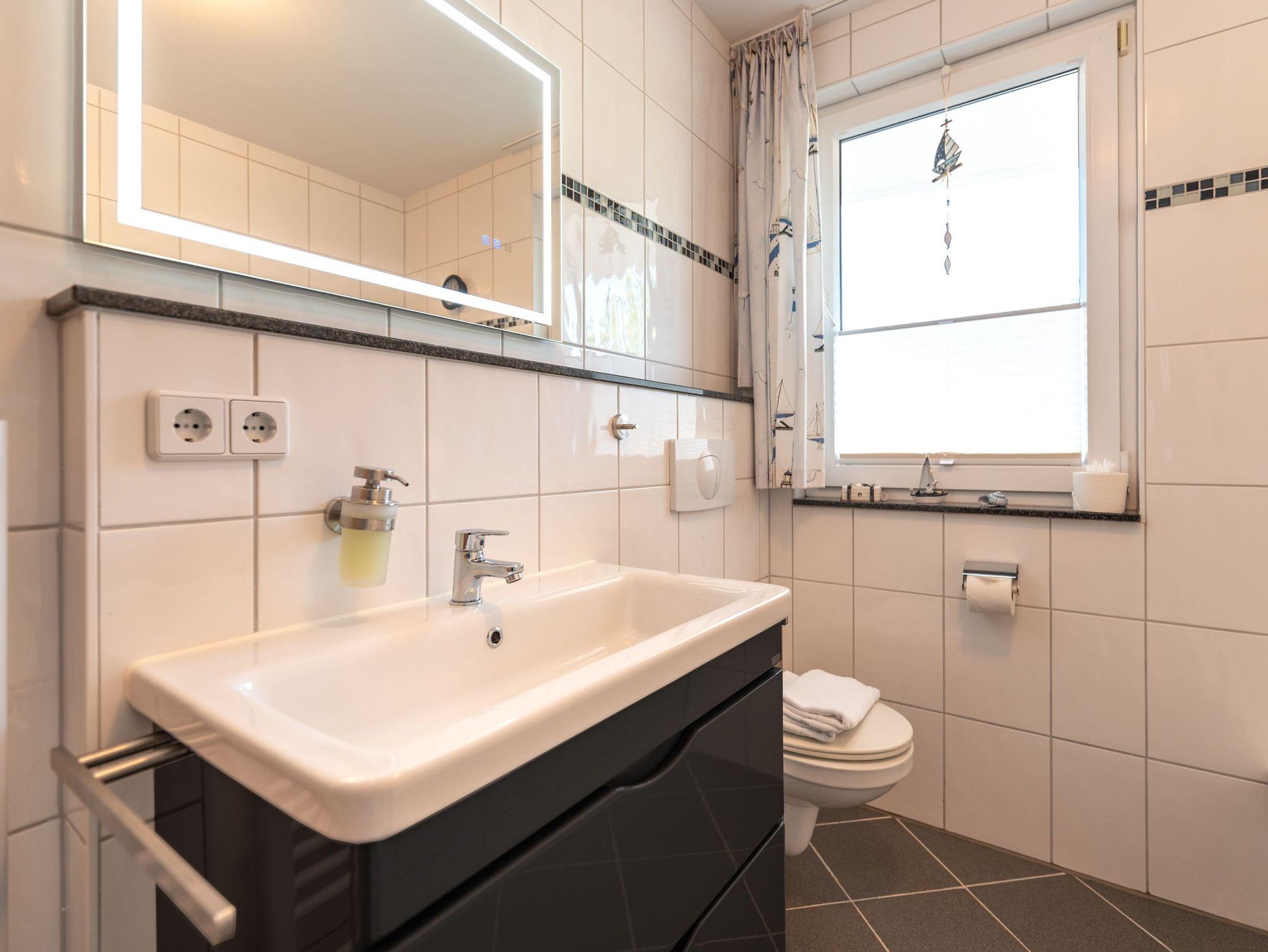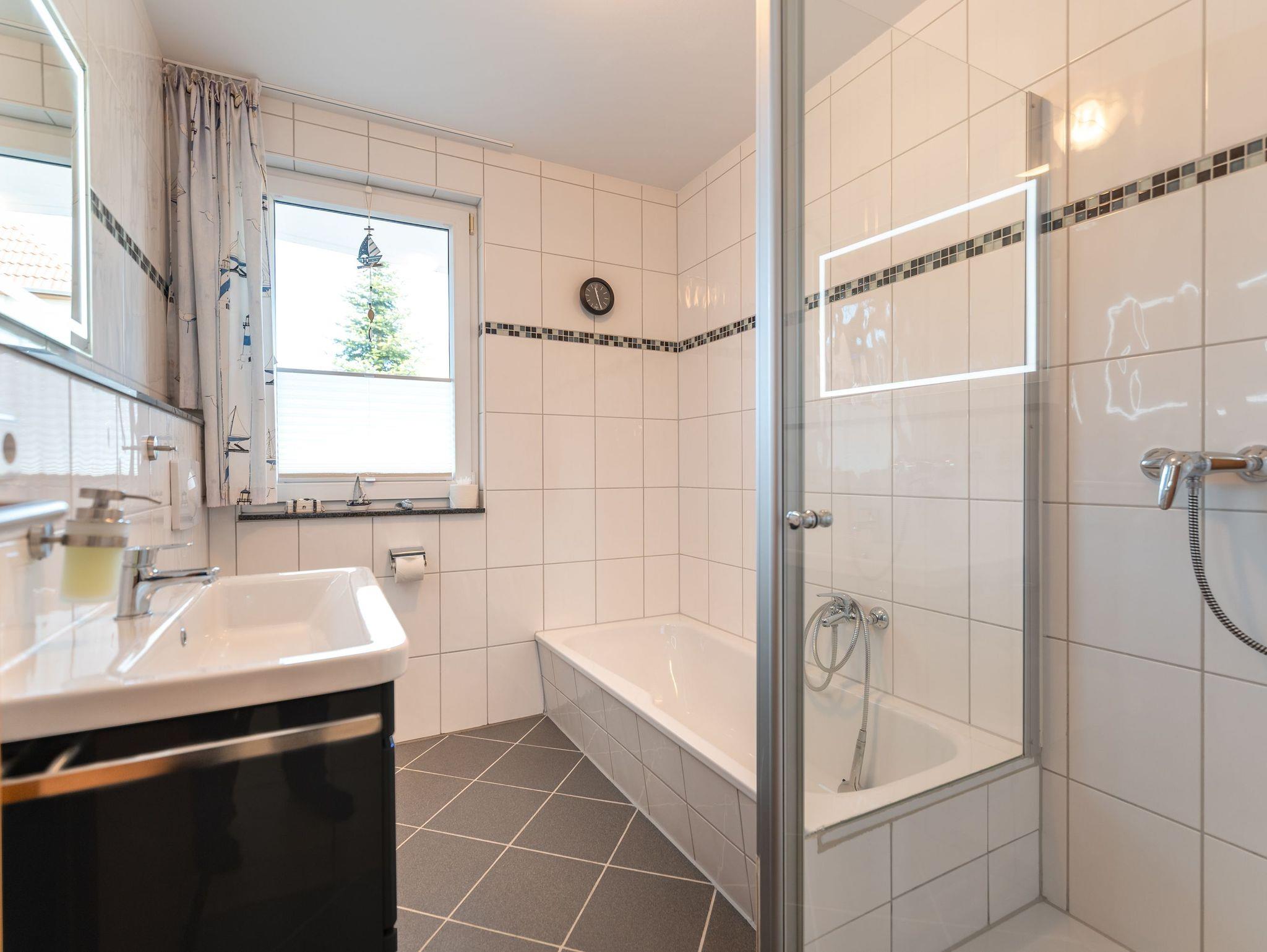 Das Badezimmer ist modern eingerichtet und verfügt über eine ebenerdige Dusche, eine Badewanne, ein WC und einen Fön.