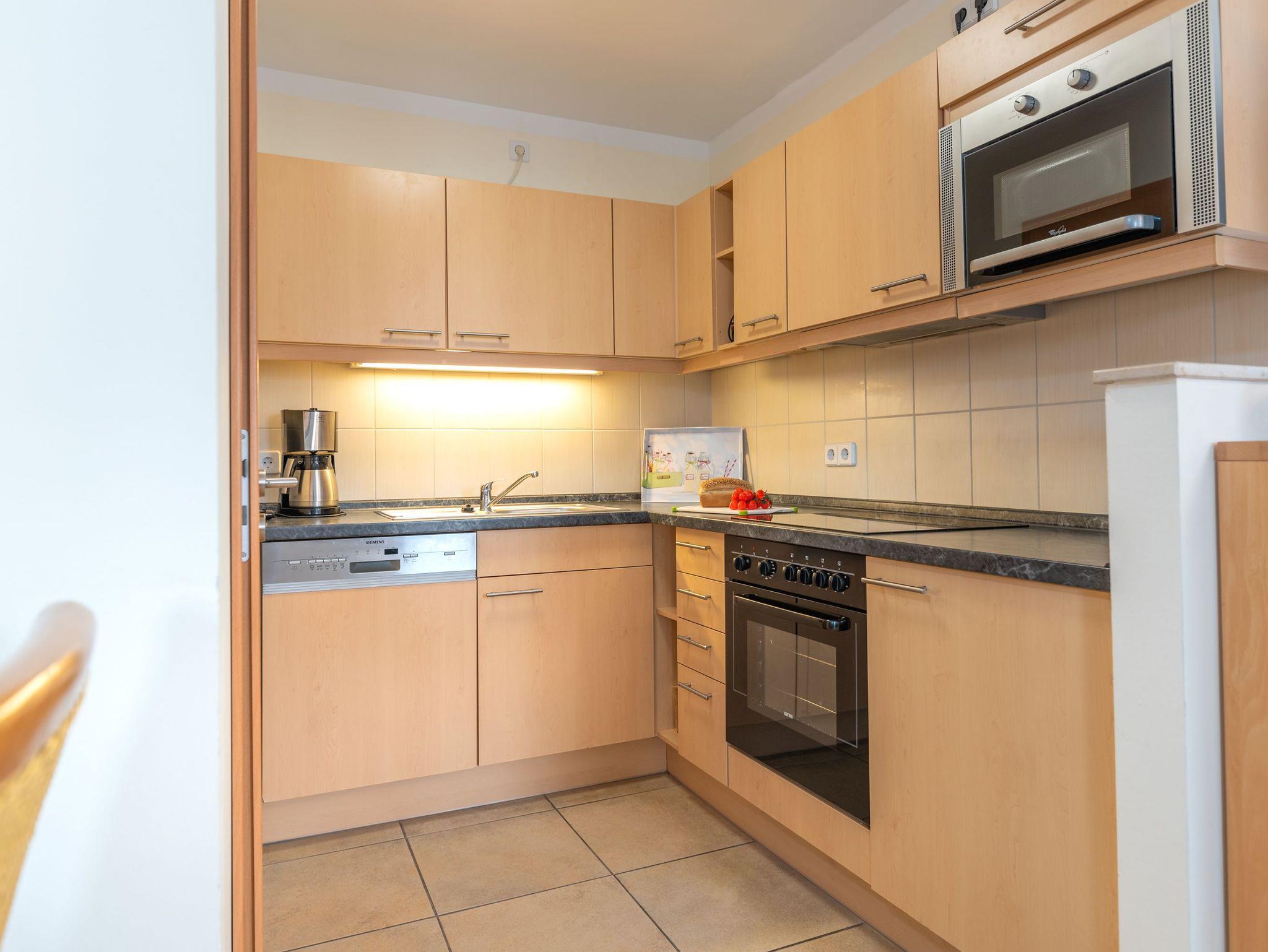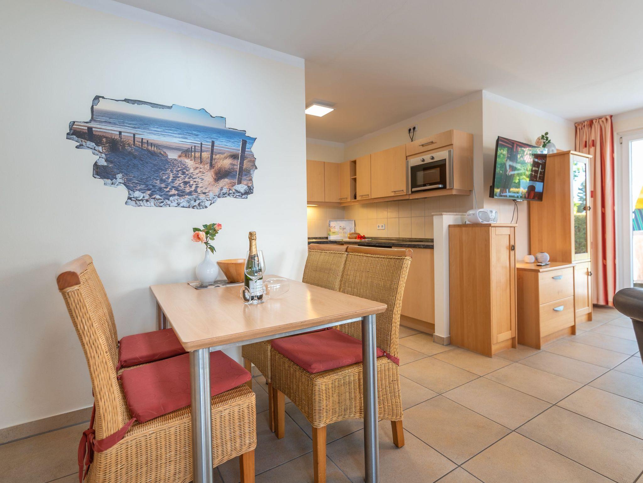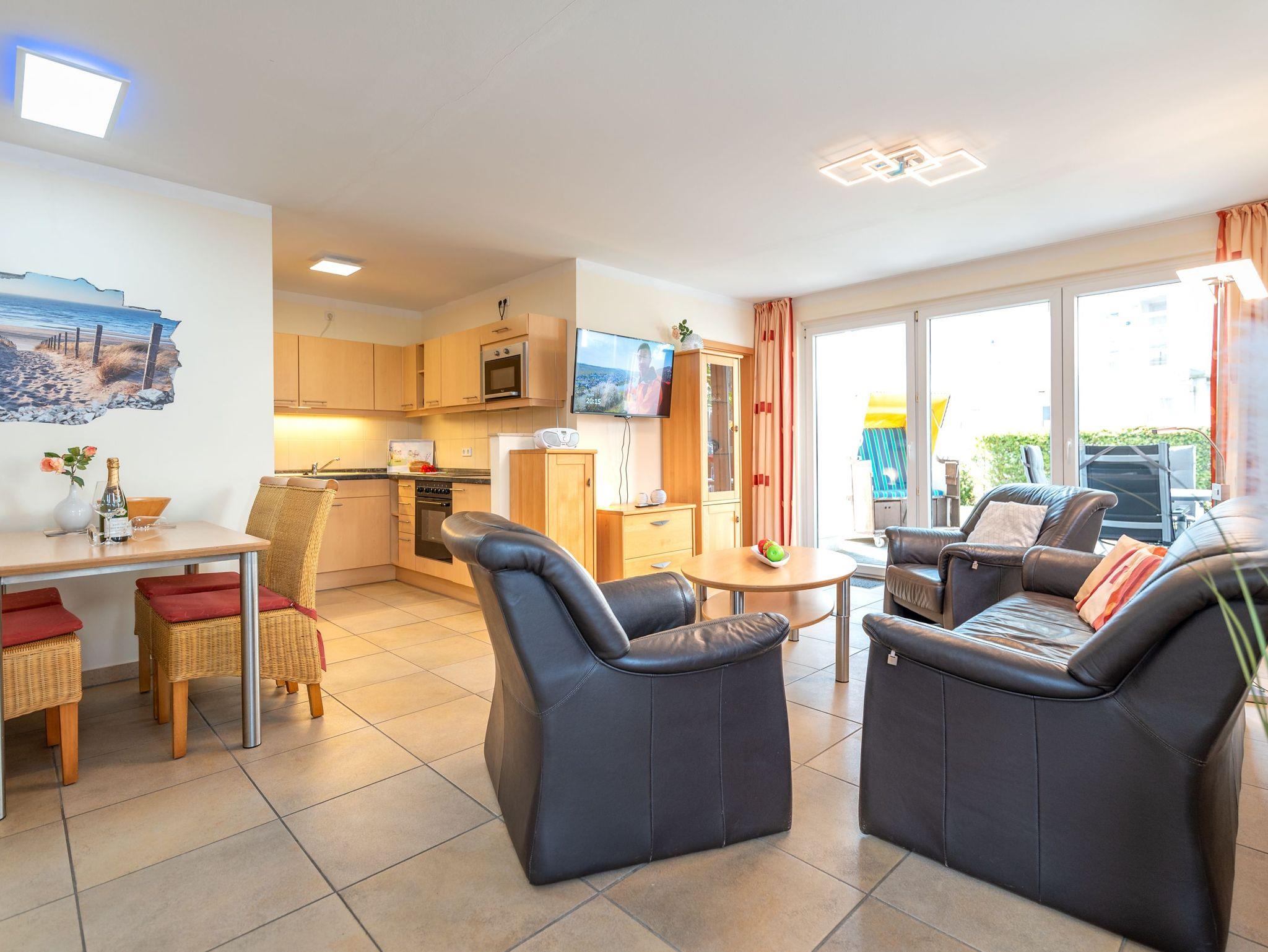 Die Ferienwohnung verfügt über ein gemütliches Schlafzimmer mit Doppelbett und ein weiteres Schlafzimmer mit zwei getrennt stehenden Betten. Das Wohnzimmer ist mit einer komfortablen Ledersitzgarnitur, einem Esstisch mit vier Stühlen sowie einem Flachbild-TV und einem CD-Radio ausgestattet. Die integrierte, voll ausgestattete Küchenzeile lässt keine Wünsche offen.