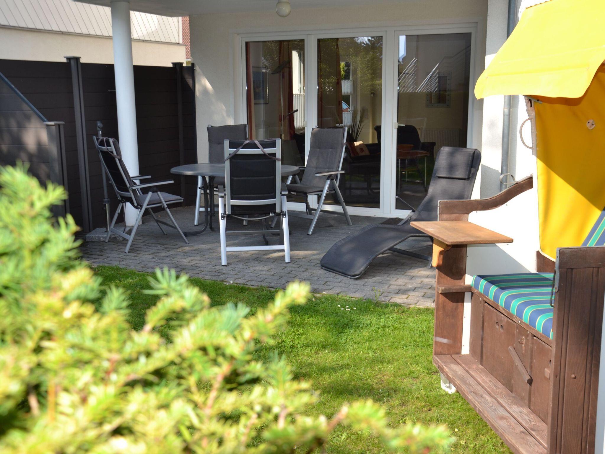 Für entspannte Stunden im Freien steht Ihnen eine große, gemütliche Terrasse in attraktiver Südlage zur Verfügung. Im Sommer steht Ihnen ein Strandkorb auf der Terrasse zur Verfügung. Die Terrasse ist sowohl durch die Wohnung als auch durch ein abschließbares Gartentor neben der Eingangstür zu erreichen.