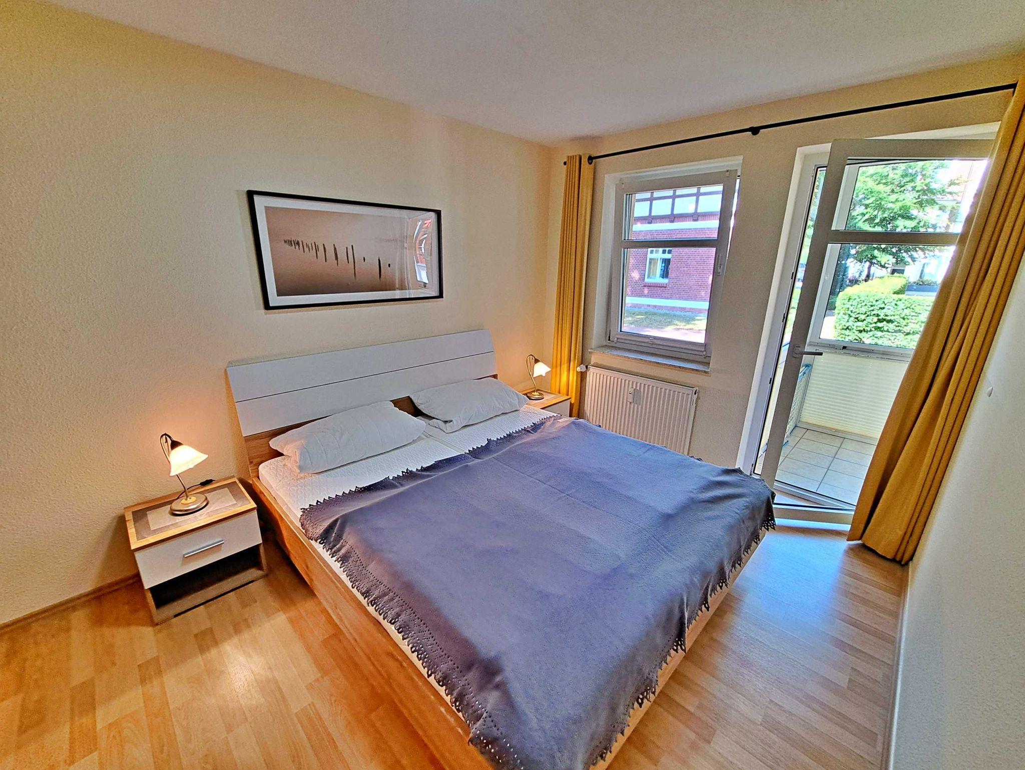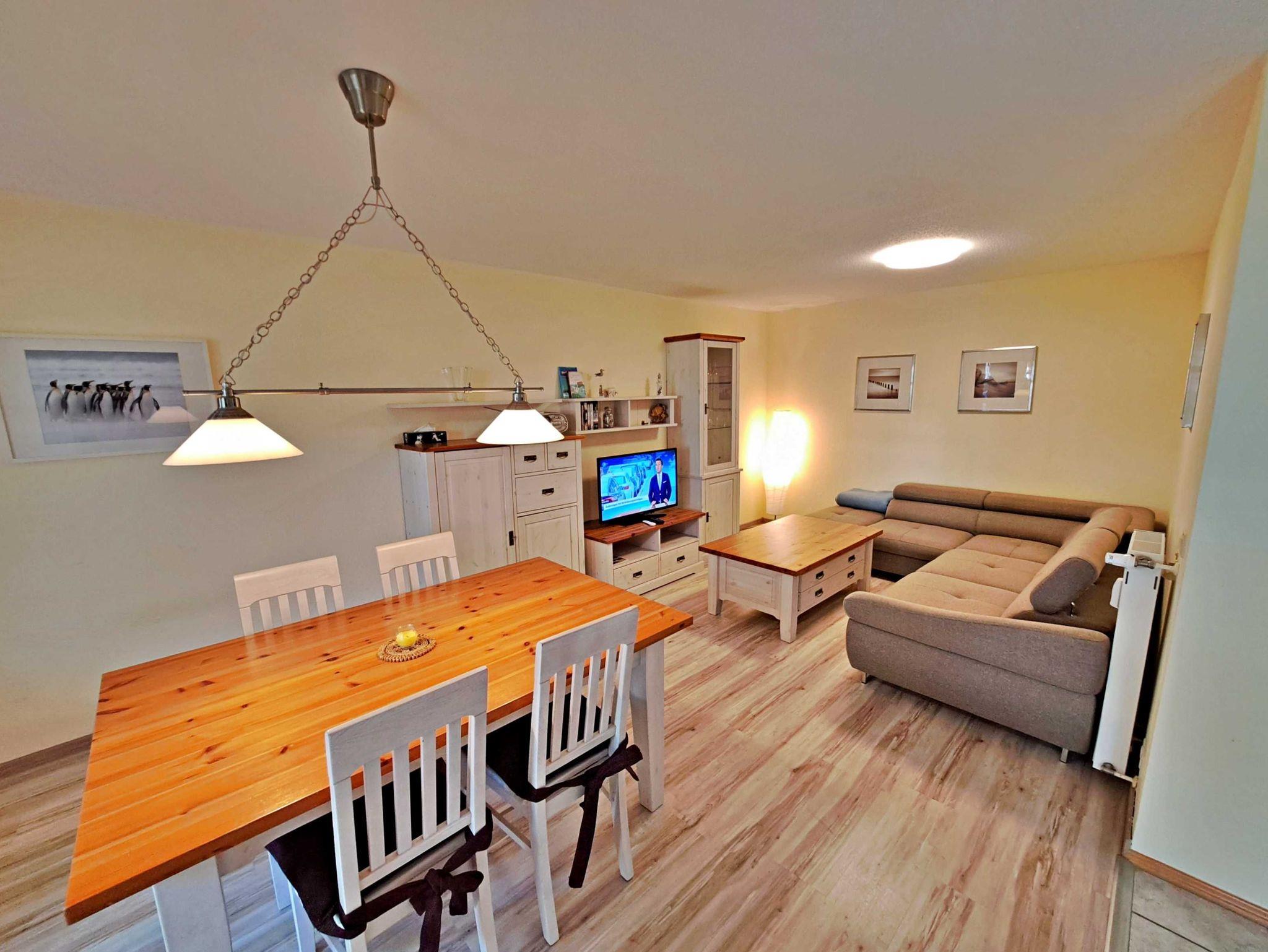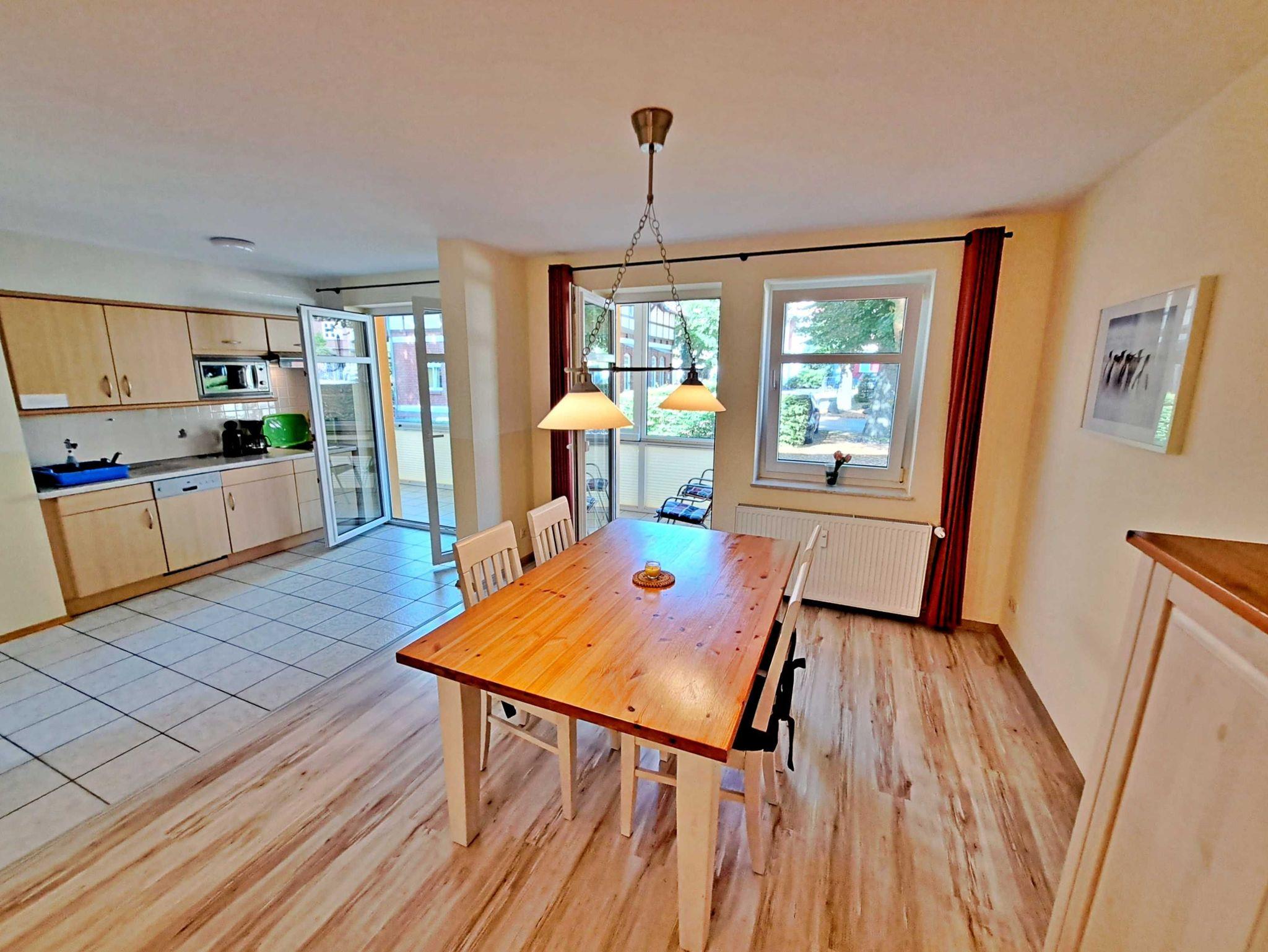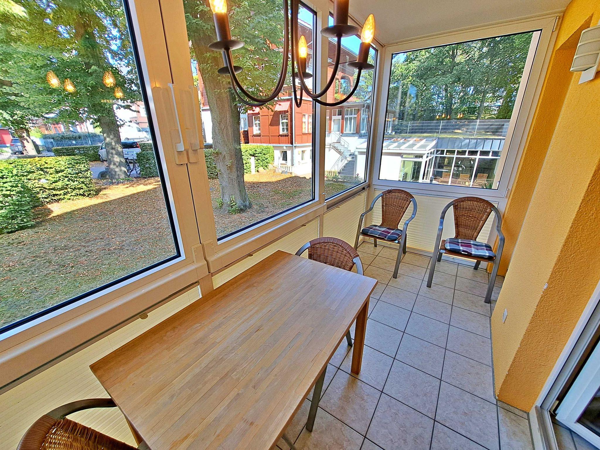 Diese komfortable 2-Raum-Ferienwohnung befindet sich im Haus Karavelle in Hochparterre. Von der Diele aus gelangen Sie in den großzügigen Wohnbereich mit Küchenzeile und Esstisch mit 4 Stühlen. Die Küche ist mit einem 2 Plattenherd, Kühlschrank, Mikrowelle, Spüle und Geschirr ausgestattet. Im hell möblierten Wohnzimmer befindet sich außerdem eine Eckcouch, Flat TV und CD Player. Im angrenzenden Wintergarten können Sie das Frühstück genießen oder den Abend bei einem Glas Wein ausklingen lassen. Im Schlafzimmer finden Sie ein bequemes Doppelbett. Für Kleinkinder kann hier auch ein Kinderbett aufgestellt werden. Das Bad ist mit Dusche/WC ausgestattet.
