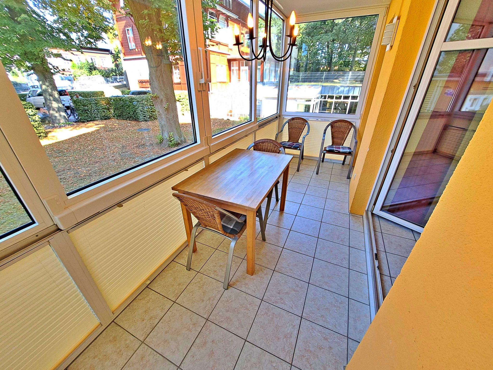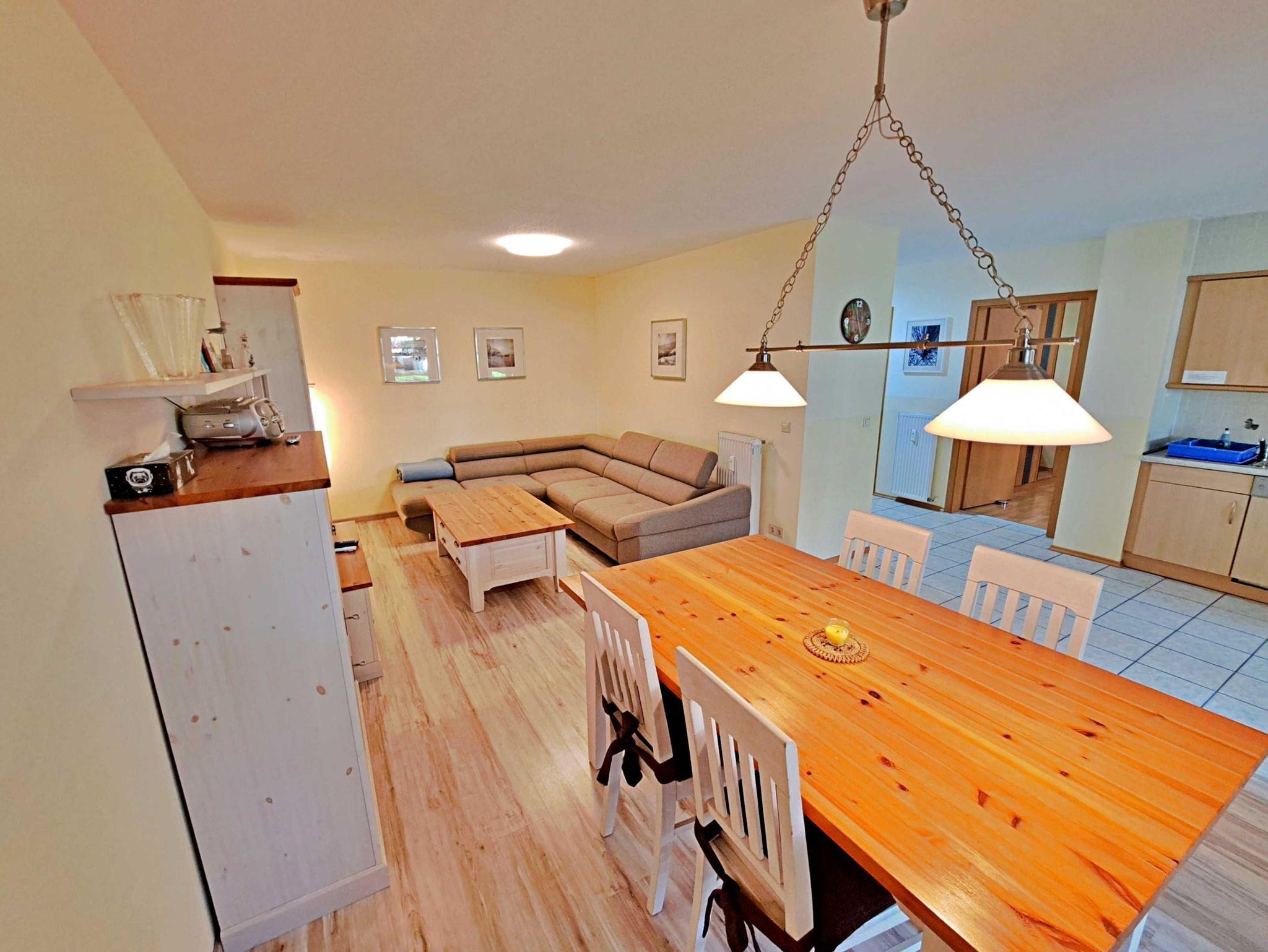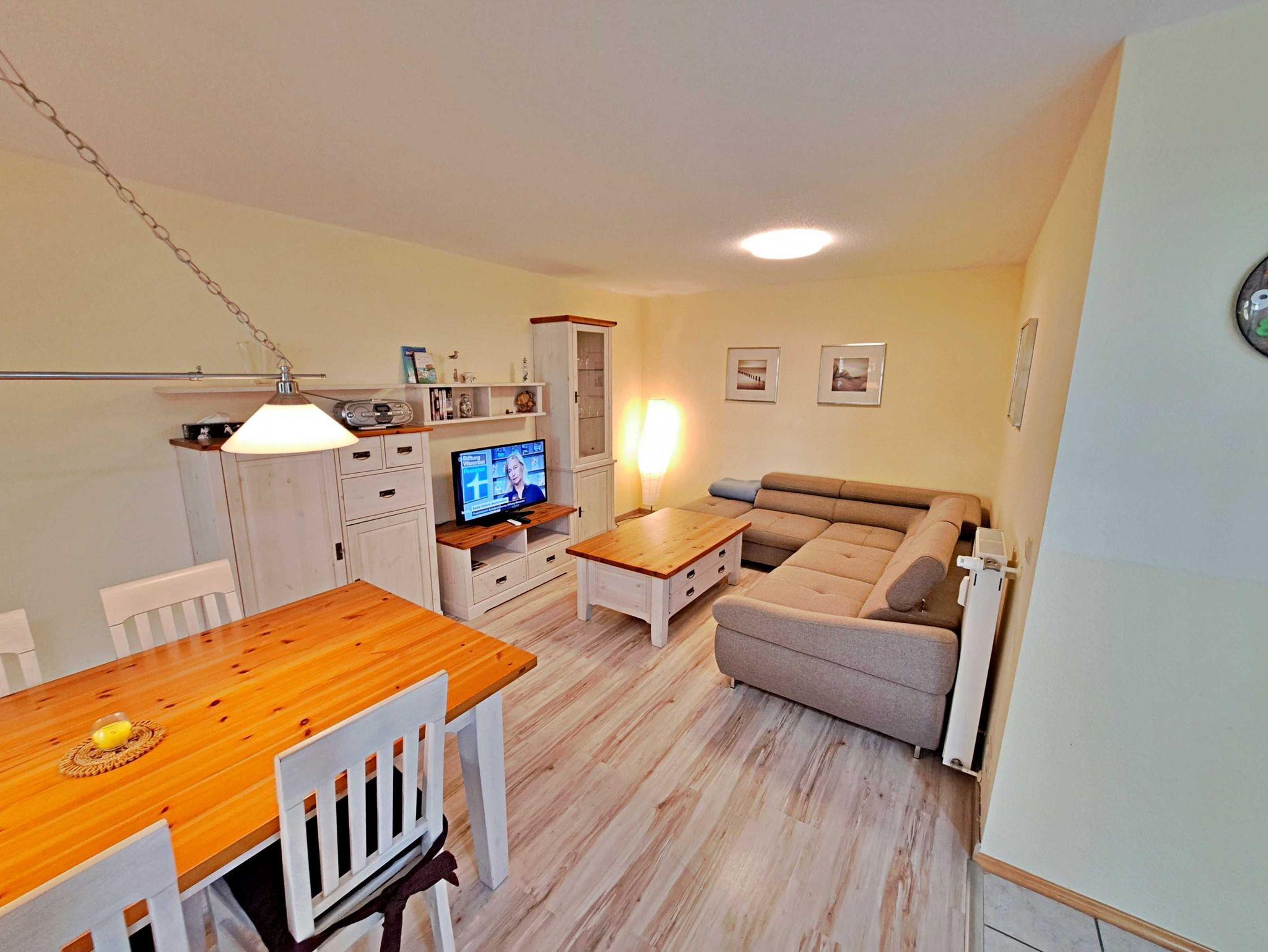 Diese komfortable 2-Raum-Ferienwohnung befindet sich im Haus Karavelle in Hochparterre. Von der Diele aus gelangen Sie in den großzügigen Wohnbereich mit Küchenzeile und Esstisch mit 4 Stühlen. Die Küche ist mit einem 2 Plattenherd, Kühlschrank, Mikrowelle, Spüle und Geschirr ausgestattet. Im hell möblierten Wohnzimmer befindet sich außerdem eine Eckcouch, Flat TV und CD Player. Im angrenzenden Wintergarten können Sie das Frühstück genießen oder den Abend bei einem Glas Wein ausklingen lassen. Im Schlafzimmer finden Sie ein bequemes Doppelbett. Für Kleinkinder kann hier auch ein Kinderbett aufgestellt werden. Das Bad ist mit Dusche/WC ausgestattet.