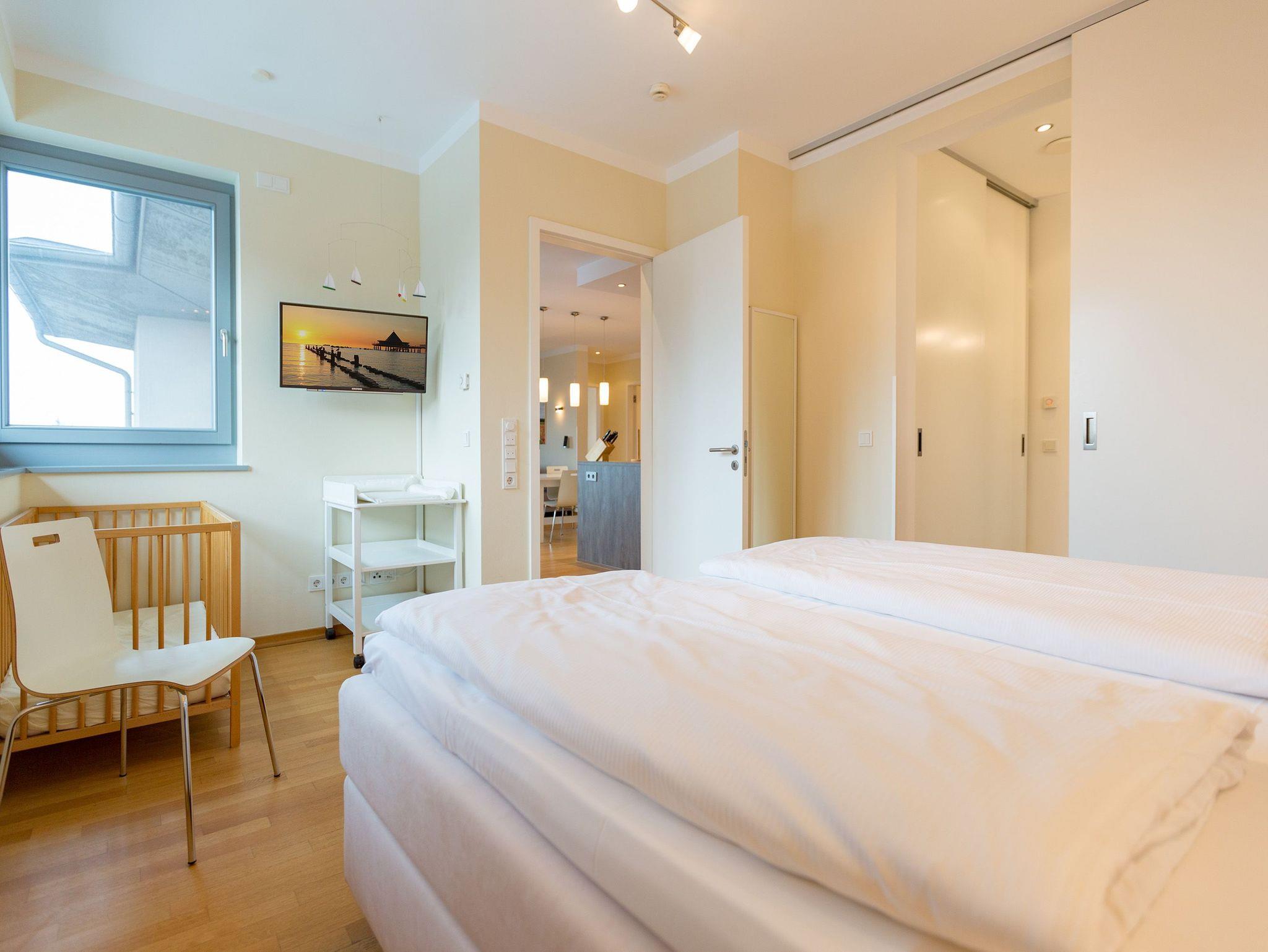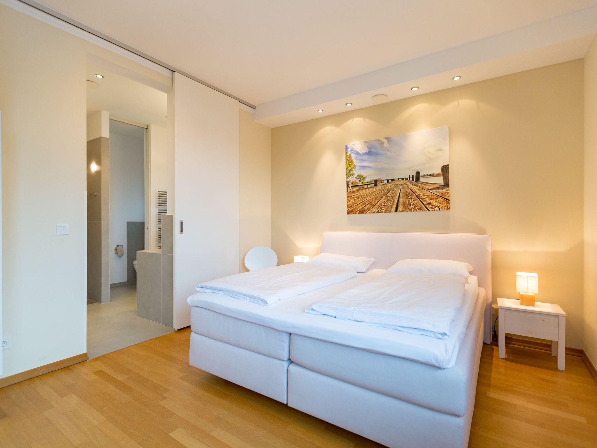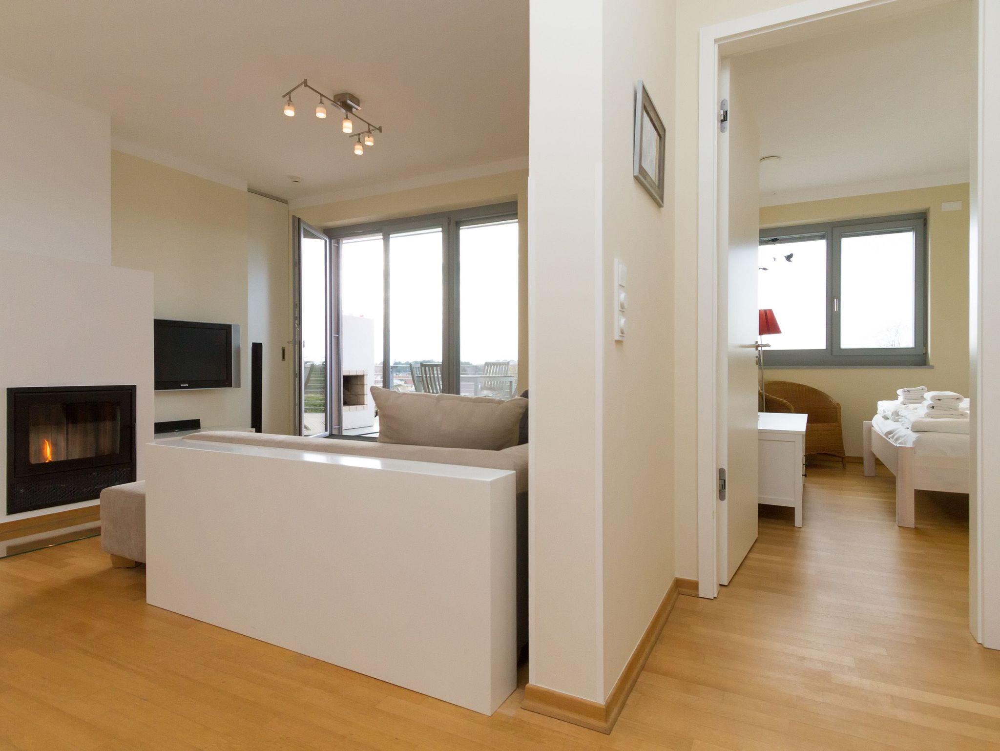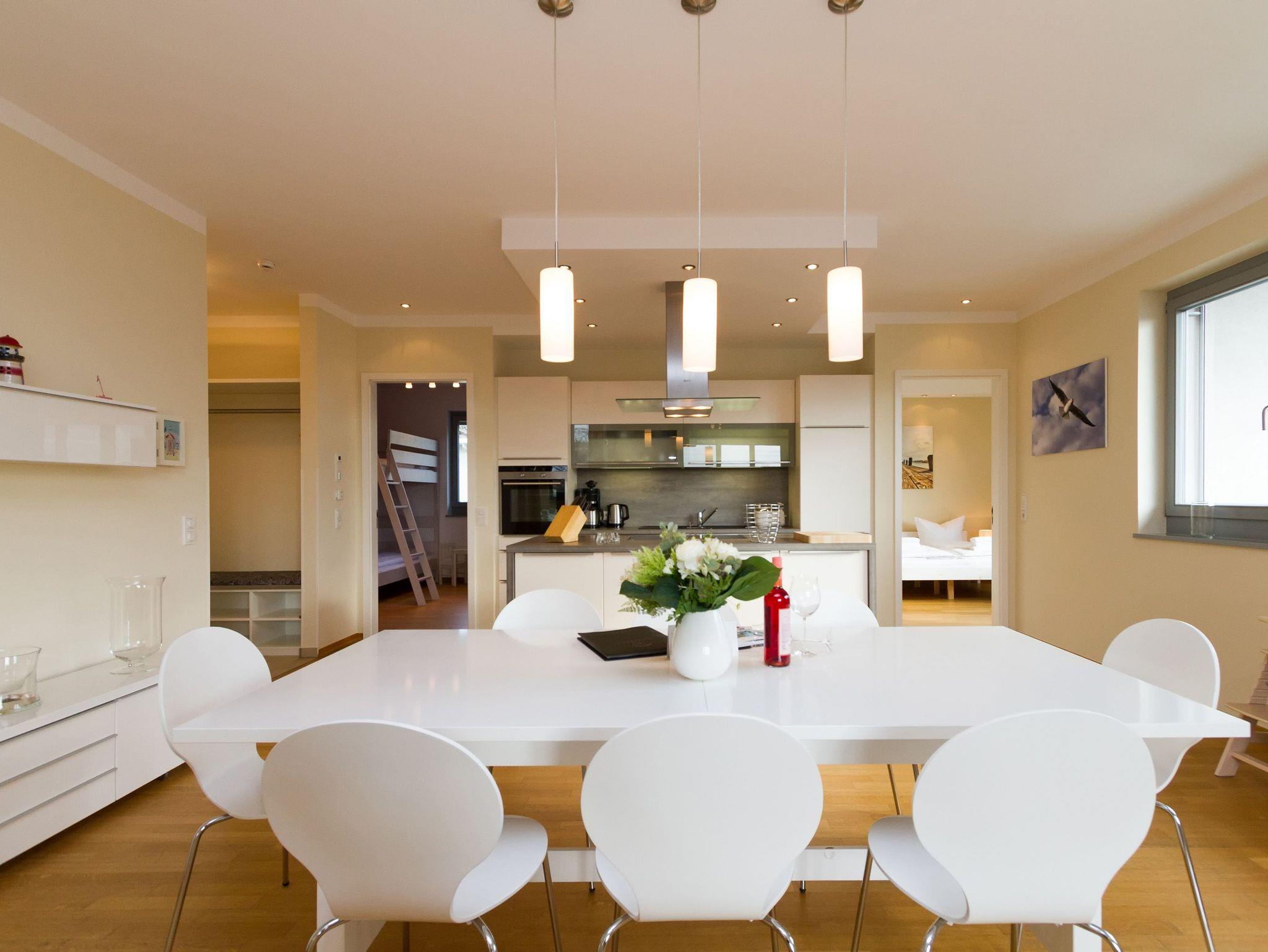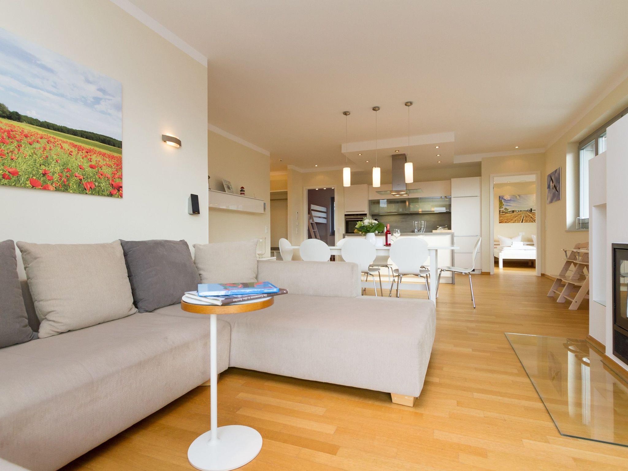 Sie wünschen sich viel Platz, zwei Wohlfühlbäder, eine perfekt ausgestattete Küche und ein geschmackvolles, wertiges Wohnambiente? Dann Sind Sie hier genau richtig. Mit viel Liebe zum Detail eingerichtet, erwartet Sie im 2. Obergeschoss ein außergewöhnlich großzügiges Urlaubsdomizil. 115 qm Wohnfläche aufgeteilt in Wohnbereich, offene, komplett ausgestattete Küche und 3 Schlafzimmer (1x 1,80m + Kinderbett/ 1x 1,60m / 1x Etagenbett) und 2 Bäder. Für Ihren Komfort steht die Erstausstattung Wäsche (Bettwäsche [&] Handtücher) für Sie bereit. Eine große sonnige Dachterrasse mit Strandkorb lädt zum Erholen ein. Die Infrarot-Kabine unterstreicht die Exklusivität dieser Ferienwohnung und ist ein Garant für lauschige Abende in der kalten Jahreszeit. Ein ideales Urlaubsdomizil für 4 Erwachsene und 2 Kinder bis 16 Jahren und ein Kleinkind. Das WLAN-Netz im Haus kann kostenfrei genutzt werden.