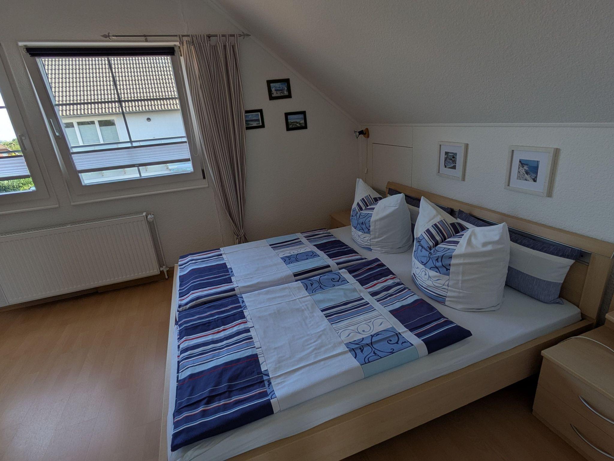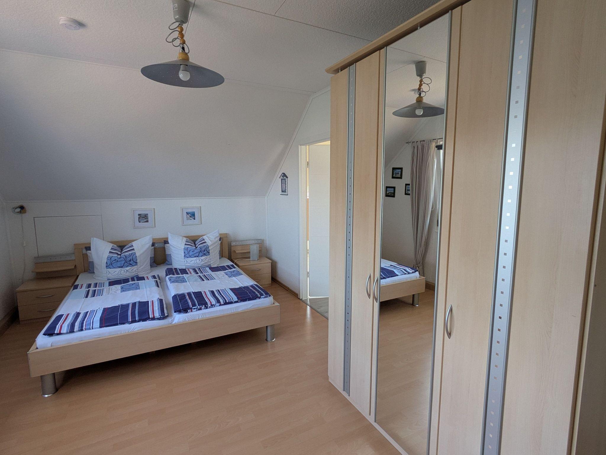 Die 65 qm große Ferienwohnung im ersten Obergeschoss verfügt über einen Wohnraum mit gemütlicher Sitzecke und TV, eine angrenzende Küchenzeile, ausgestattet mit Kühlschrank (mit Gefrierfach), Ceran-Herd, Backofen und vielen weiteren Dingen sowie einen Essplatz. Das Schlafzimmer verfügt über eine Doppelbett und TV. Bad mit Badewanne und WC. Ein Balkon (Südwest-Lage) rundet das Angebot der Wohnung ab.