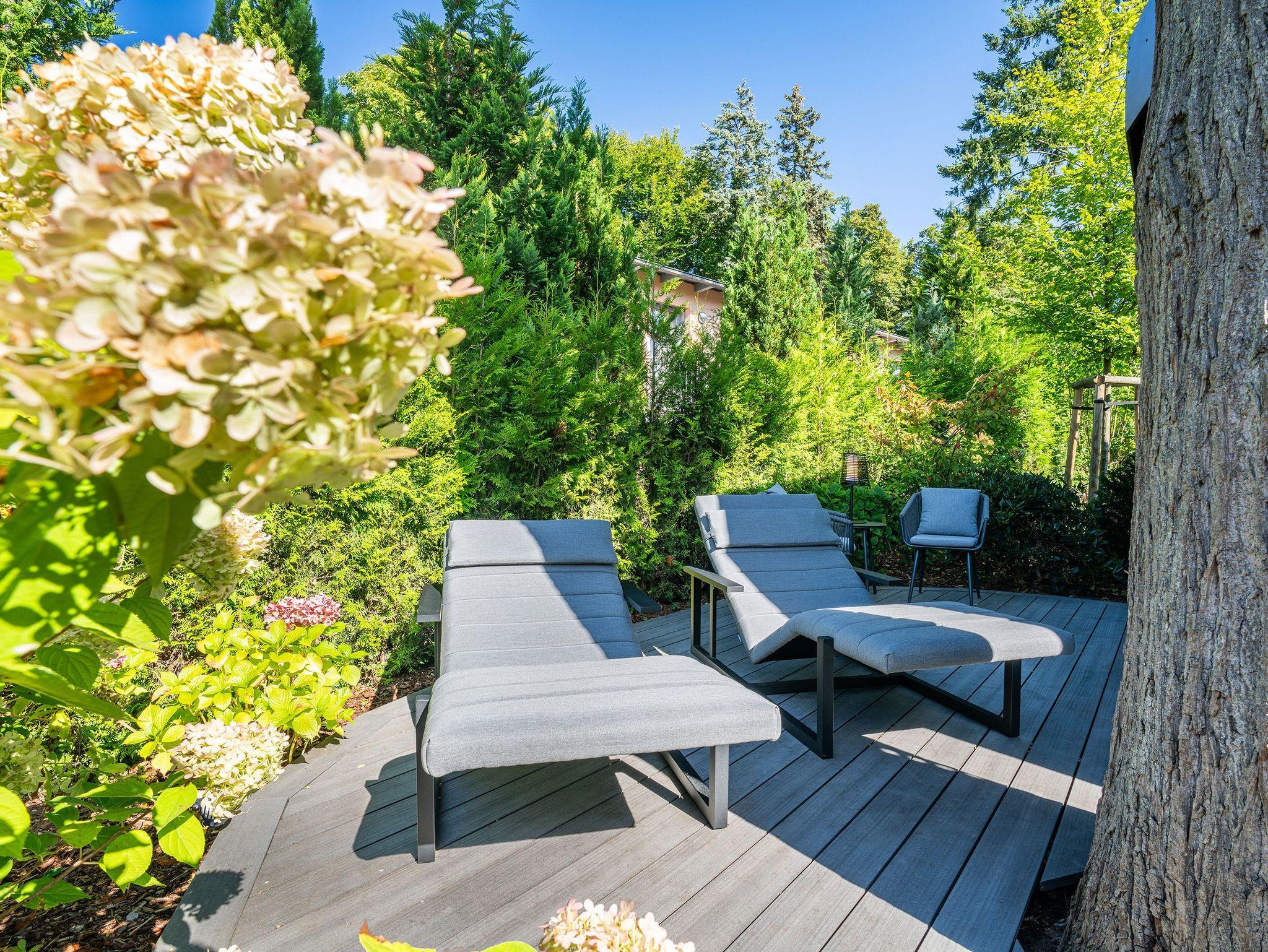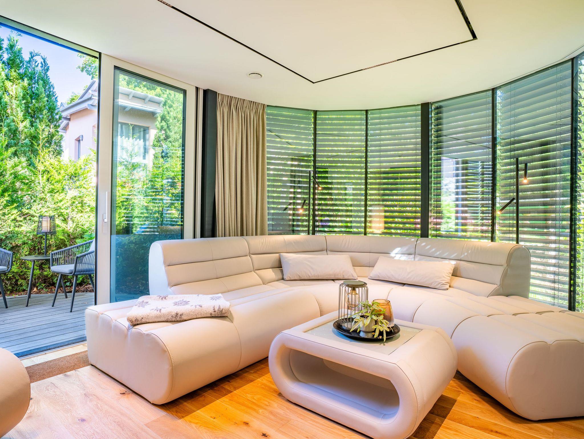 Erdgeschoss: Wohnbereich mit Flat-TV, Gaskamin, großzügigen Fensterflächen, individuell einstellbare Verschattungsanlage und direktem Zugang zur möblierten Terrasse mit zwei Relaxliegen und kleiner Sitzecke ? perfekt für entspannte Sonnenstunden. Hochwertige, separate Küche mit Esstisch für sechs Personen, Smart-TV, Induktionskochfeld, Kombibackofen mit Mikrowelle, Wärmeschublade mit Tellerwärmer, Side-by-Side-Kühlschrank mit großem Gefrierschrank und Wasser- und Eiswürfelspender, Geschirrspüler sowie Kaffeevollautomat. Vom Essbereich gelangen Sie auf eine zweite Terrasse mit großem Gartentisch, Sonnenschirm und Elektrogrill ? ideal für gesellige Grillabende. Im Erdgeschoss befindet sich zudem ein gemütliches Schlafzimmer mit Doppelbett (160 x 200 cm) und Smart-TV sowie ein modernes Badezimmer mit Dusche und WC.