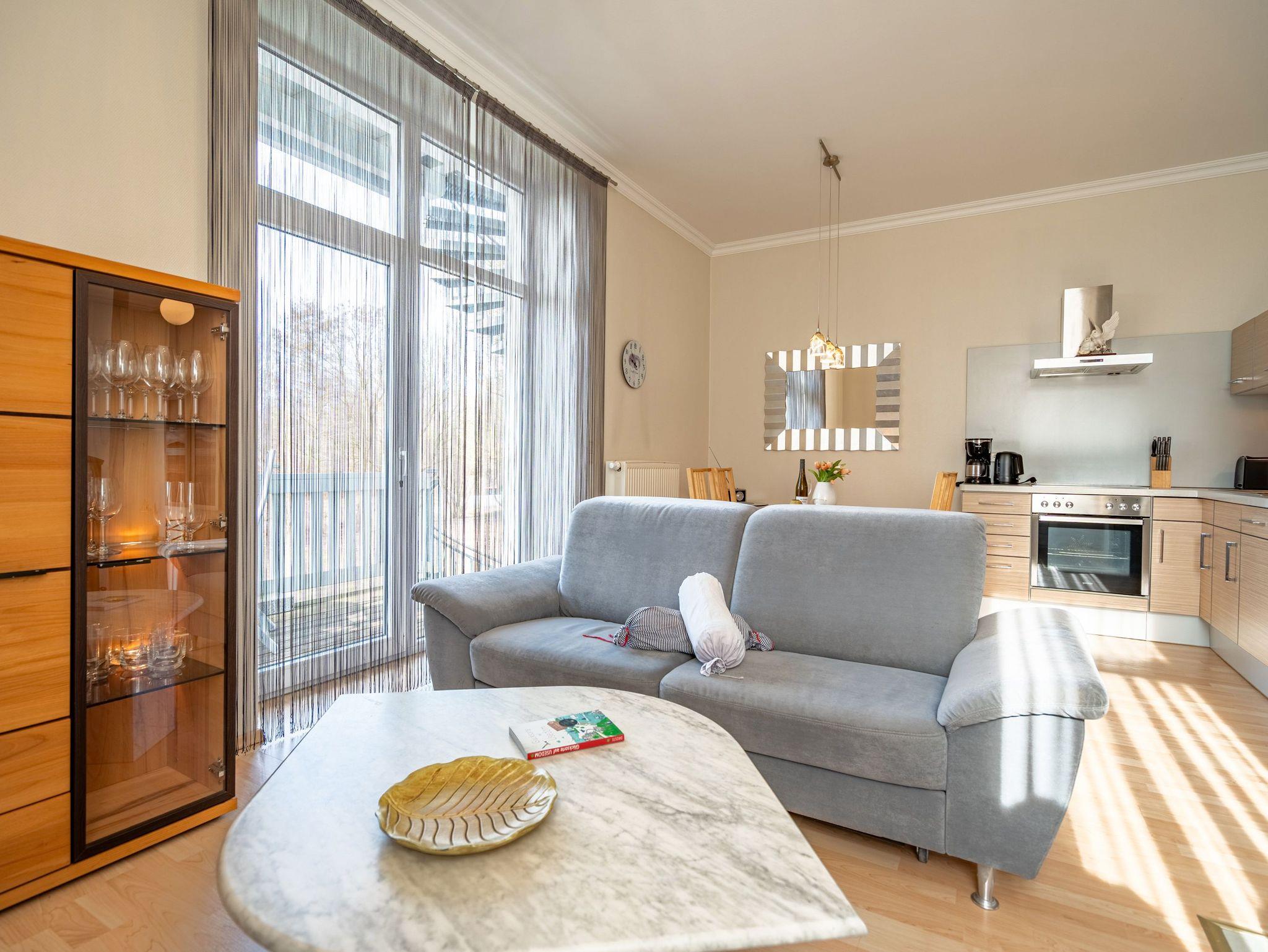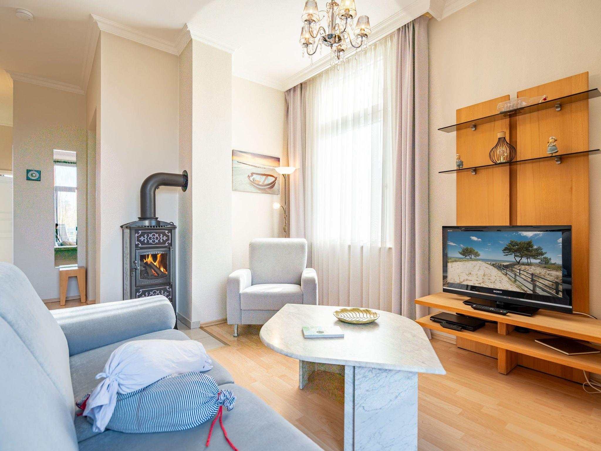 Moderne 2-Zimmer-Ferienwohnung mit Kamin und Südbalkon in Heringsdorf, nahe Strand und Promenade.