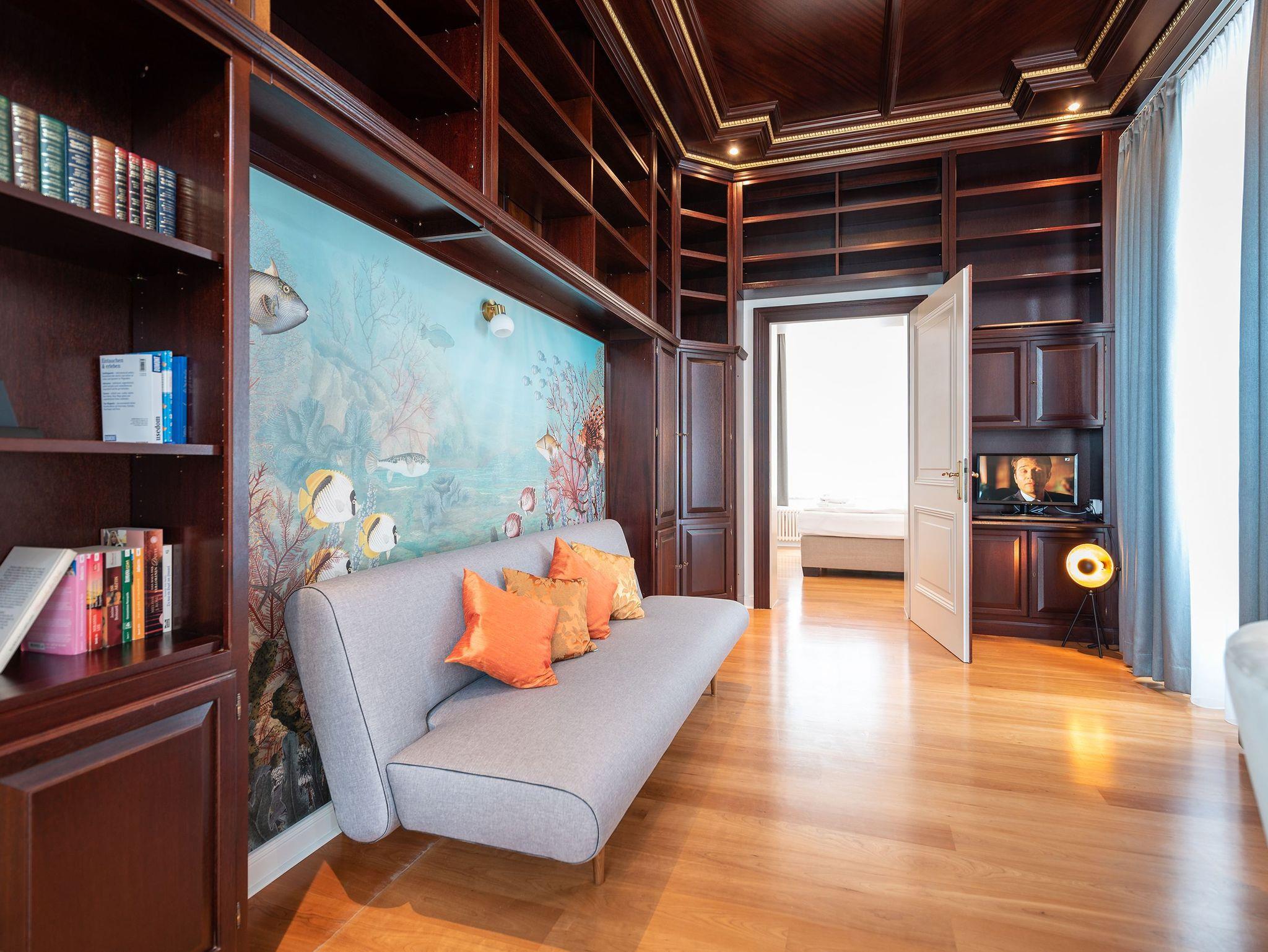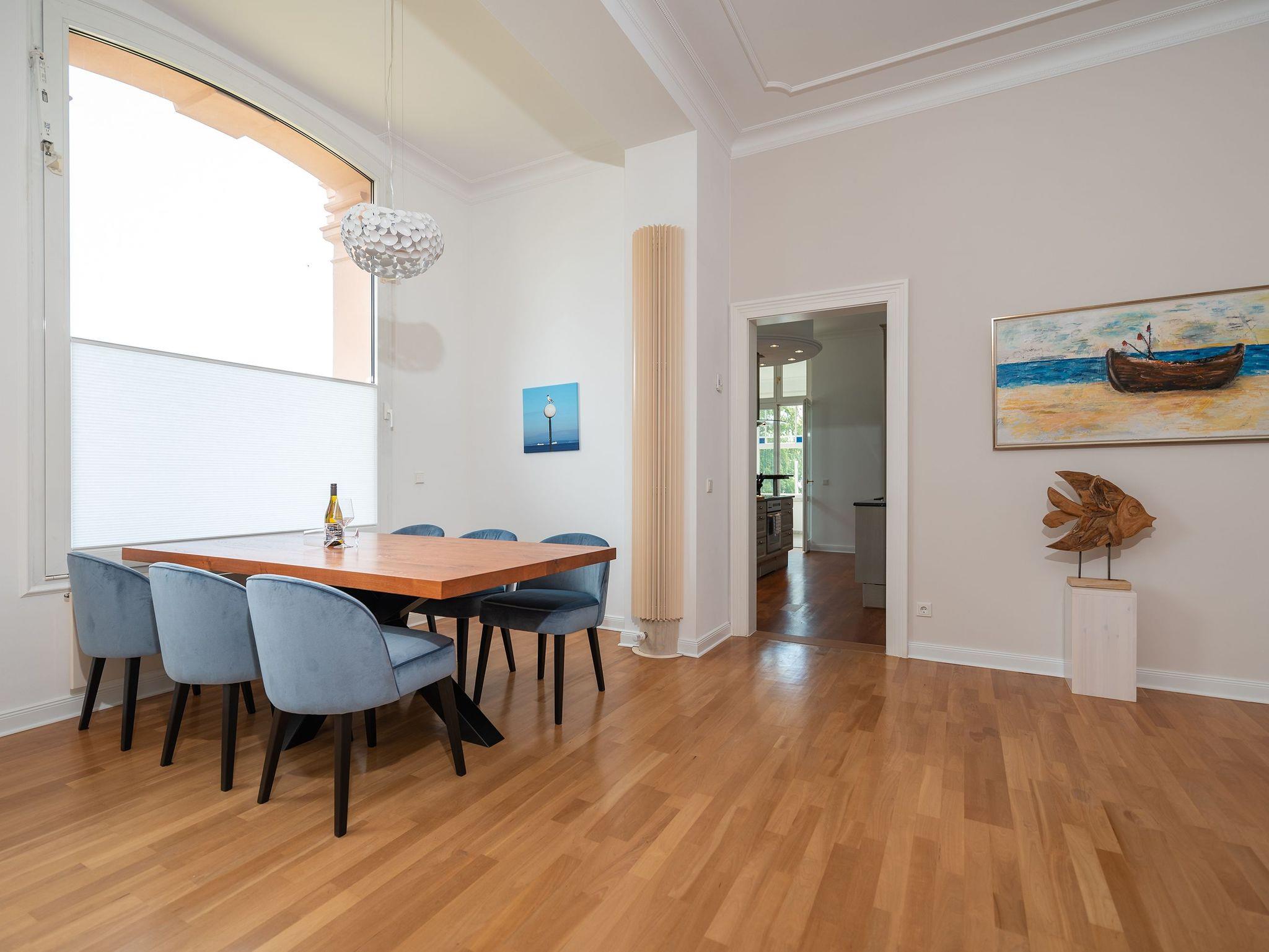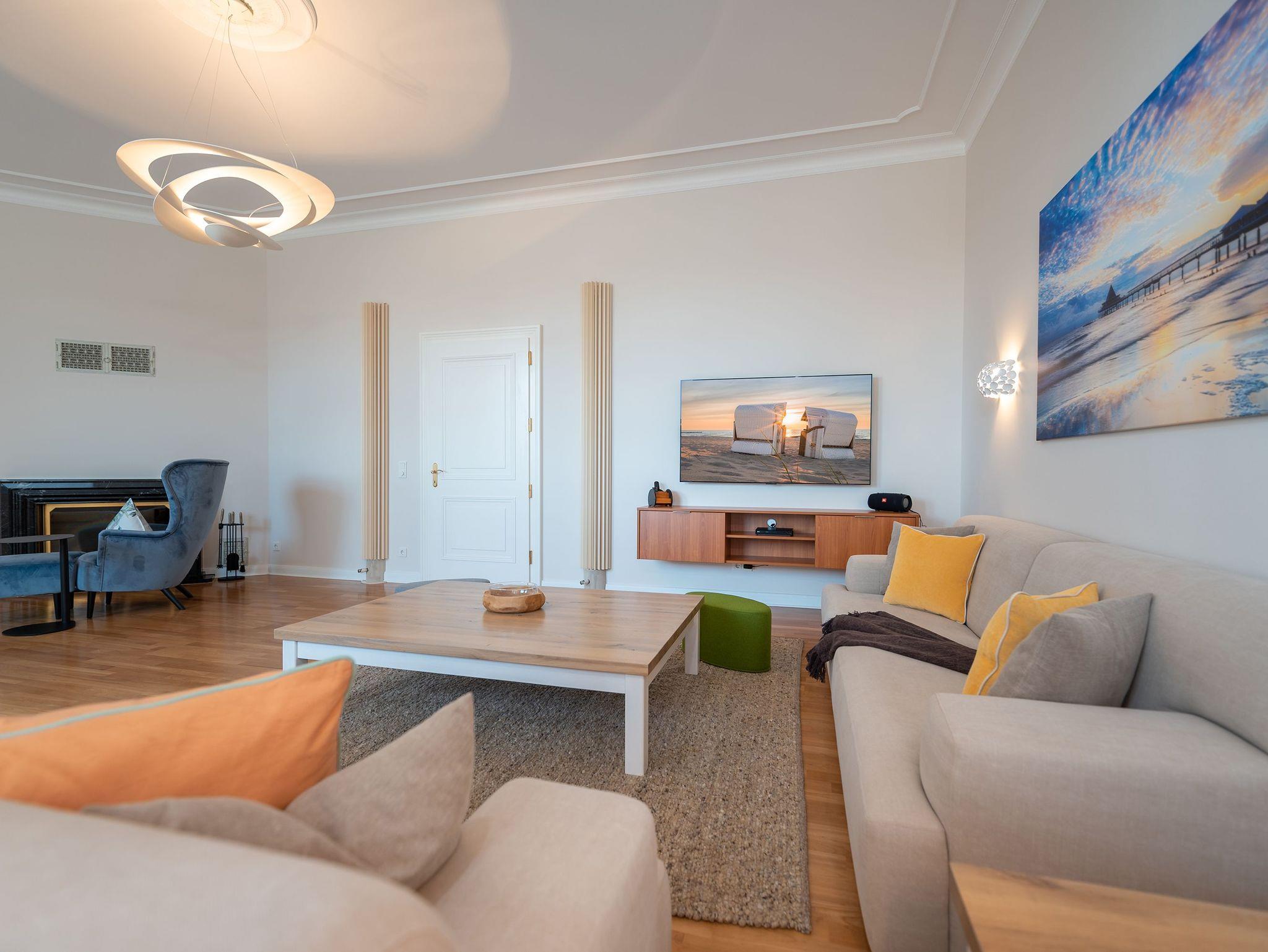 Das weitläufige Wohnzimmer empfängt seine Gäste mit einem Kamin aus schwarzem Marmor, einer gemütlichen Wohnlandschaft mit großem Flatscreen-TV und einem großen Esstisch an dem bequem 6 Personen Platz finden. Das Charisma der kaiserlichen Architektur wird durch wunderschöne Stuck-Elemente, stilechte Kassetten-Türen und hochwertige Materialien auch im Inneren des Apartments weiter geführt.