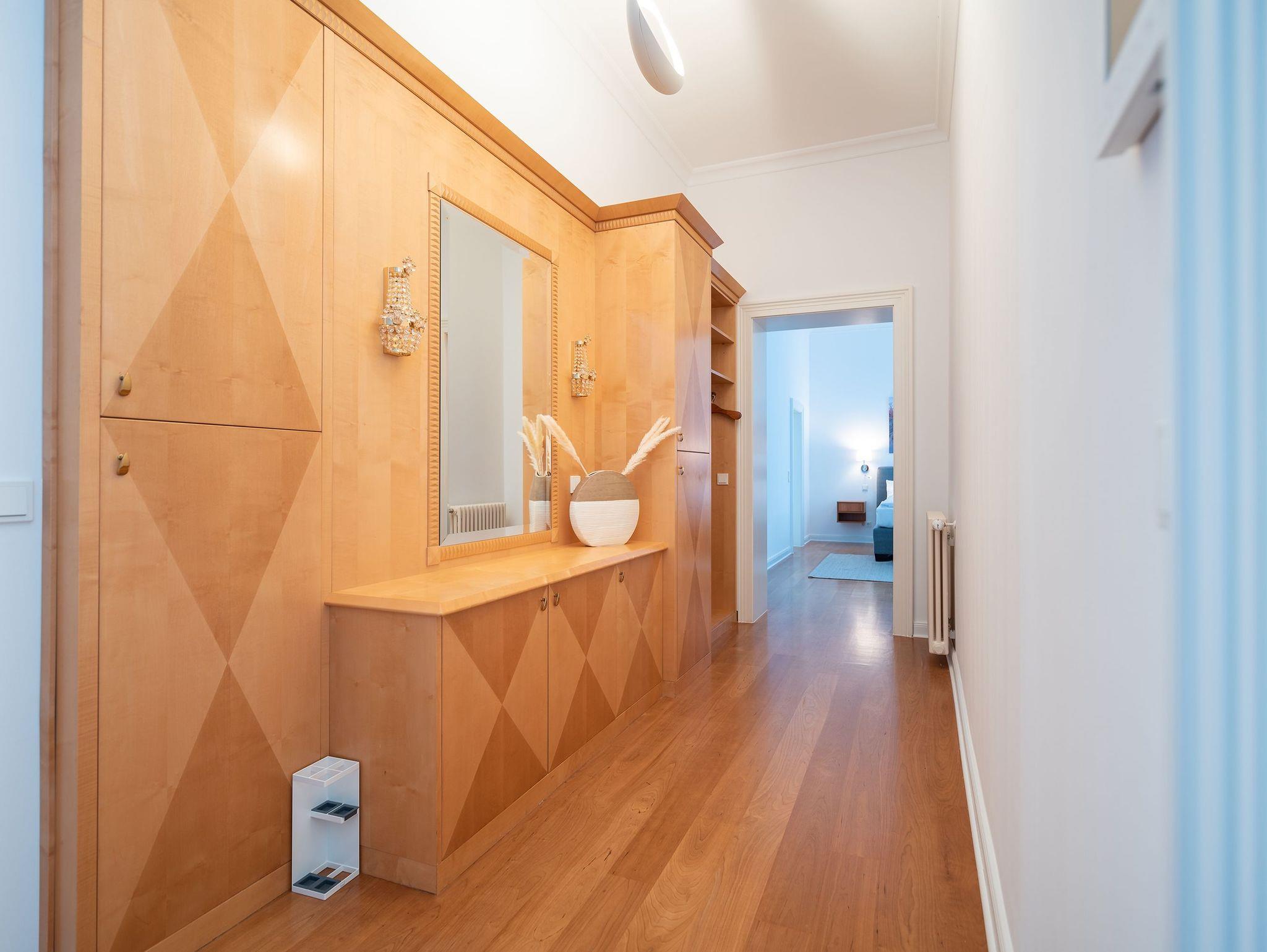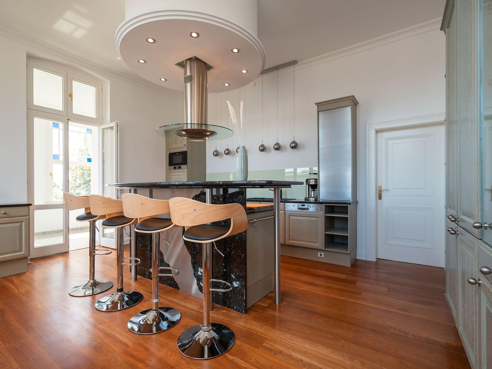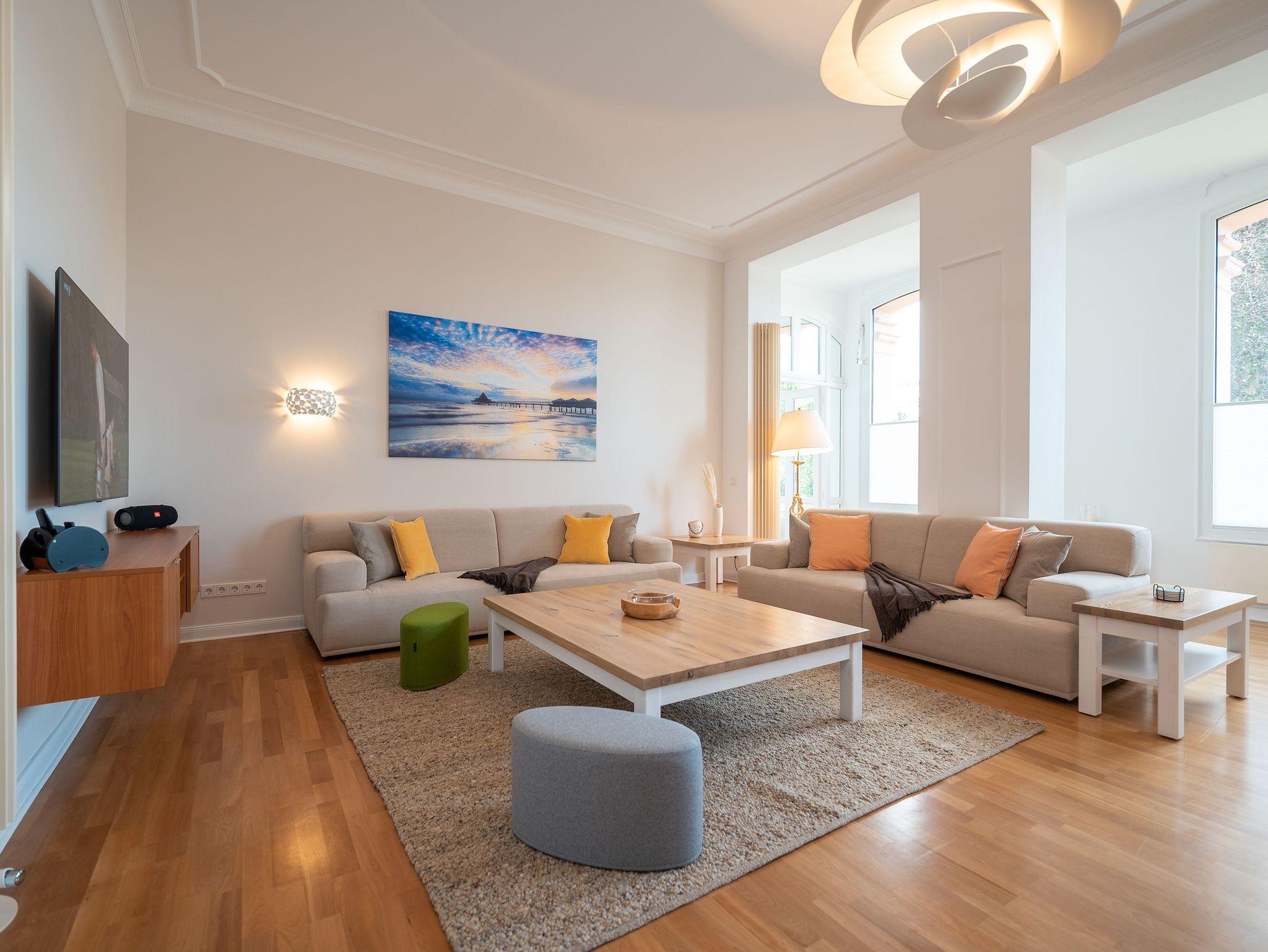 Das weitläufige Wohnzimmer empfängt seine Gäste mit einem Kamin aus schwarzem Marmor, einer gemütlichen Wohnlandschaft mit großem Flatscreen-TV und einem großen Esstisch an dem bequem 6 Personen Platz finden. Das Charisma der kaiserlichen Architektur wird durch wunderschöne Stuck-Elemente, stilechte Kassetten-Türen und hochwertige Materialien auch im Inneren des Apartments weiter geführt.