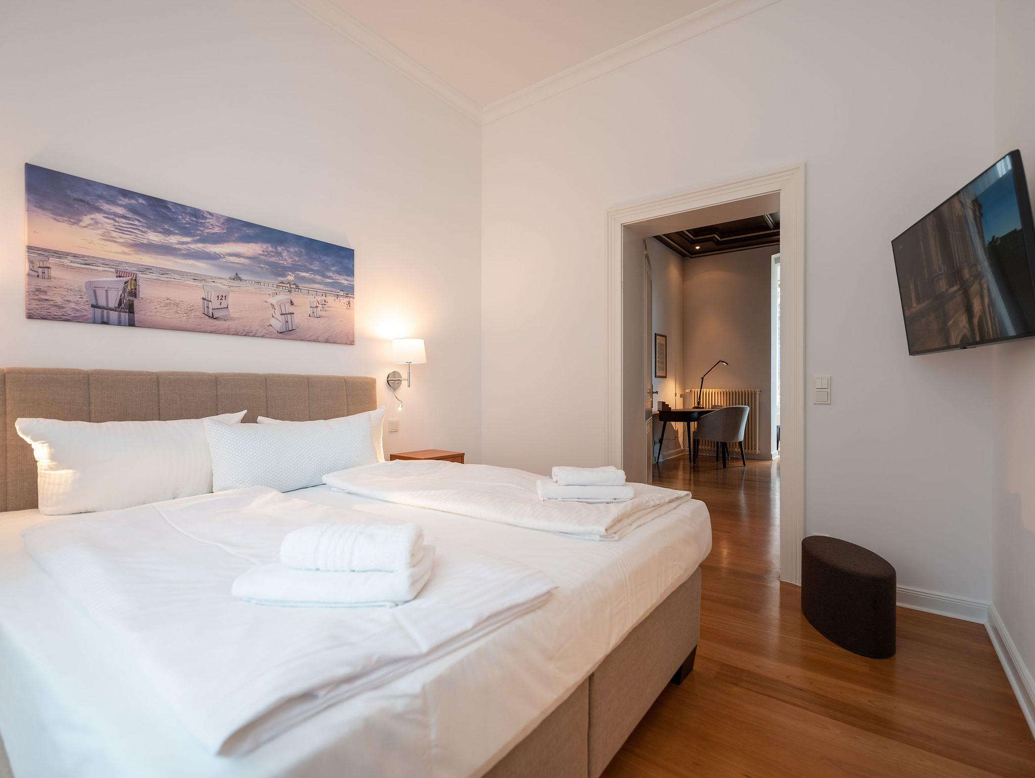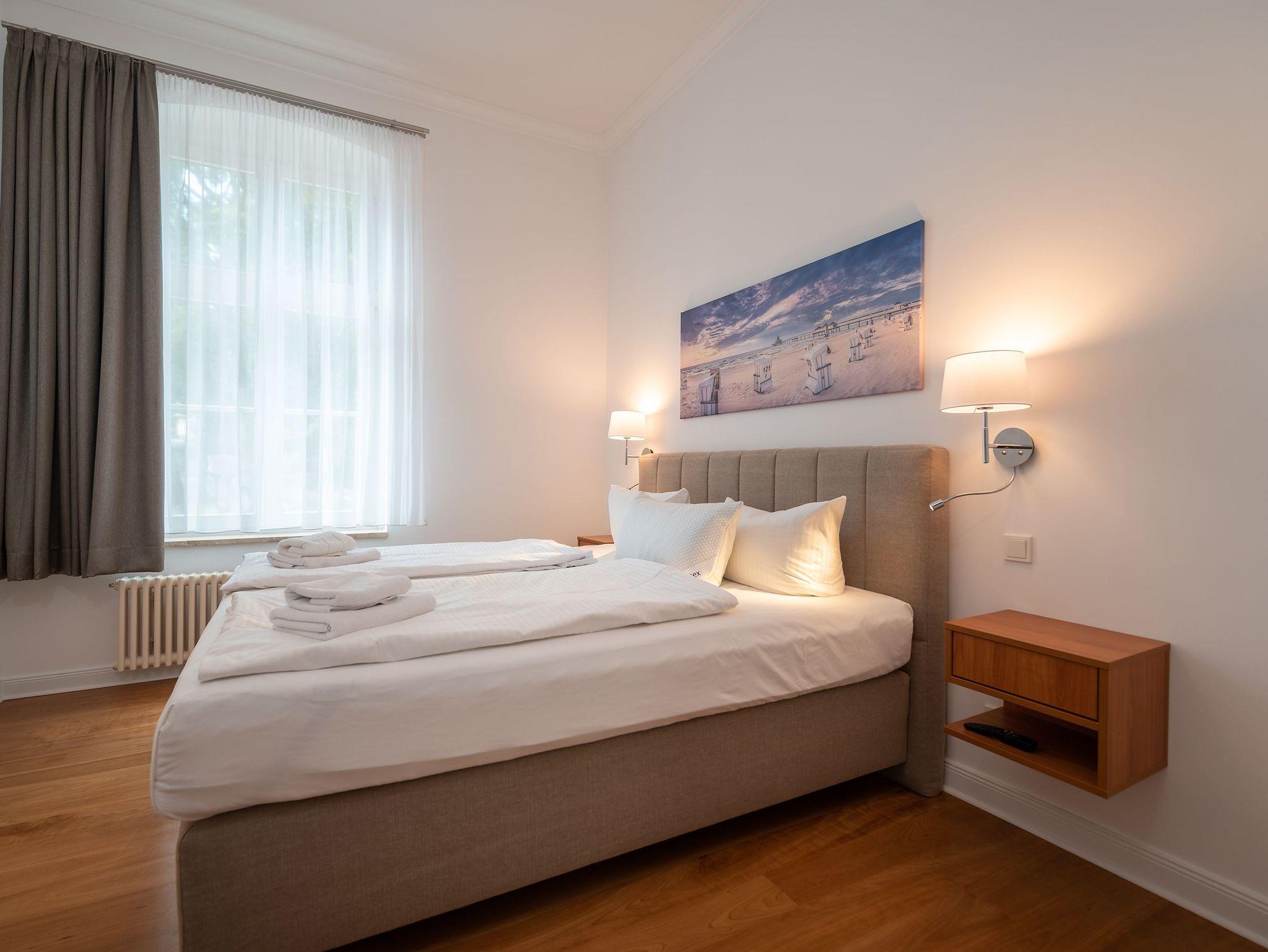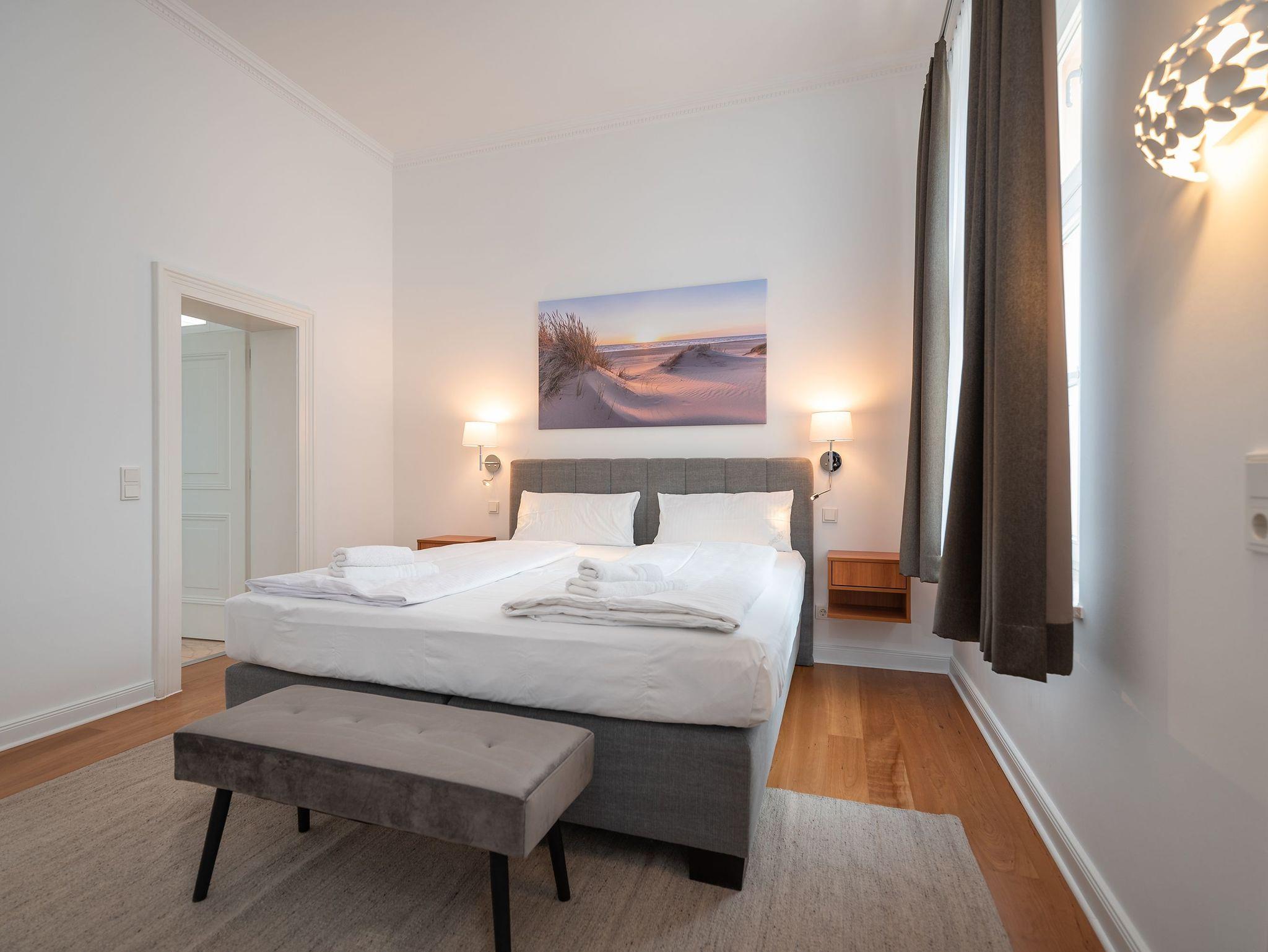 Das Appartment verfügt über zwei Schlafzimmer und ist für eine Belegung von 4 Personen geeignet. (+1 Aufbettung auf dem Schlafsofa für Kind max.14 J.). Der Master-Bedroom hat nicht nur ein komfortables Boxspringbett und einen wandmontierten Flatscreen-TV, sondern auch einen eigenen Ankleideraum mit eleganten Schrankeinbauten sowie ein Badezimmer en Suite. Das Badezimmer sorgt mit viel Platz, einem Doppelwaschtisch und einer ausladenden, begehbaren Dusche für echtes Wellness-Gefühl.
