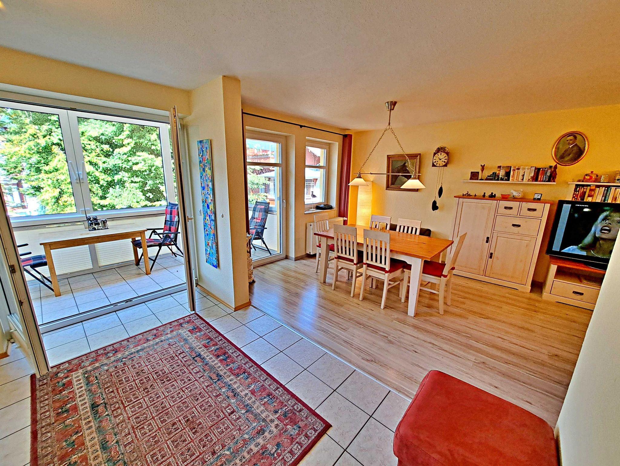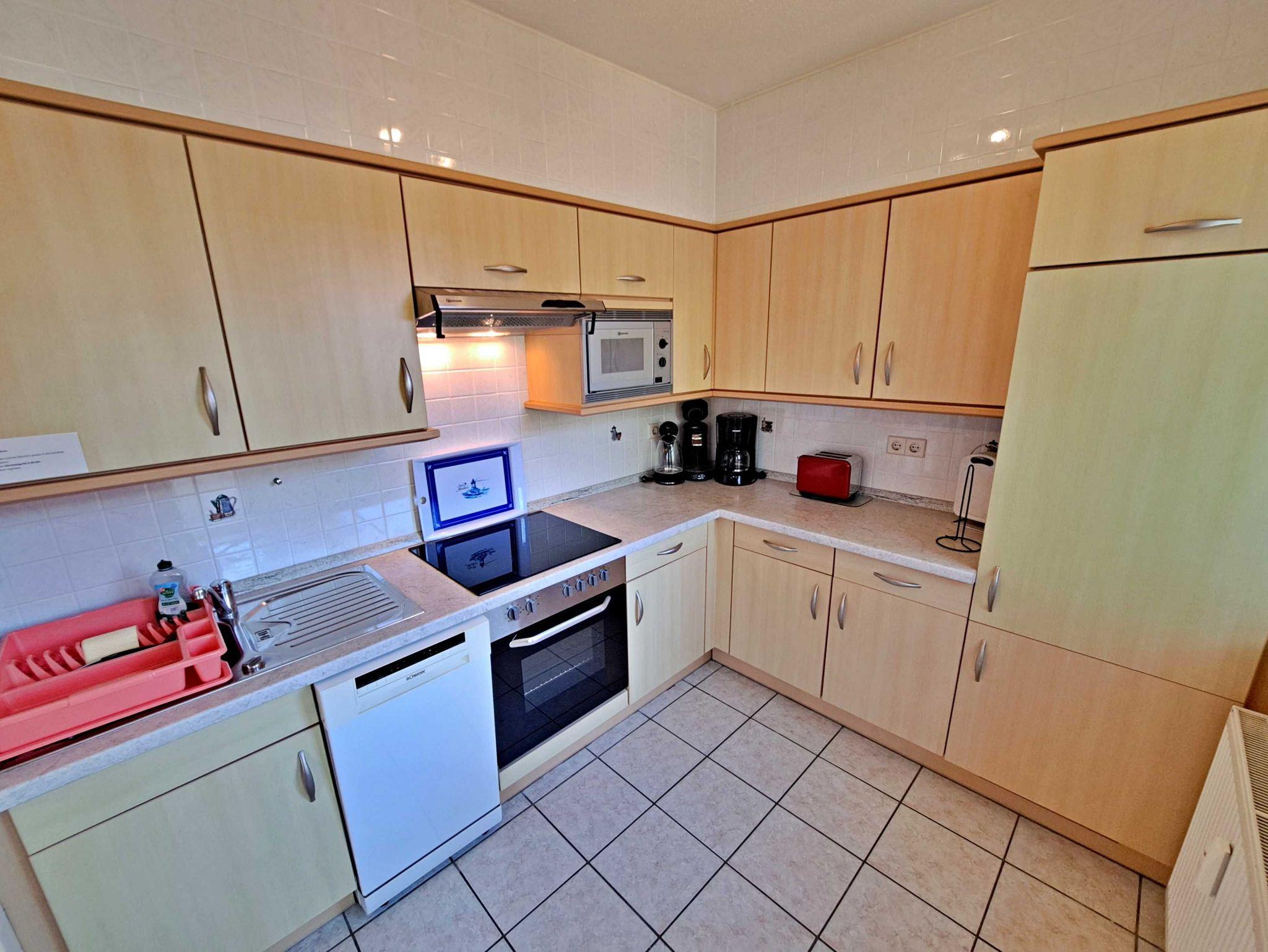 Charmant, freundlich und komfortabel - Diese einladende 3-Raum-Ferienwohnung im Haus Karavelle erstreckt sich über zwei Etagen im 2. Obergeschoss und bietet Ihnen alles, was Sie für einen entspannten Aufenthalt benötigen. Beim Betreten der Wohnung gelangen Sie in die großzügige Diele, die Sie in den hellen Wohnbereich mit einer modernen Küchenzeile und einem Esstisch für bis zu sechs Personen führt. Die Küche ist bestens ausgestattet mit einem 4-Plattenherd, Backofen, Spülmaschine, Kühlschrank, Mikrowelle und Geschirr - hier können Sie Ihre kulinarischen Fähigkeiten entfalten! Im gemütlichen Wohnzimmer erwartet Sie eine bequeme Eckcouch, ein Flat-TV und ein CD-Player - ideal für entspannte Abende. Der angrenzende Wintergarten lädt dazu ein, das Frühstück in aller Ruhe zu genießen oder den Tag bei einem Glas Wein ausklingen zu lassen, während Sie die eingeschränkte Sicht auf das Meer bewundern. Das Badezimmer ist mit einer großzügigen Dusche und WC ausgestattet. Im Obergeschoss finden Sie zwei separate Schlafzimmer: eines mit einem Doppelbett und einem zweiten TV sowie ein weiteres Schlafzimmer mit einem Doppel- und einem Einzelbett. Ein Gäste-WC, das von beiden Schlafzimmern zugänglich ist, sorgt für zusätzlichen Komfort. Auf Anfrage wird gerne ein Kinderreisebett und einen Hochstuhl kostenfrei zur Verfügung gestellt. Ein Pkw-Stellplatz auf dem umzäunten Grundstück steht Ihnen ebenfalls zur Verfügung. Für Ihre Wäsche können Sie gegen Entgelt eine Waschmaschine und einen Wäschetrockner im Objekt nutzen. Die Erstausstattung Bettwäsche und Handtücher kann bei der Buchung der Ferienwohnung für nur 17,50 € pro Person hinzugebucht werden. WLAN-Zugang ist für ein Gerät kostenfrei, für jedes weitere Gerät werden 10 € pro Woche berechnet.