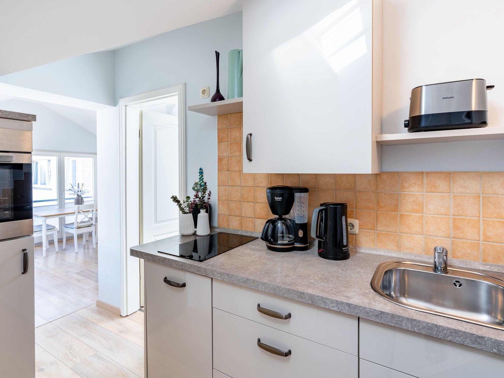 Treten Sie ein, hinter der Eingangstür nur wenige Stufen hinauf sind Sie in Ihrem Urlaubsquartier und in Ihrem wohlverdienten Urlaub angekommen. Bis zu drei Personen können in dem modernen Appartement gemeinsame Urlaubstage verbringen. Der gemütliche und helle Wohnbereich mit bequemer Couch und Flat-TV, bodentiefen Fenstern und Essplatz lädt zu geselligen und unterhaltsamen Stunden ein. Auf dem nach Nordwesten ausgerichteten Balkon können Sie einen erlebnisreichen Urlaubstag bei einem Glas Wein ausklingen lassen. In der offenen gestalteten Küche (Backofen, Geschirrspüler, Kühlschrank, Kaffeemaschine, Wasserkocher, Toaster) können Sie sich all Ihre Lieblingsspeisen zubereiten und anschließend den Geschirrspüler bequem den Abwasch erledigen lassen.