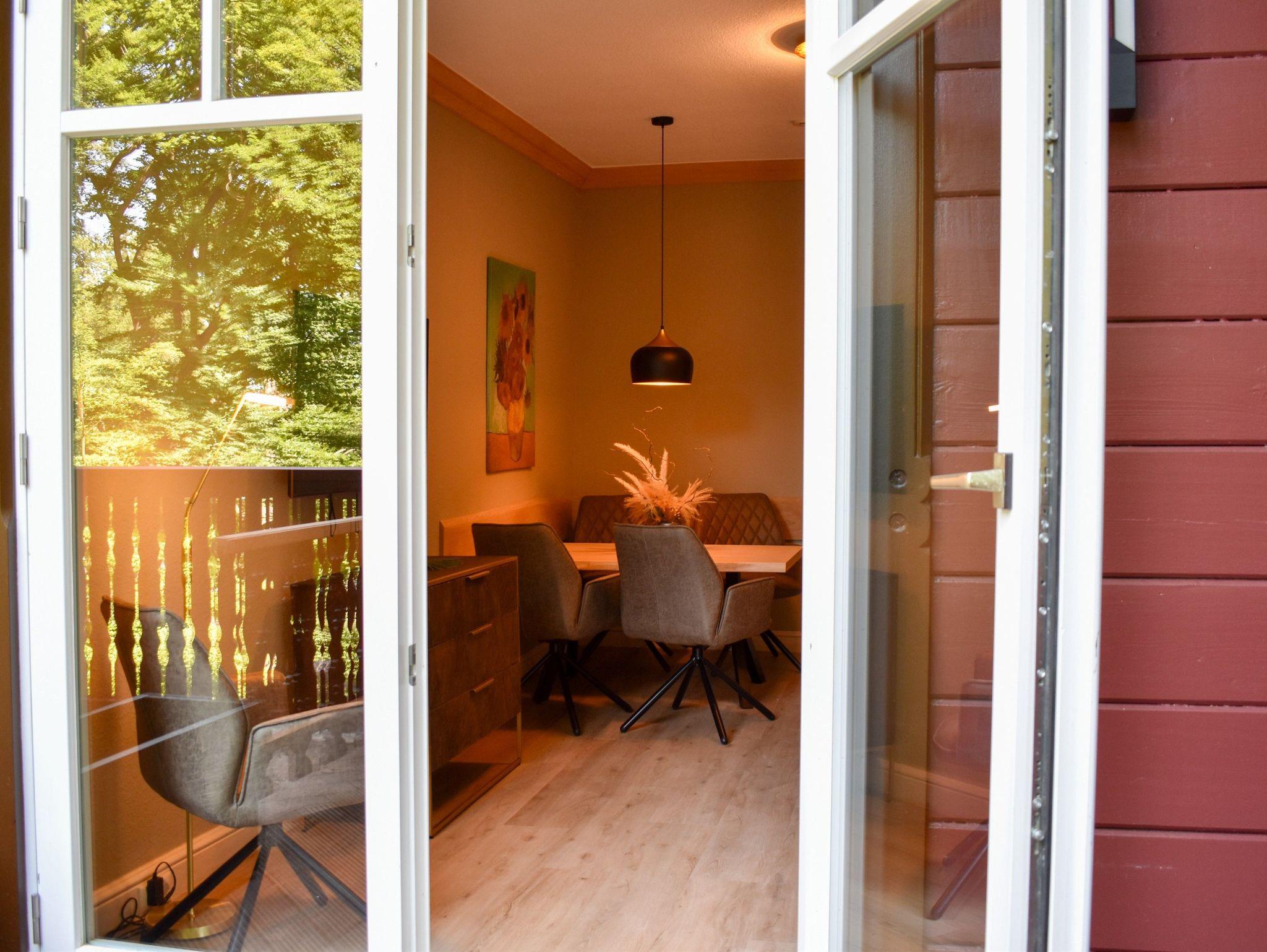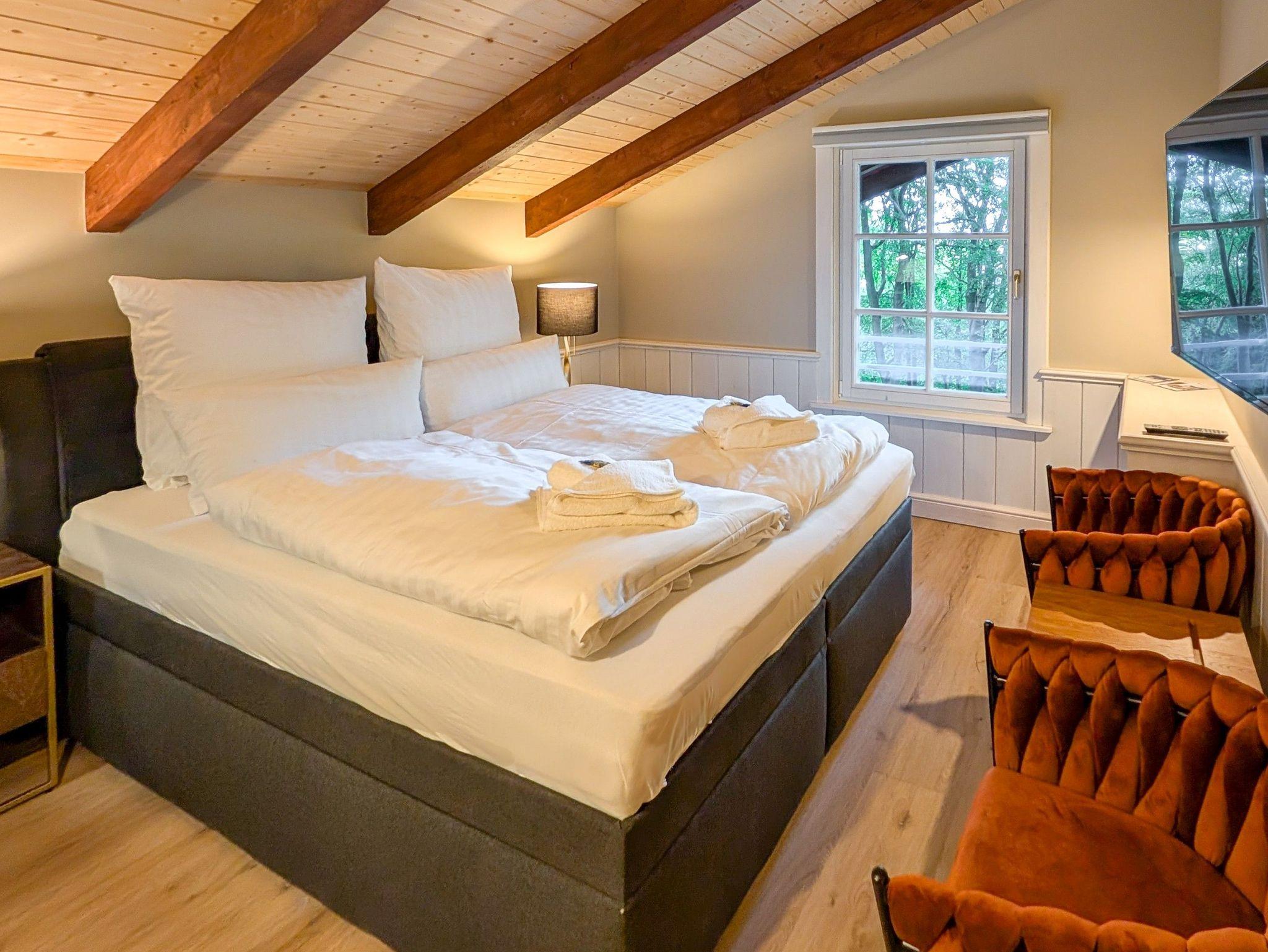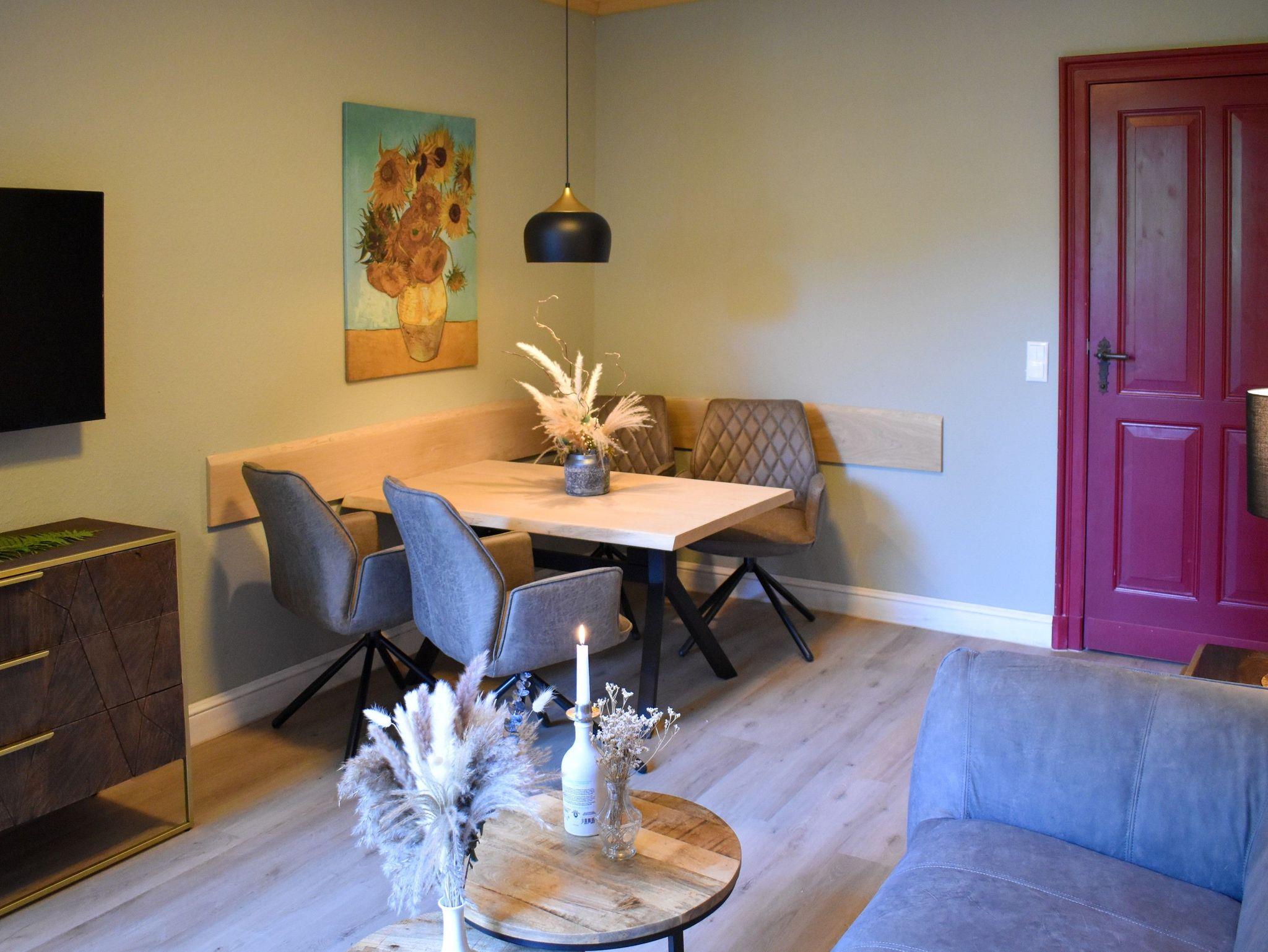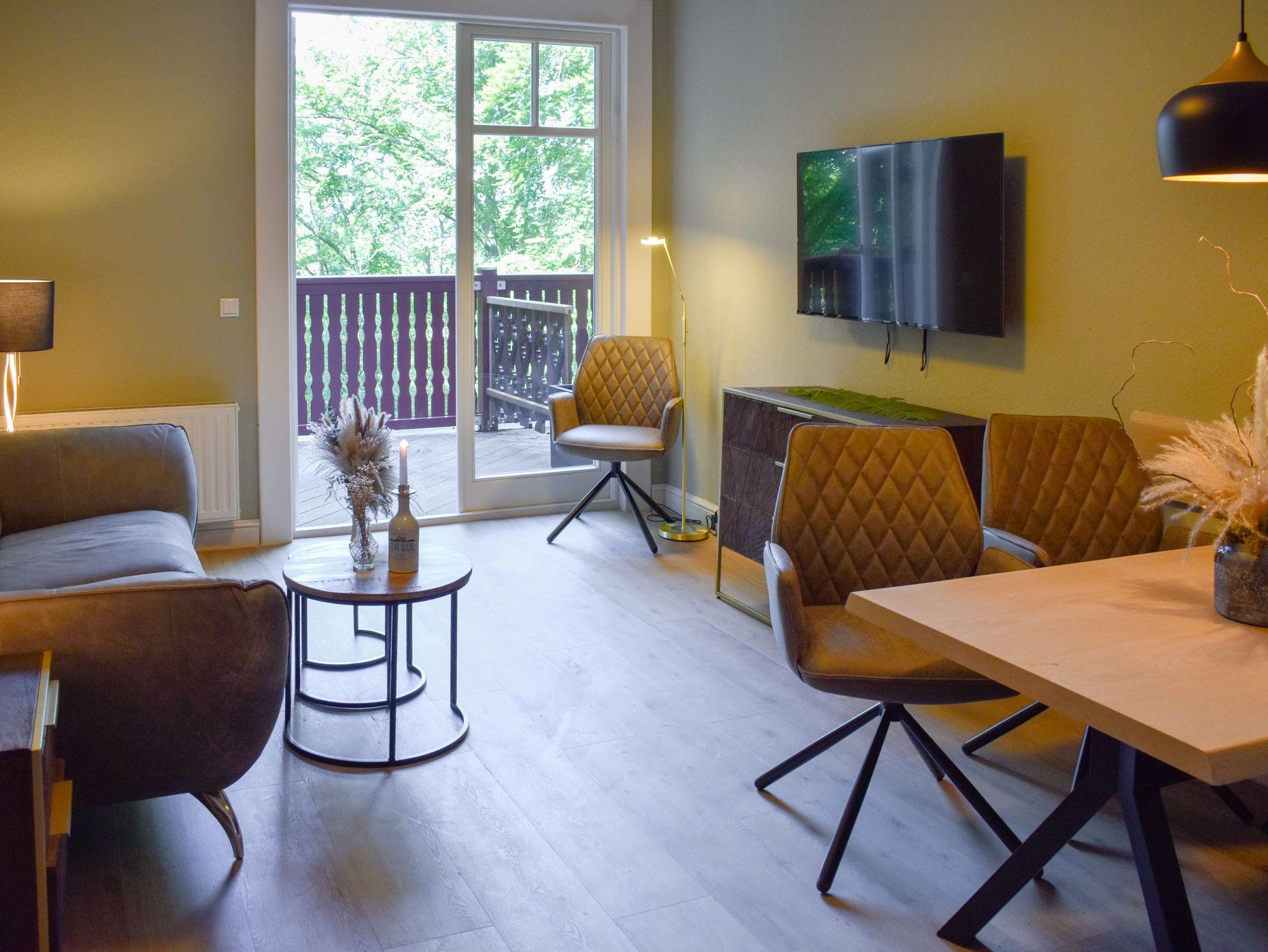 Eine Obergeschoss Wohnung (Größe folgt) mit 2 Schlafzimmern für 4 Personen; Ein Schlafzimmer mit einer Bettengröße von 160er mit einem begehbaren Kleiderschrank (Blick Hauptstaße/Wald); Ein Schlafzimmer mit einer Bettengröße von 180er mit einem Balkon (Blick in den Wald); Bad mit Dusche, WC und 2 Waschbecken; Küche auf dem Flur; Wohnzimmer mit 1 Sofa, 2 Sessel, Esstisch, 4 Stühlen und Balkon; Der Balkon kann von Schlafzimmer sowie Wohnzimmer betreten werden