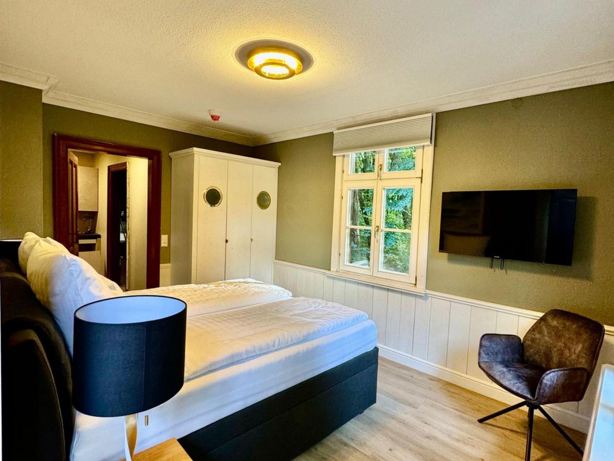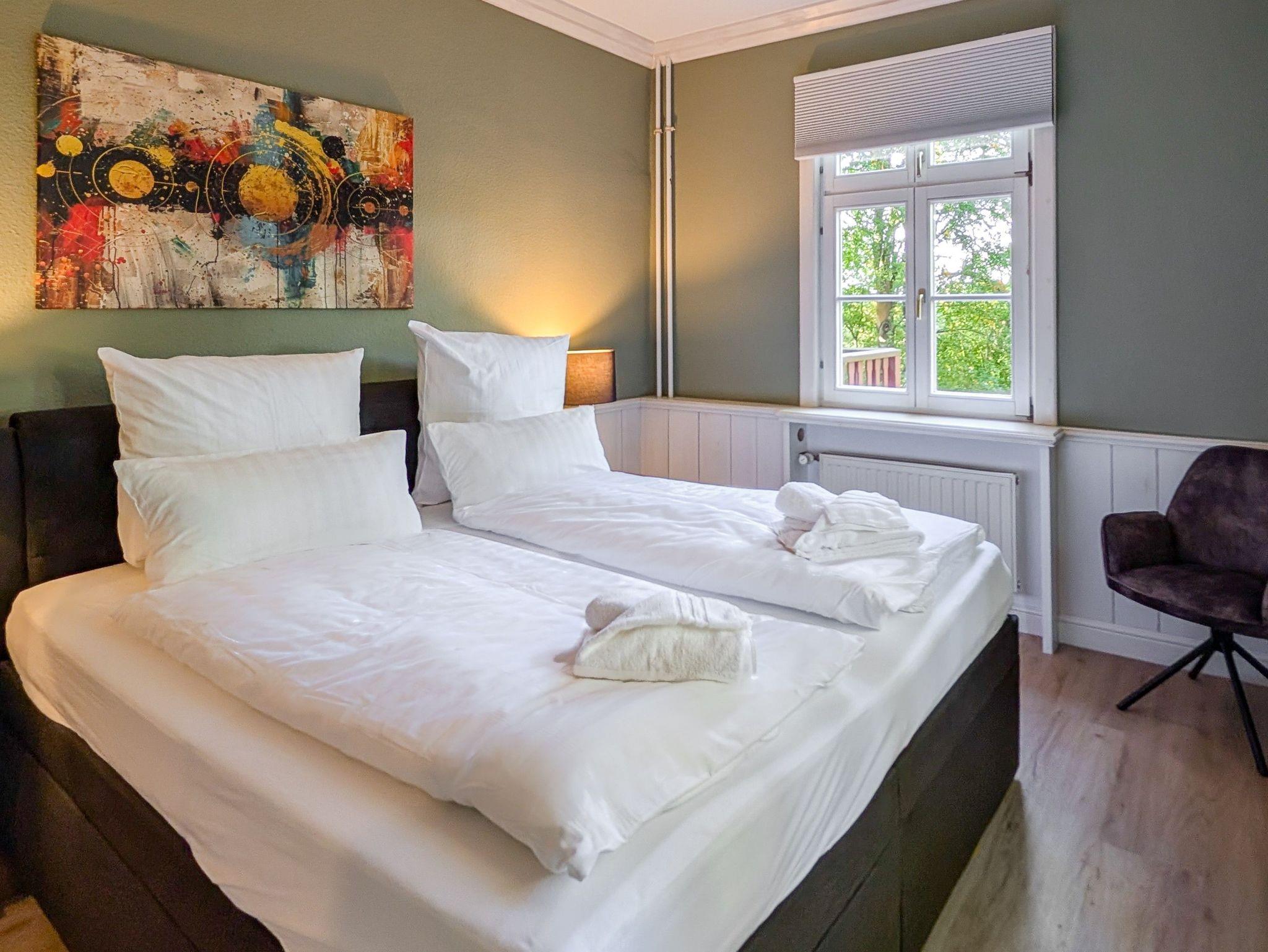 Eine Erdgeschoss Wohnung 37m² mit 2 Schlafzimmern für 4 Personen; Ein Schlafzimmer mit einer Bettengröße von 160er (Blick Hauptstaße/Lindemannstraße/Wald); Ein Schlafzimmer mit einer Bettengröße von 180er (Blick in den Wald); Bad mit Dusche, WC und 2 Waschbecken; Küche auf dem Flur