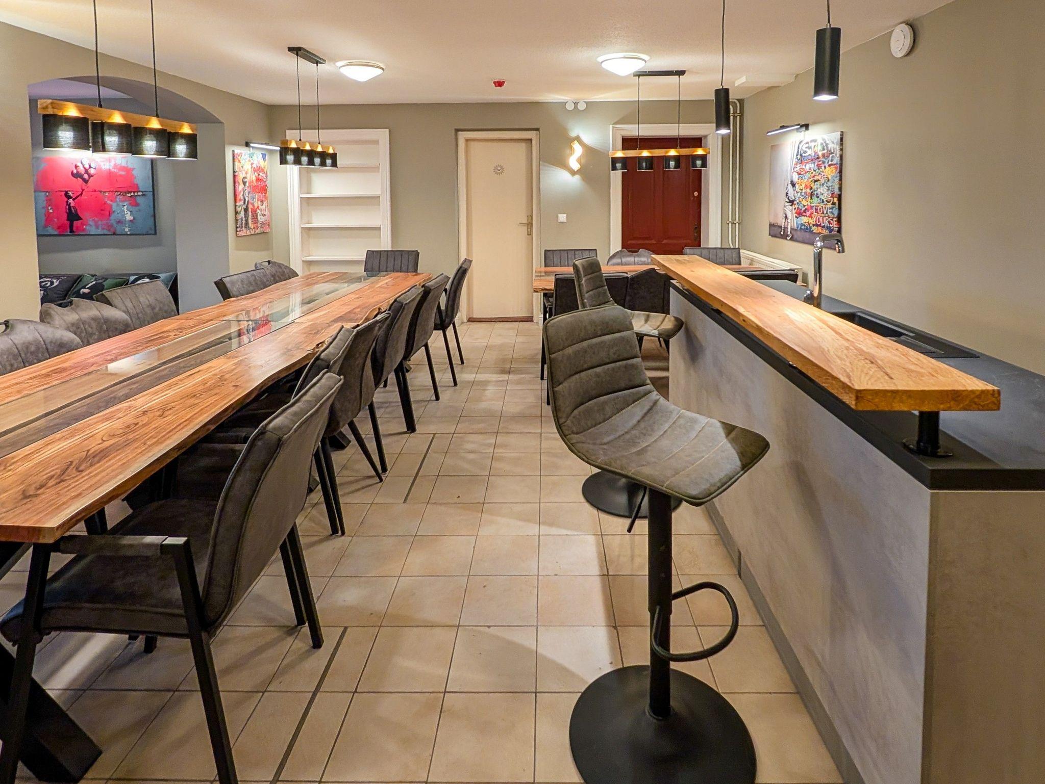 Eine Raumgröße von 54m² + 14m² Balkon; Großer Tisch mit 12 Stühlen;2 Sofas & Sesseln; Echter Kamin mit Holz zum Heizen; Toilette auf dem Flur