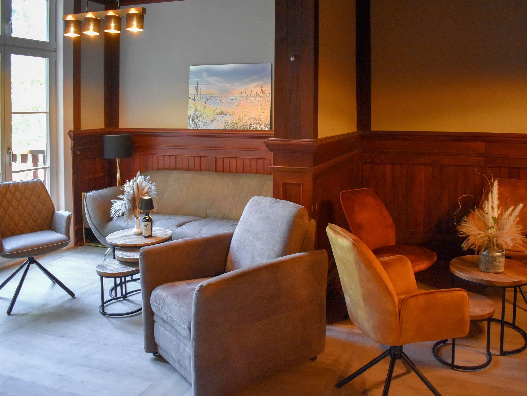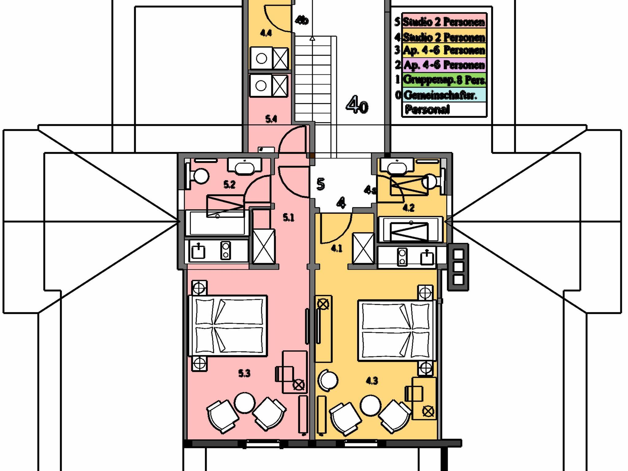 Kleine Wohnung 18 m² mit 1 Schlafzimmer für 2 Personen (Blick Kavaliersweg/Wald); Bad mit Dusche; Großer Essbereich 50 m² mit Tisch für 14 Personen, Tisch für 6 Personen, Bar mit 5 Barhockern, 7 Sesseln; Terrasse mit 2 Tischen für je 6 Personen; Küche 12 m² mit Herd, Spüle, Geschirrspüler, Kühlschrank, Anrichte