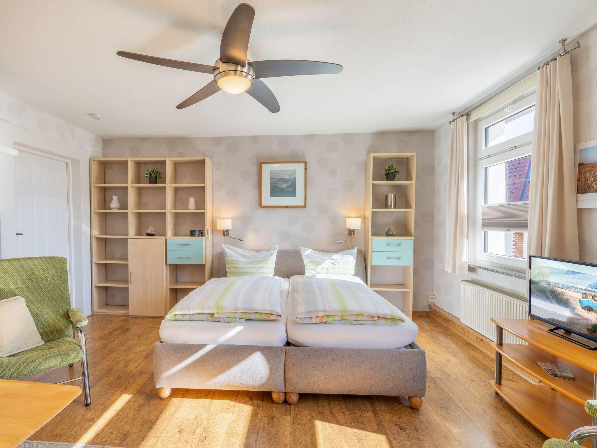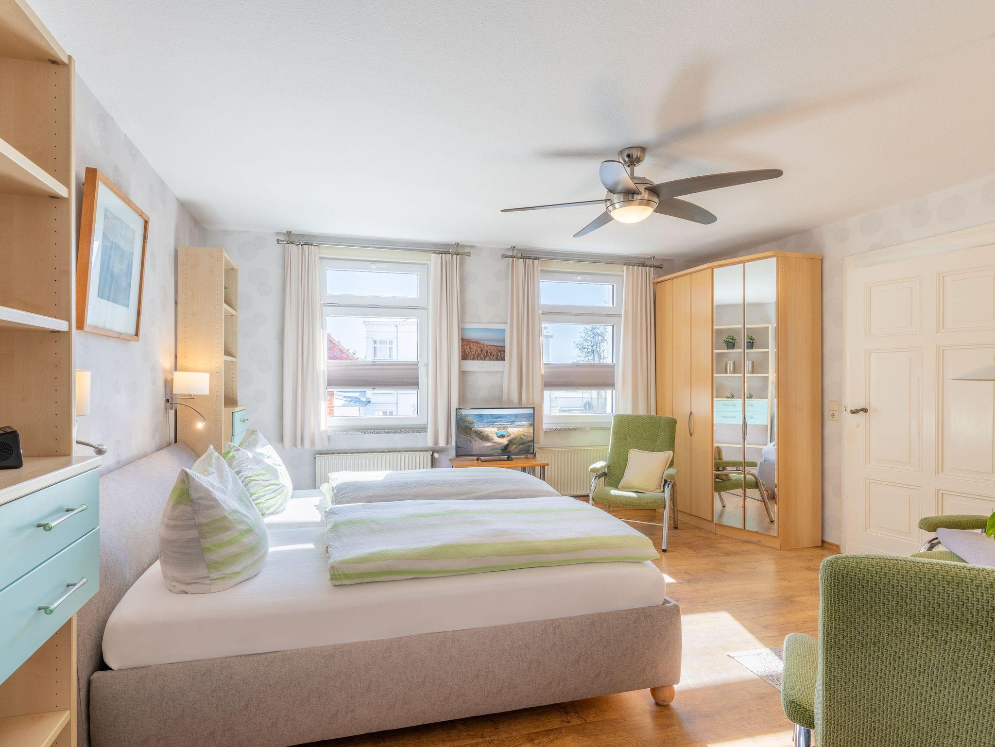 Das Ferienzimmer Nr. 5 im 1. Obergeschoss ist das ideale Urlaubsdomizil für verliebte Pärchen - oder auch für reisefreudige Singles. Der kombinierte Wohn- und Schlafbereich des 30 qm großen Ferienzimmers bietet Ihnen eine Relaxecke mit Couch, Polstersessel und Flat-TV sowie ein bequemes Doppelbett (180 x 200cm / zwei getrennte Matratzen) von dem Sie ebenfalls fernsehen können. Dank eines Ventilators haben Sie auch zur Sommerzeit eine angenehme Raumtemperatur.