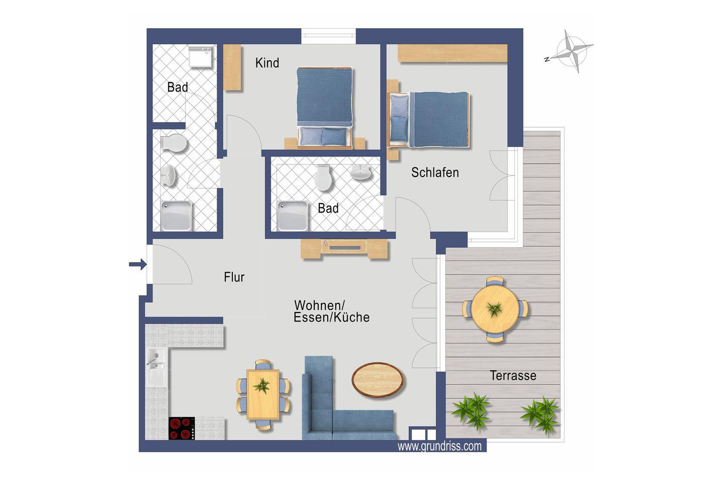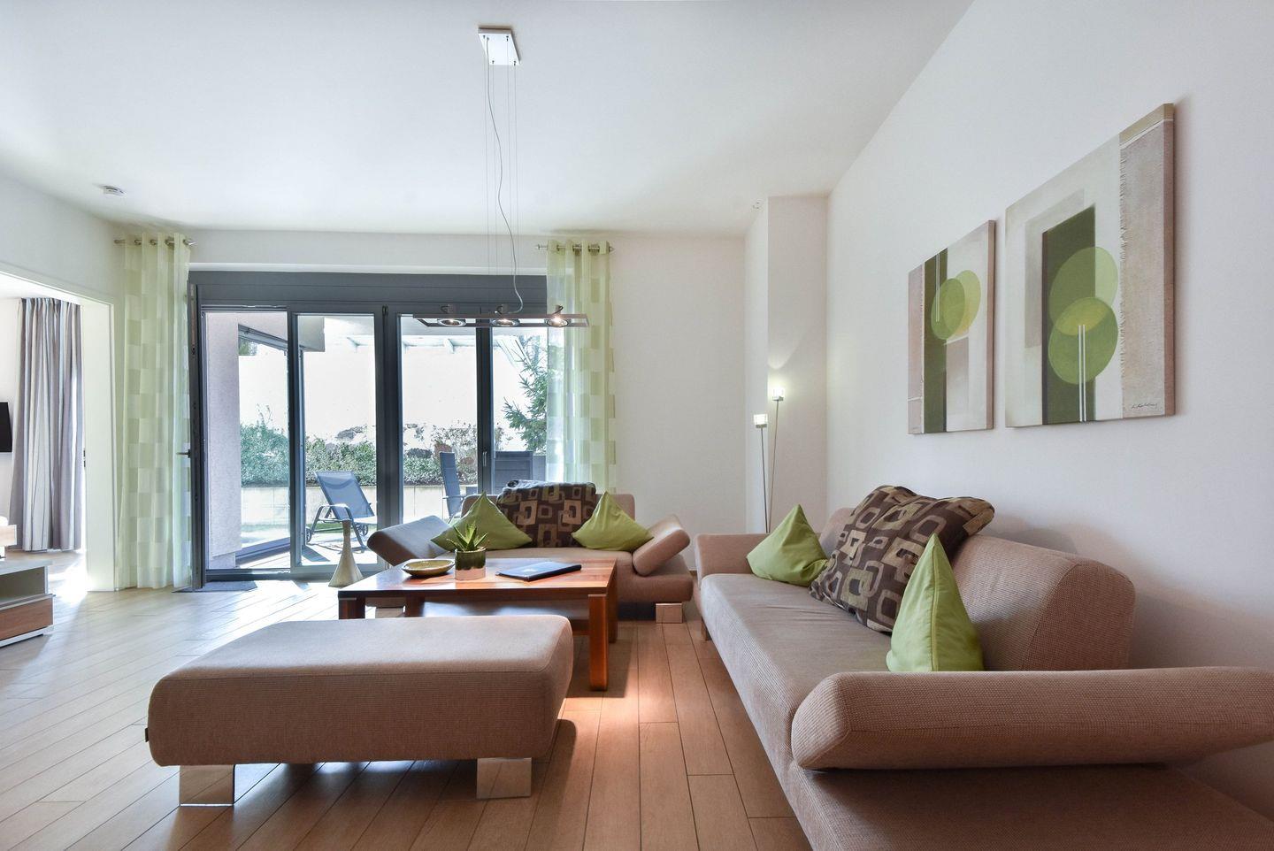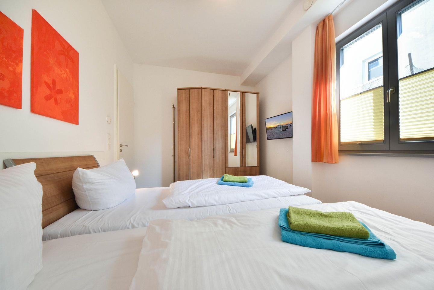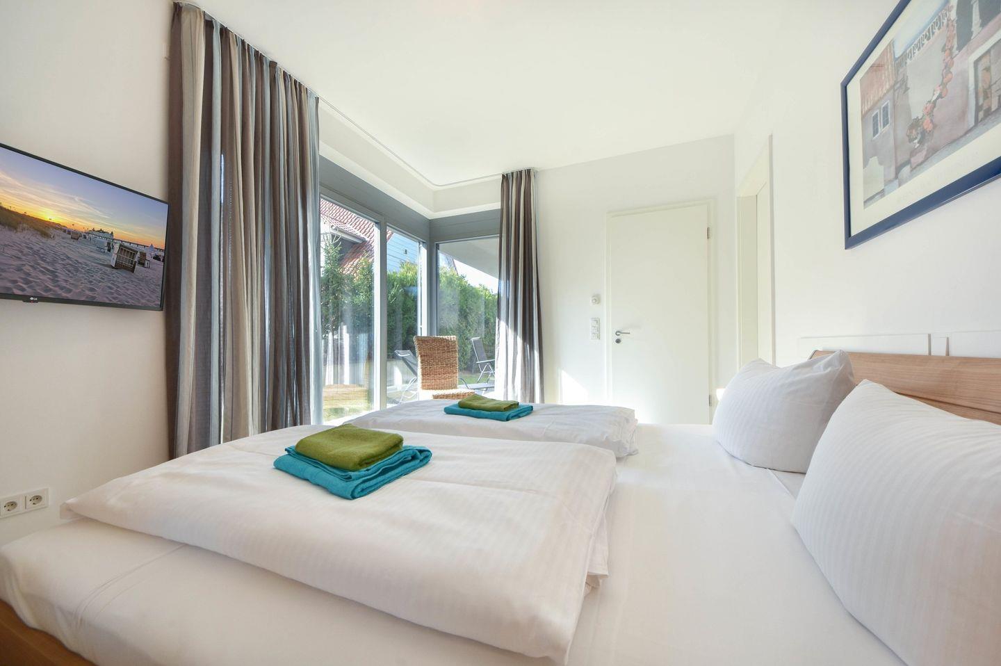 Hier erwartet Sie eine großzügige 3-Raum-Ferienwohnung mit Rasenfläche in ruhiger Lage des Kaiserbades Heringsdorf. Das Haus ist nur 200 Meter entfernt vom feinsandigen, weißen Strand entfernt und bietet ideale Voraussetzungen für Ihren Urlaub. Die Wohnung verfügt über ein großes Wohn- und Esszimmer, welches offen gestaltet ist. Es beinhaltet neben einem modernen TV-Gerät auch eine Soundbar sowie eine voll ausgestattete Küche samt Backofen, Ceranfeld und Geschirrspüler. Vom Wohnraum haben Sie Zugang zur großen Terrasse. Dank südlicher Ausrichtung ist Abendsonne garantiert. Die Fenster der gesamten Wohnung können mit elektrischen Außenjalousien abgedunkelt werden. Für Ihren Komfort sind Waschmaschine und Trockner im Hauswirtschaftsraum der Wohnung vorhanden. Beide Schlafzimmer sind mit einem Doppelbett eingerichtet und bieten ausreichend Stauraum für Ihre Garderobe. Vom größeren Schlafzimmer (Maße des Bettes 2,00m x 2,00m) ist ein weiterer Zugang zur Terrasse gewährleistet. Ein zusätzlicher Fernseher sorgt für Unterhaltung. Das angeschlossene Badezimmer ist mit einer ebenerdigen Dusche ausgestattet. Im kleineren Schlafzimmer (Maße des Bettes 1,80m x 2,00m) befindet sich ebenfalls ein eigener Fernseher. Das zweite Badezimmer verfügt über eine Dusche und bietet Zugang zum Hauswirtschaftsraum.