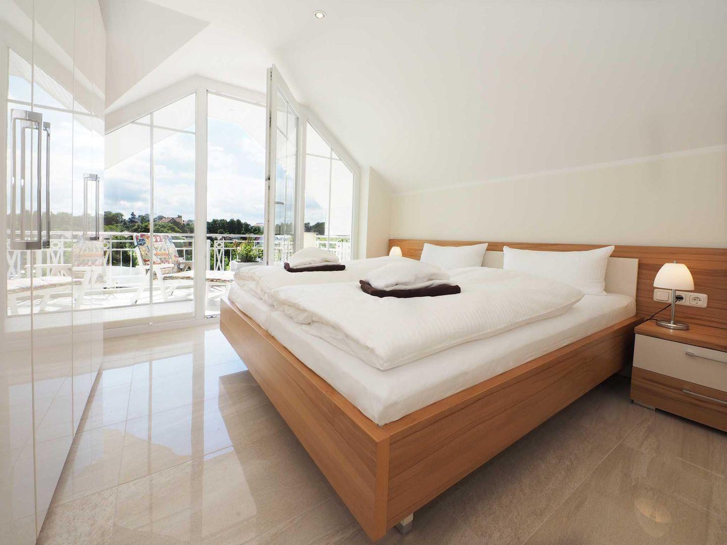 Diese in 2015 neu errichtete 4-Raum-Wohnung befindet sich im 2. Obergeschoss und erstreckt sich über eine Etage. Neben drei Schlafzimmern mit jeweils einem Doppelbett finden Sie zwei große Bäder vor, eins davon mit Dusche und Sauna (Nutzung gegen Gebühr) und ein Bad mit Badewanne und Dusche. Von einem der drei Schlafzimmer gelangen Sie auf den Balkon. Ein zweiter großer Balkon befindet sich am Wohnzimmer. Hier können Sie die Sonne genießen. Das große Wohnzimmer mit Kamin und kombinierter Küche sowie Essbereich lädt zum Verweilen ein und bietet Platz für alle Mitreisenden. Die Küche ist komplett ausgestattet mit allen technischen Dingen des Tagesbedarfs. Zur Wohnung gehören zwei PKW-Stellplätze und ein abschließbarer Fahrradabstellraum.