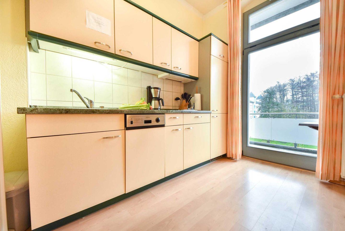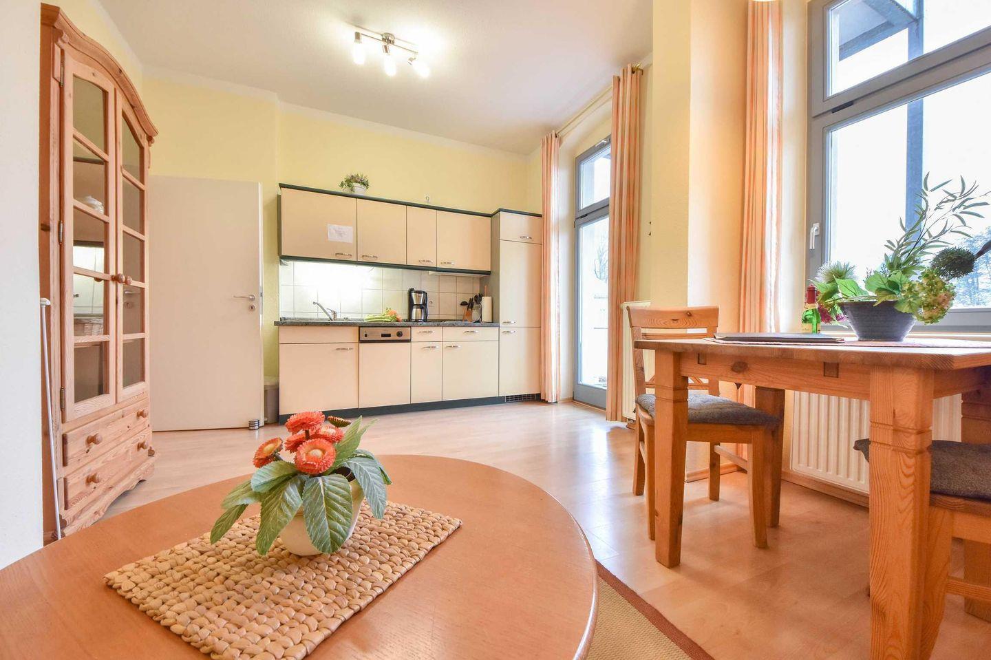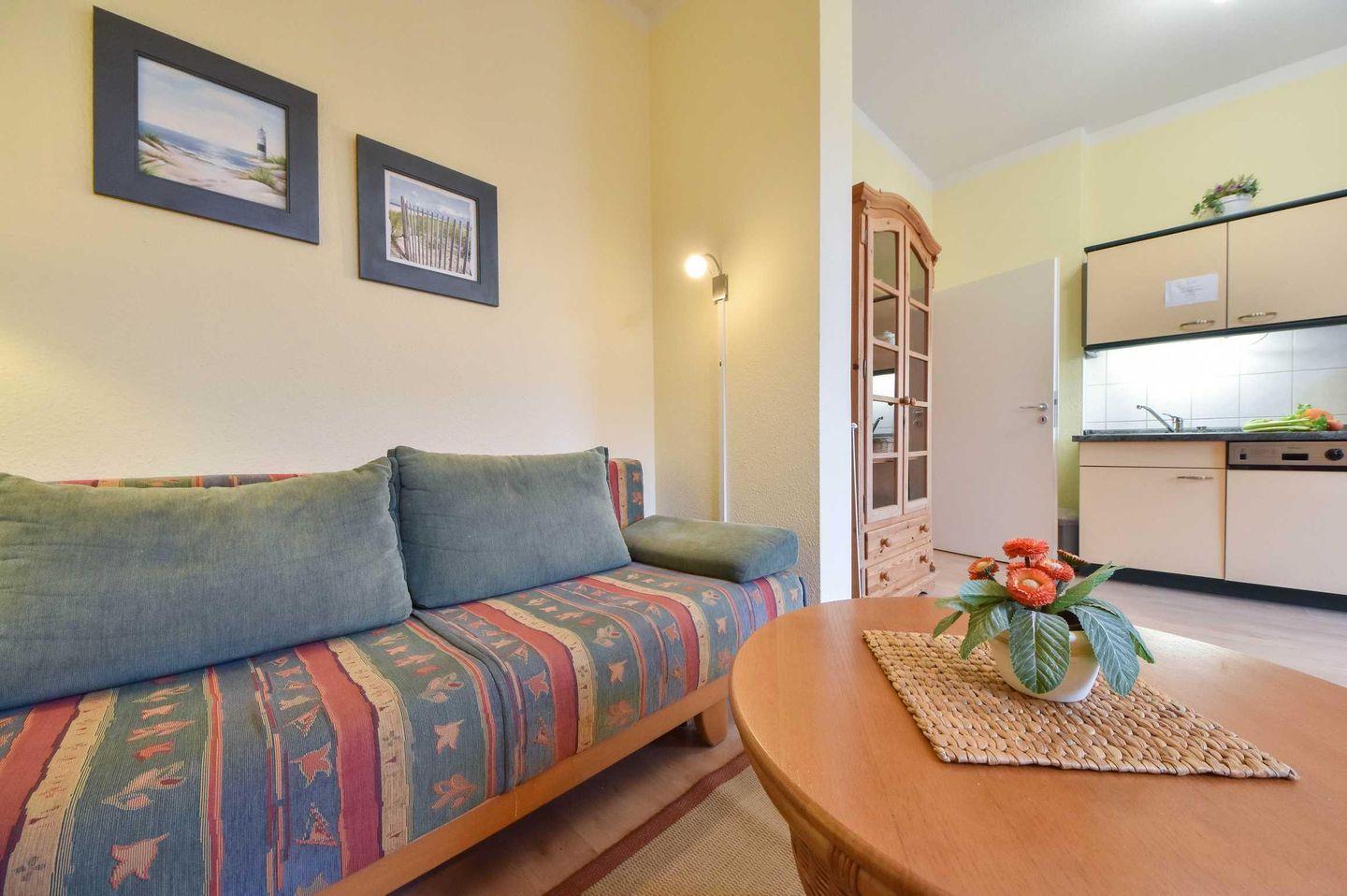Das Appartement befindet sich im 1.OG der Villa Inge und verfügt über zwei Zimmer, sowie einen Westbalkon. Im großen, offenen Wohnraum befindet sich sowohl eine gemütliche Sitzecke, die von einer dritten Person als Schlafgelegenheit genutzt werden kann. Eine offene, voll ausgestattete Wohnküche und ein Esstisch finden ebenfalls im Wohnraum Platz. Von hier aus haben Sie Zugang zum Balkon mit Blick ins Grüne.
