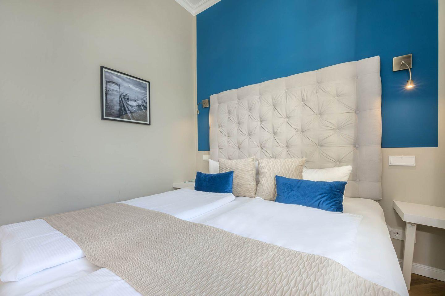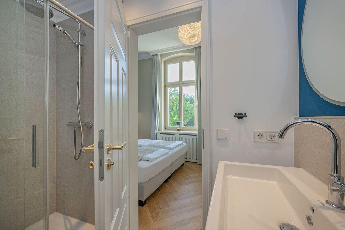 Das komfortable Boxspring-Doppelbett im Schlafzimmer (Liegefläche 1,60m x 2,00m) verspricht erholsamen Schlaf. Ein Kleiderschrank für Ihre Garderobe ist vorhanden. Selbstverständlich können die Fenster verdunkelt werden. Das angrenzende Badezimmer verfügt über eine ebenerdige Echtglasdusche, Waschtisch, WC und Handtuchheizung und komplettiert das Angebot dieser Wohnung.
