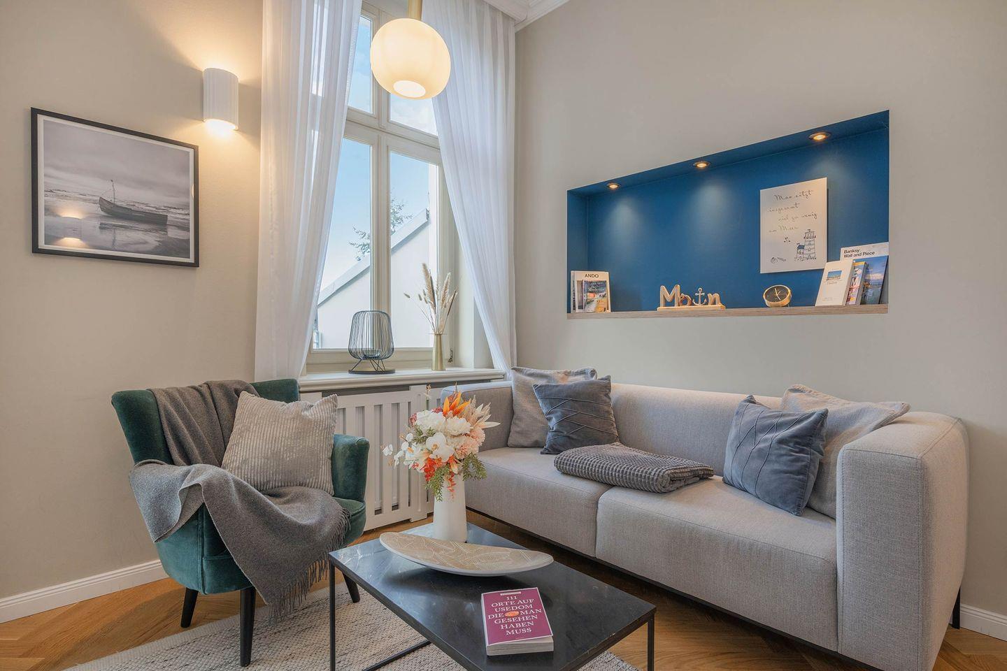 Genießen Sie Ihre Usedom-Auszeit auf der bequemen Sitzlandschaft, bestehend aus Couch und Sessel, oder wechseln Sie für ein gutes Buch oder ein Glas Wein auf den angrenzenden Balkon mit westlicher Ausrichtung. Der Elektrokamin sorgt nicht nur in der kalten Jahreszeit für ein angenehmes Ambiente. Der Flachbild-TV kann mit eigenem Fire-TV-Stick genutzt werden.