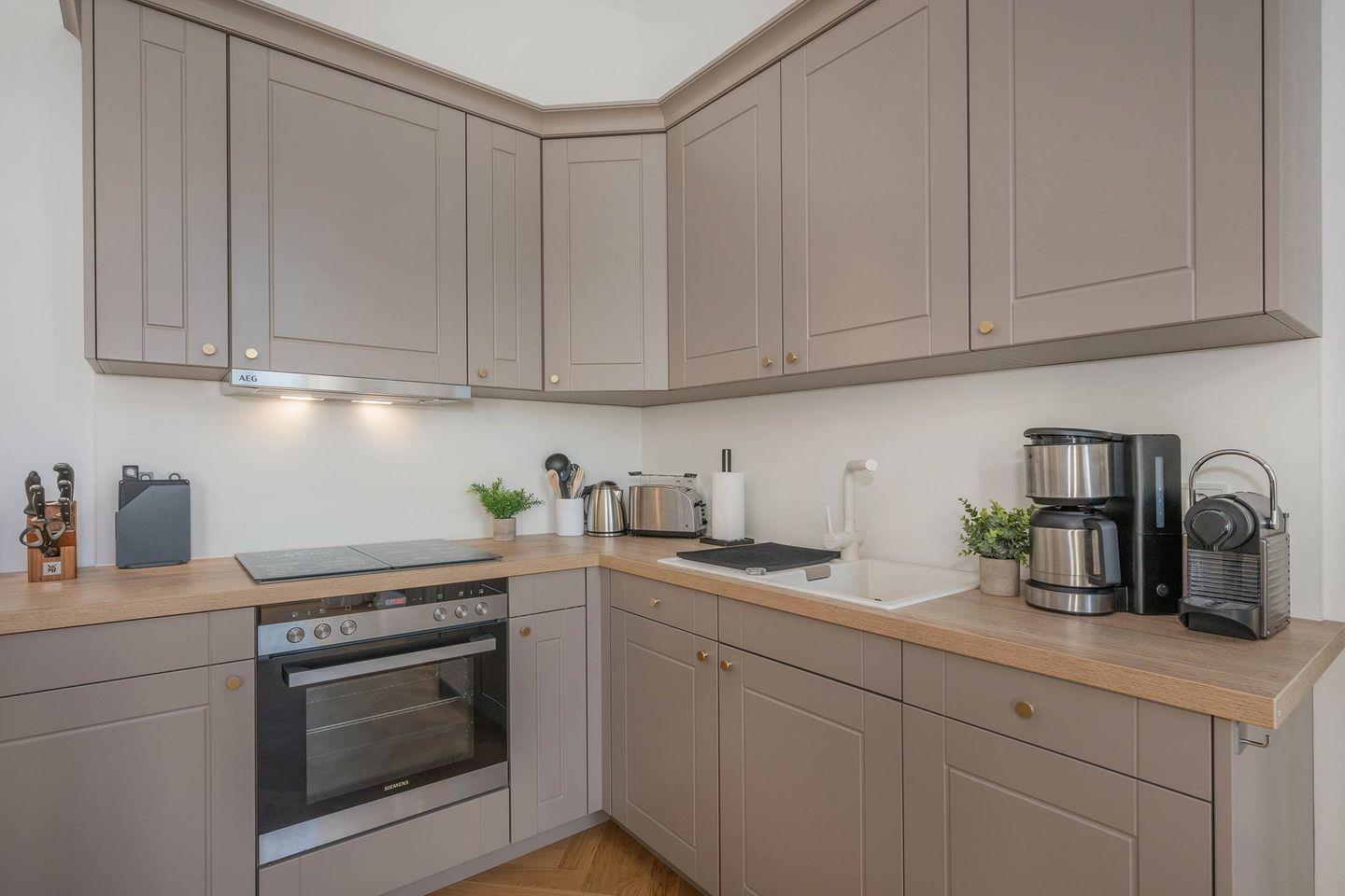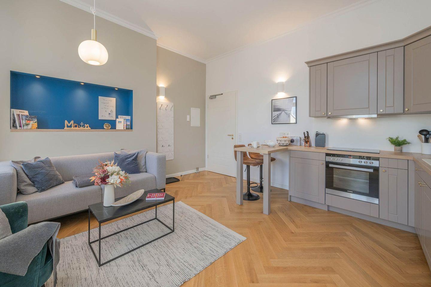 Ankommen und Wohlfühlen - so lautet das Motto der Wohnung 06, in der ersten Etage der Villa Luise. Die 35 Quadratmeter Wohnfläche wurden geschickt eingerichtet und wirken dank der hohen Decken und hellen Wandfarben geräumig und lichtdurchflutet. Im offenen Wohnraum erwartet Sie eine voll ausgestattete Küche samt hochwertigen Elektrogeräten (Kühlschrank, Spülmaschine, 4-Platten-Ceranfeld sowie Backofen). Der Tresen eignet sich sowohl zum Vorbereiten der Mahlzeiten, als auch zum Frühstücken oder Dinieren am Abend.
