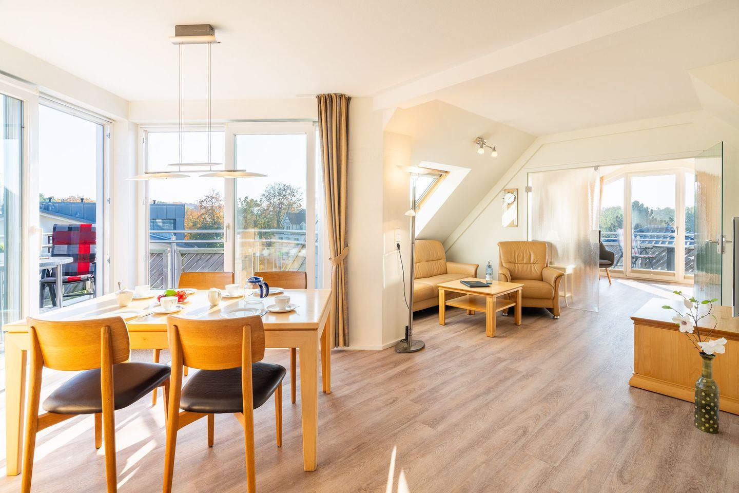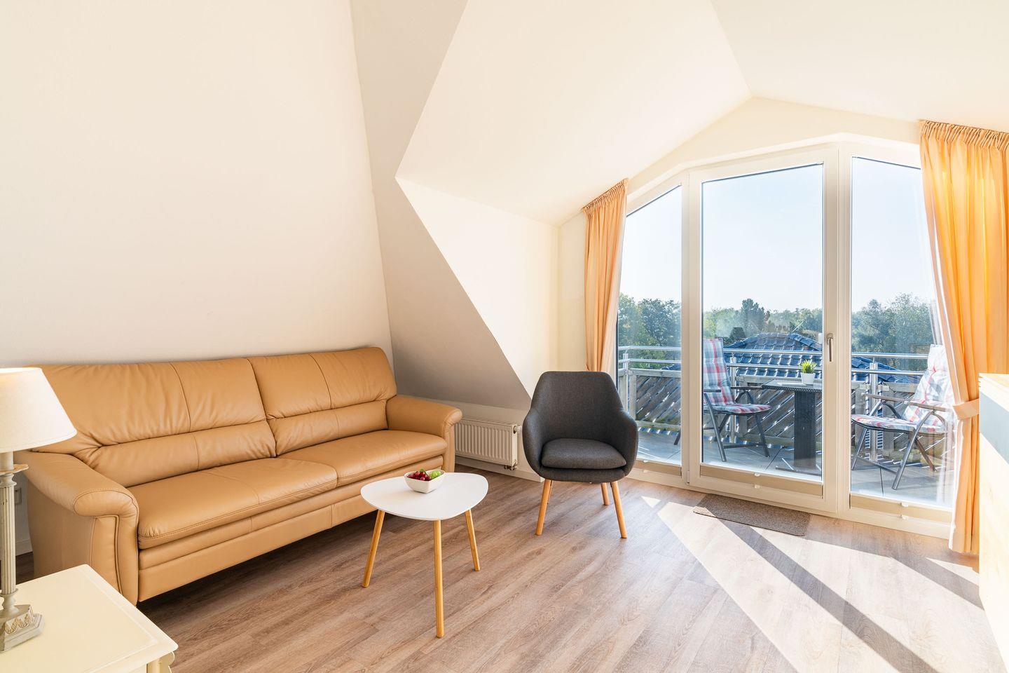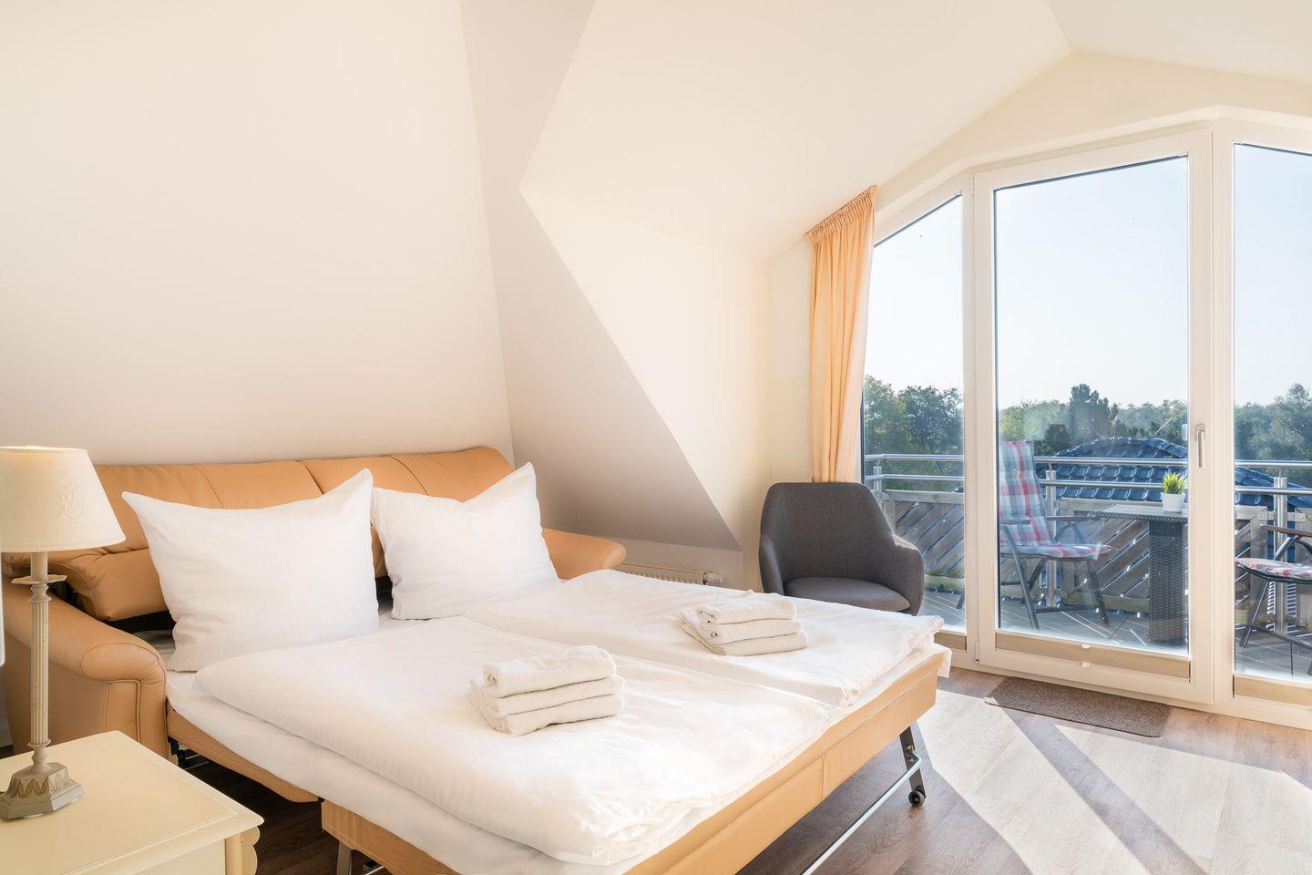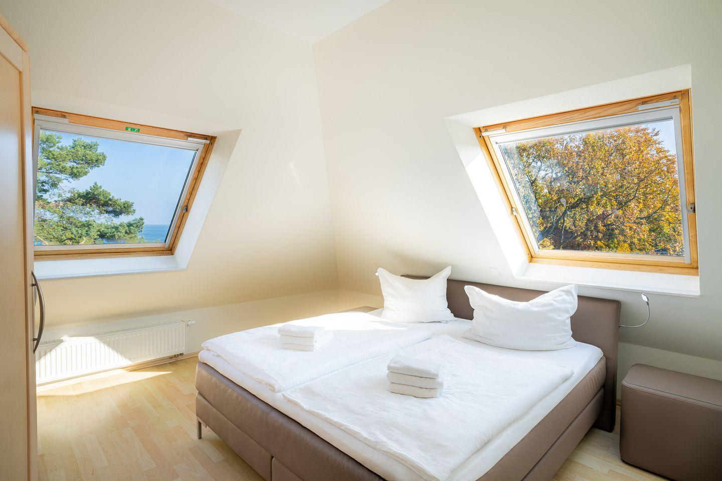 Im Dachgeschoss der Villa befindet sich die helle, komfortable Wohnung 24 - mit zwei Balkonen und atemberaubenden Meerblick als besondere Highlights. Der Wohnraum ist durch eine Glastür getrennt und ermöglicht Ihnen so die Möglichkeit des Rückzuges. Eine Schlafcouch ist ebenso Bestandteilt, wie ein weiteres Sofa und ein Flat-TV. Die Küchenzeile befindet sich offen zum Wohnzimmer in einer Nische des Raumes mit einem Essbereich. Die Balkone lassen sich jeweils vom Essbereich, wie auch vom Wohnbereich betreten. Von hier aus lässt es sich hervorragend über die umliegende Landschaft bis zur Ostsee blicken. Das Schlafzimmer ist mit einem bequemen Boxspringbett und Kleiderschrank eingerichtet.