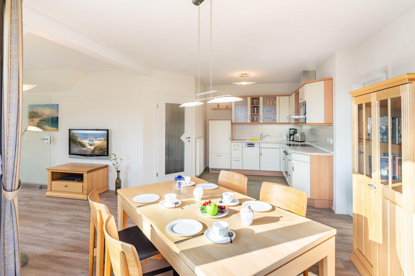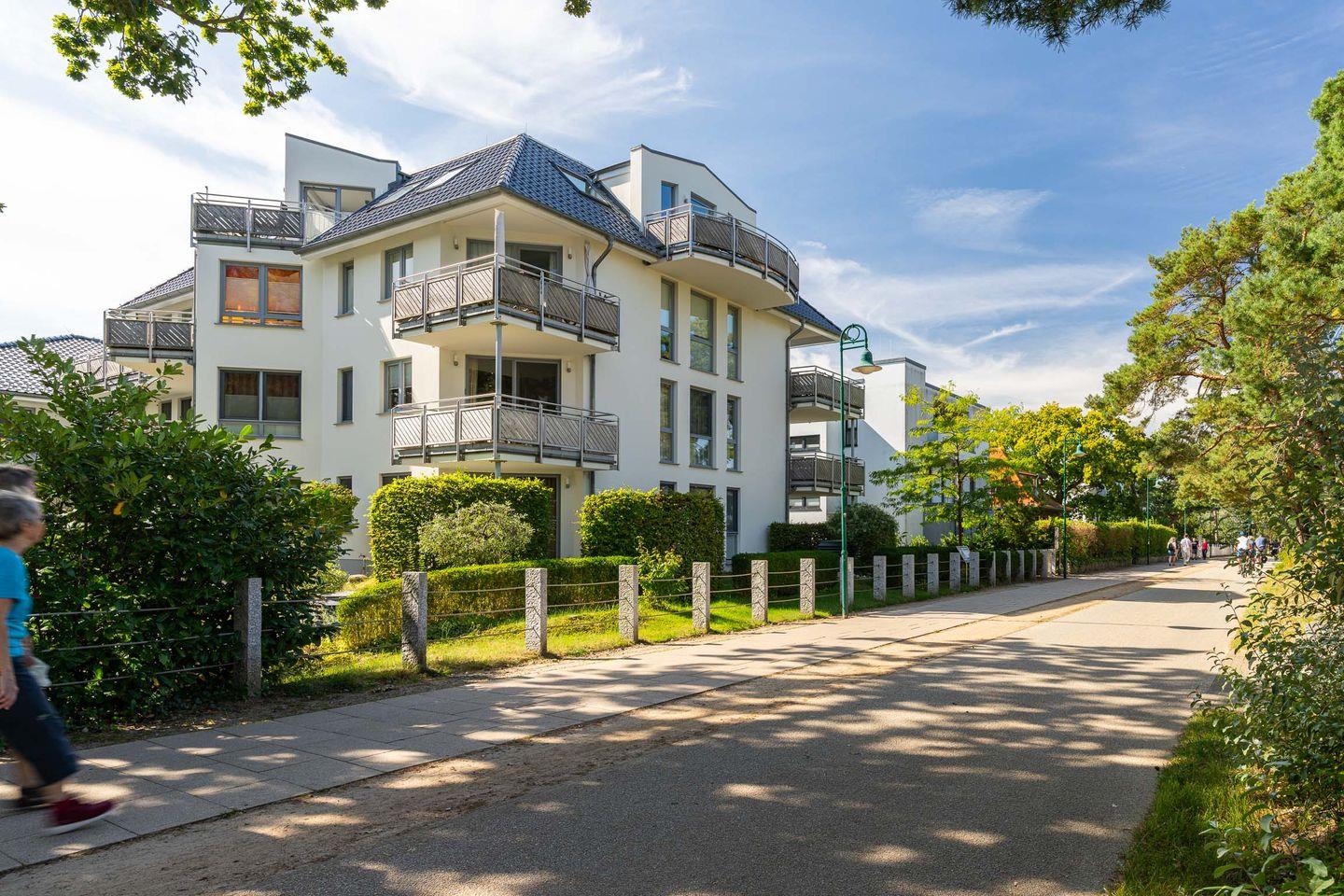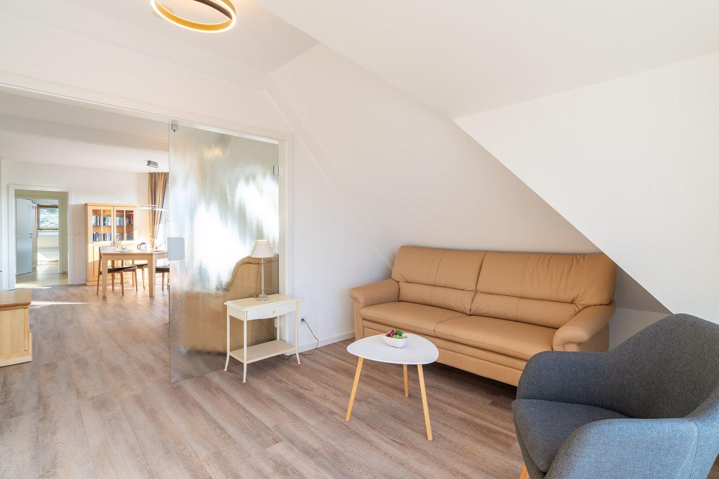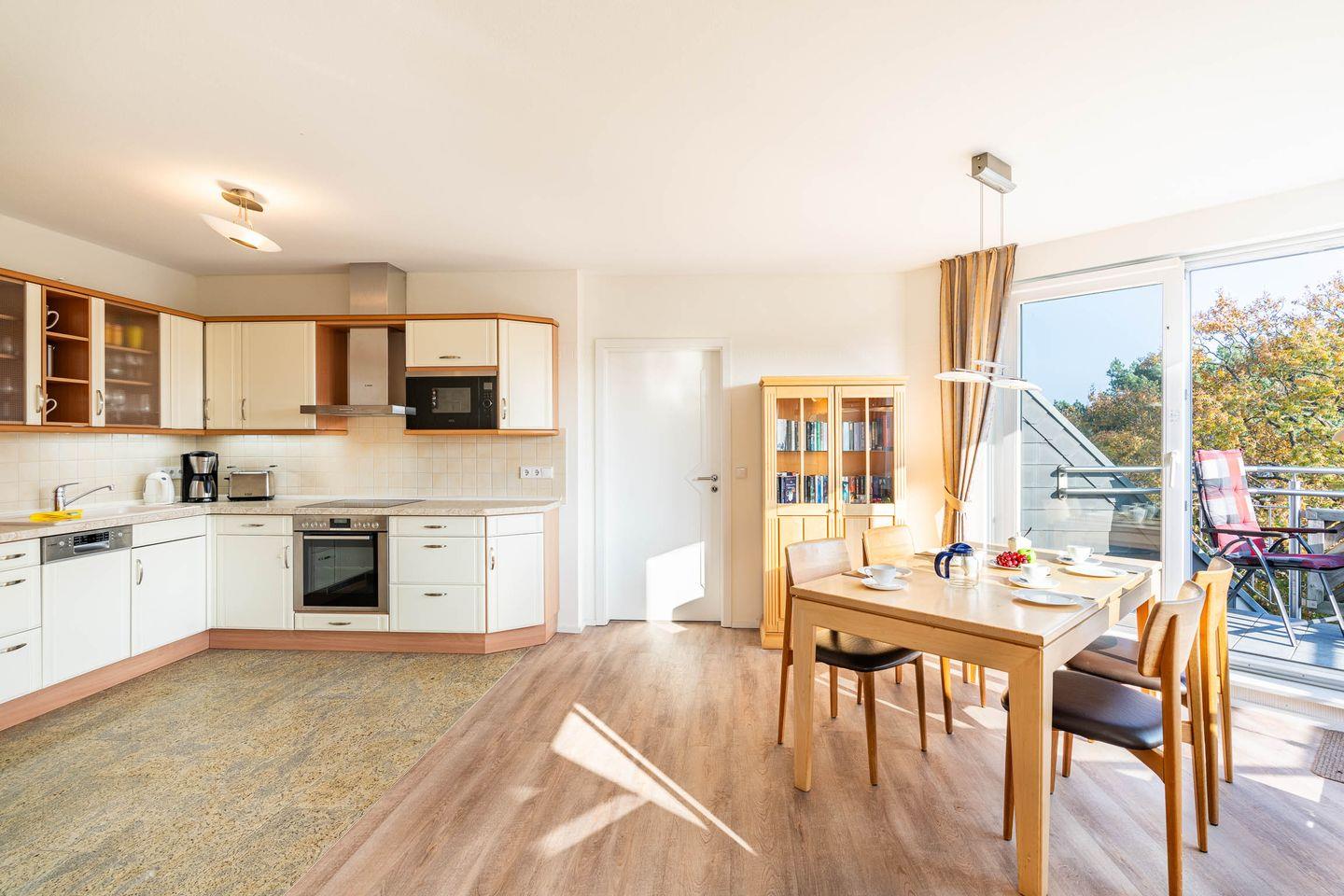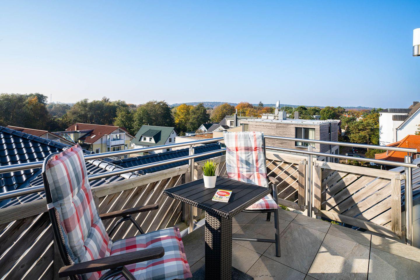 Im Dachgeschoss der Villa befindet sich die helle, komfortable Wohnung 24 - mit zwei Balkonen und atemberaubenden Meerblick als besondere Highlights. Der Wohnraum ist durch eine Glastür getrennt und ermöglicht Ihnen so die Möglichkeit des Rückzuges. Eine Schlafcouch ist ebenso Bestandteilt, wie ein weiteres Sofa und ein Flat-TV. Die Küchenzeile befindet sich offen zum Wohnzimmer in einer Nische des Raumes mit einem Essbereich. Die Balkone lassen sich jeweils vom Essbereich, wie auch vom Wohnbereich betreten. Von hier aus lässt es sich hervorragend über die umliegende Landschaft bis zur Ostsee blicken. Das Schlafzimmer ist mit einem bequemen Boxspringbett und Kleiderschrank eingerichtet.