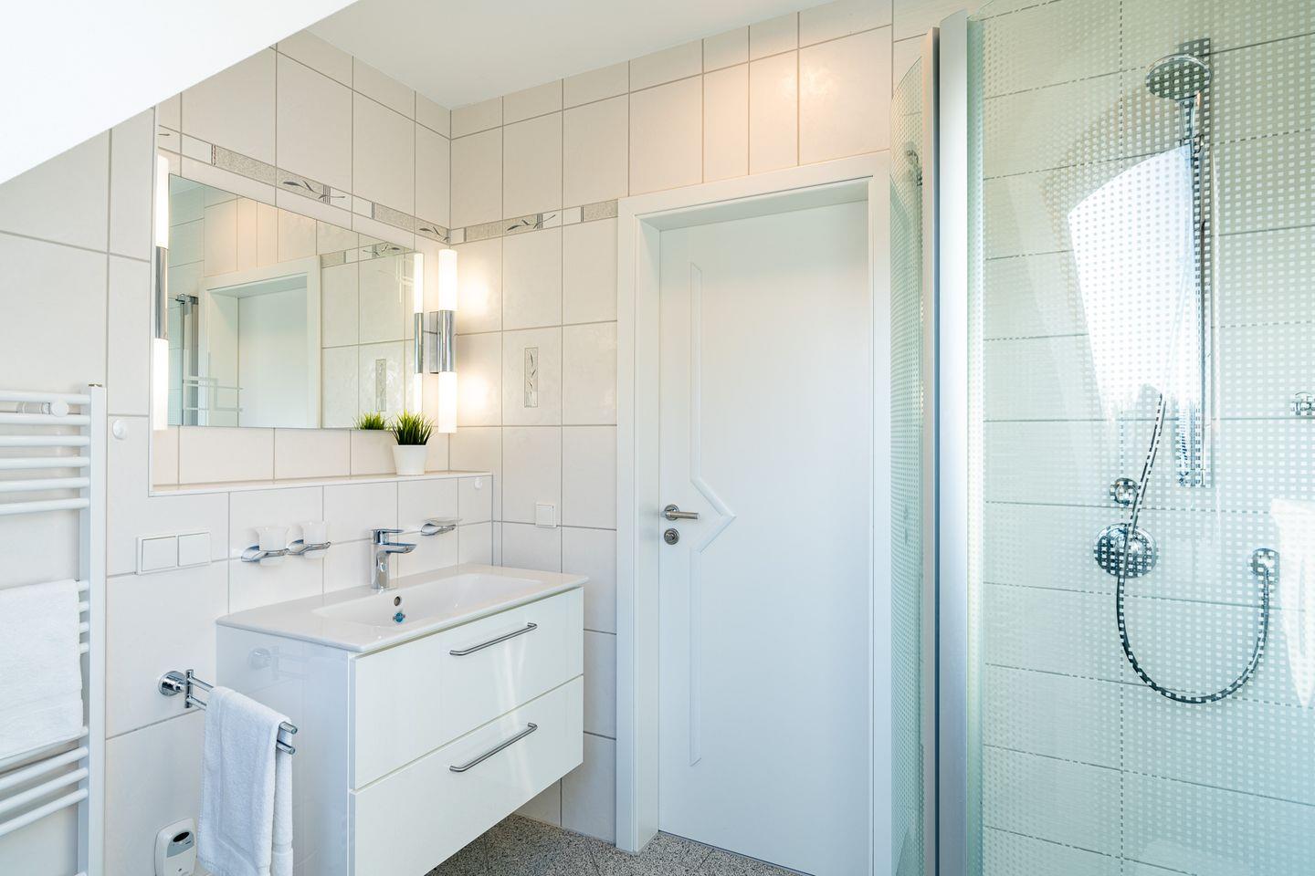 Das Badezimmer ist mit WC, Waschbecken, Handtuchheizung und Dusche ausgestattet.
