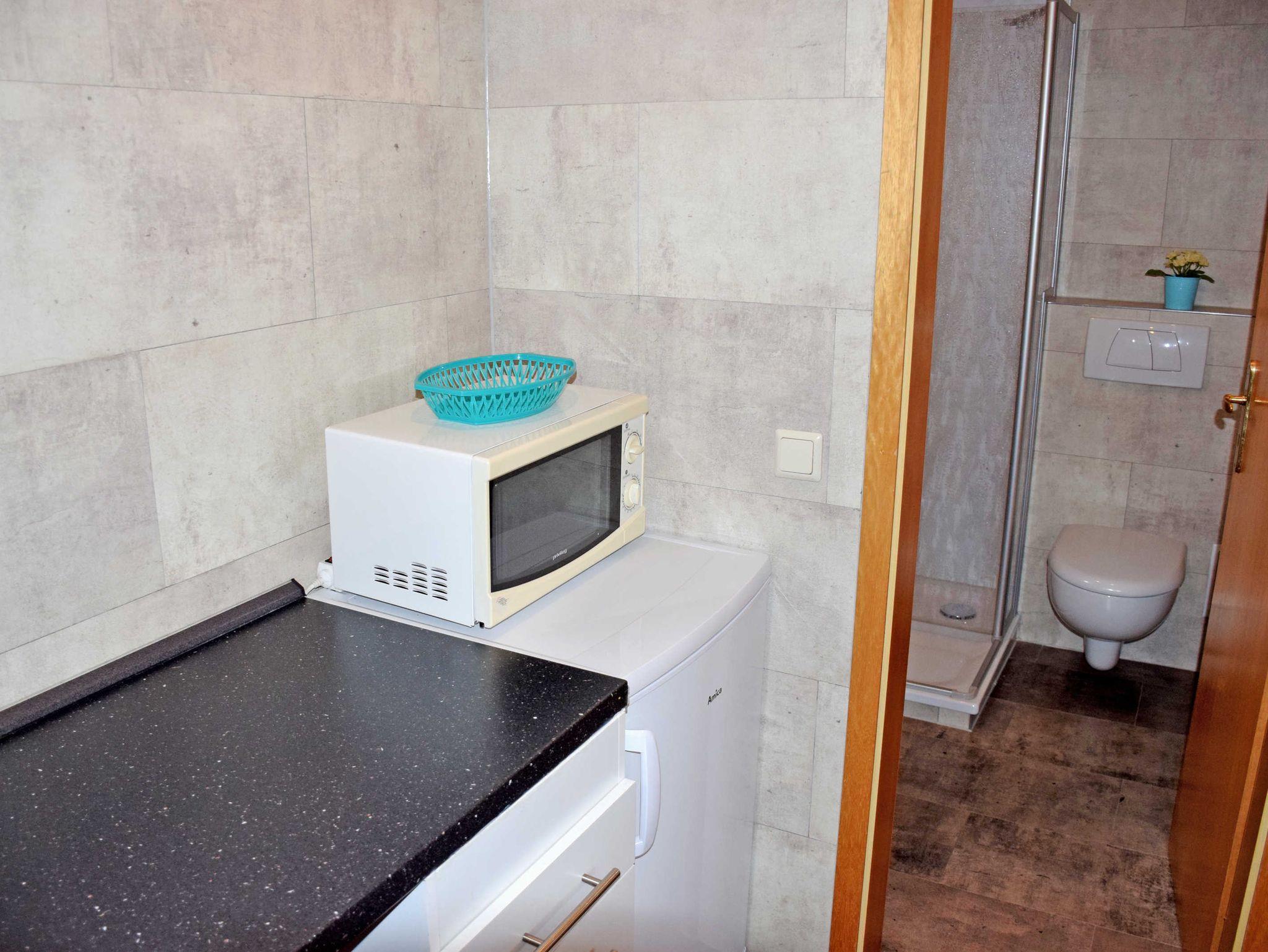 Die kleine separate Küche ist mit einem Kleinen Cerankochfeldherd, Mikrowelle, Wasserkocher, Kaffeemaschine, Spülmaschine, Toaster und Kühlschrank mit Gefrierfach ausgestattet.