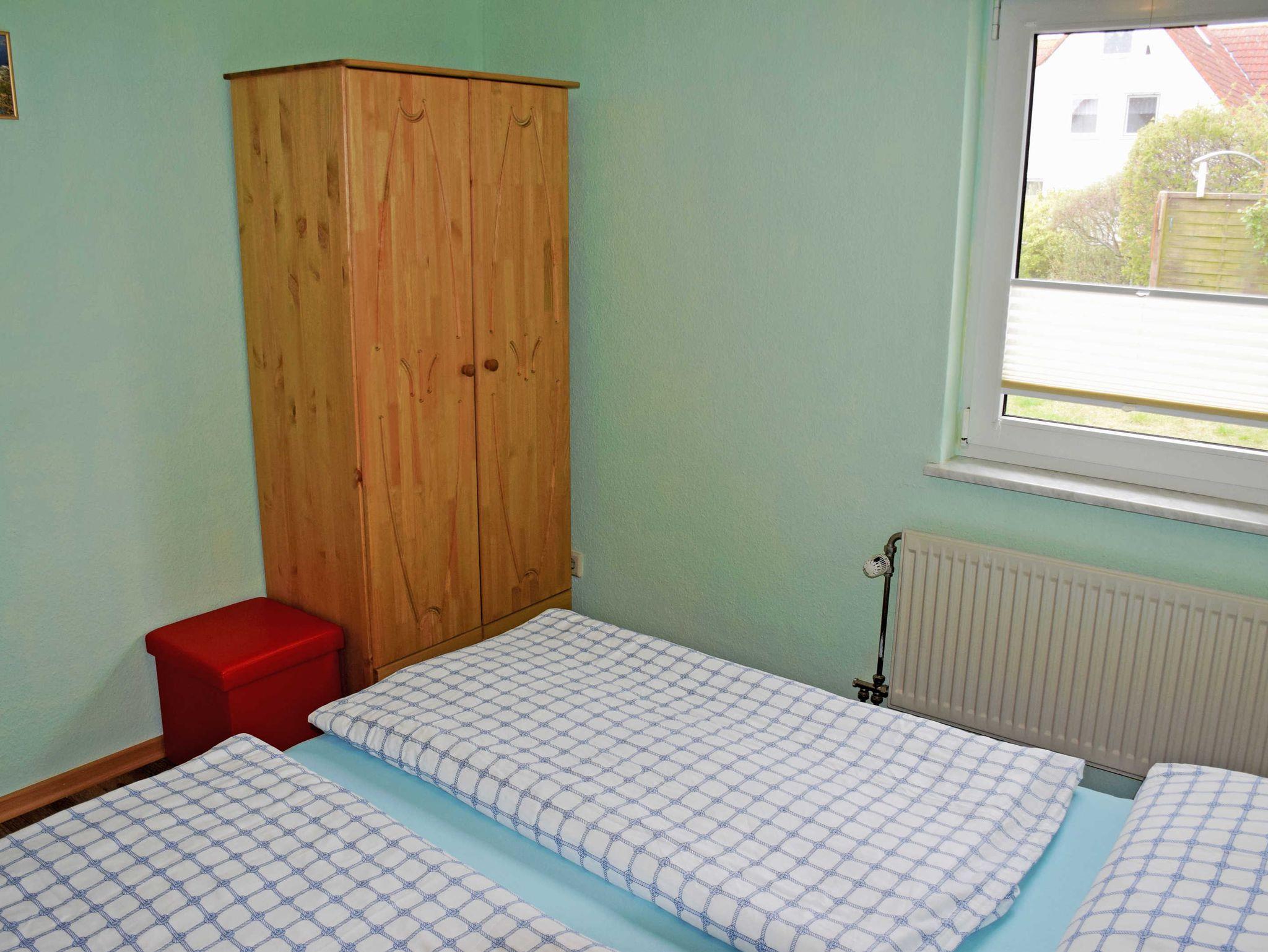 Vom Wohnzimmer aus gelangt man auf die Sonnenterrasse mit Gartenmöbeln, davor befindet sich eine Liegewiese zum Sonnen. Im ersten Schlafzimmer steht ein bequemes Doppelbett mit Nachttischen und Leselampen sowie ein Kleiderschrank. Das zweite Schlafzimmer verfügt über die gleiche Ausstattung.