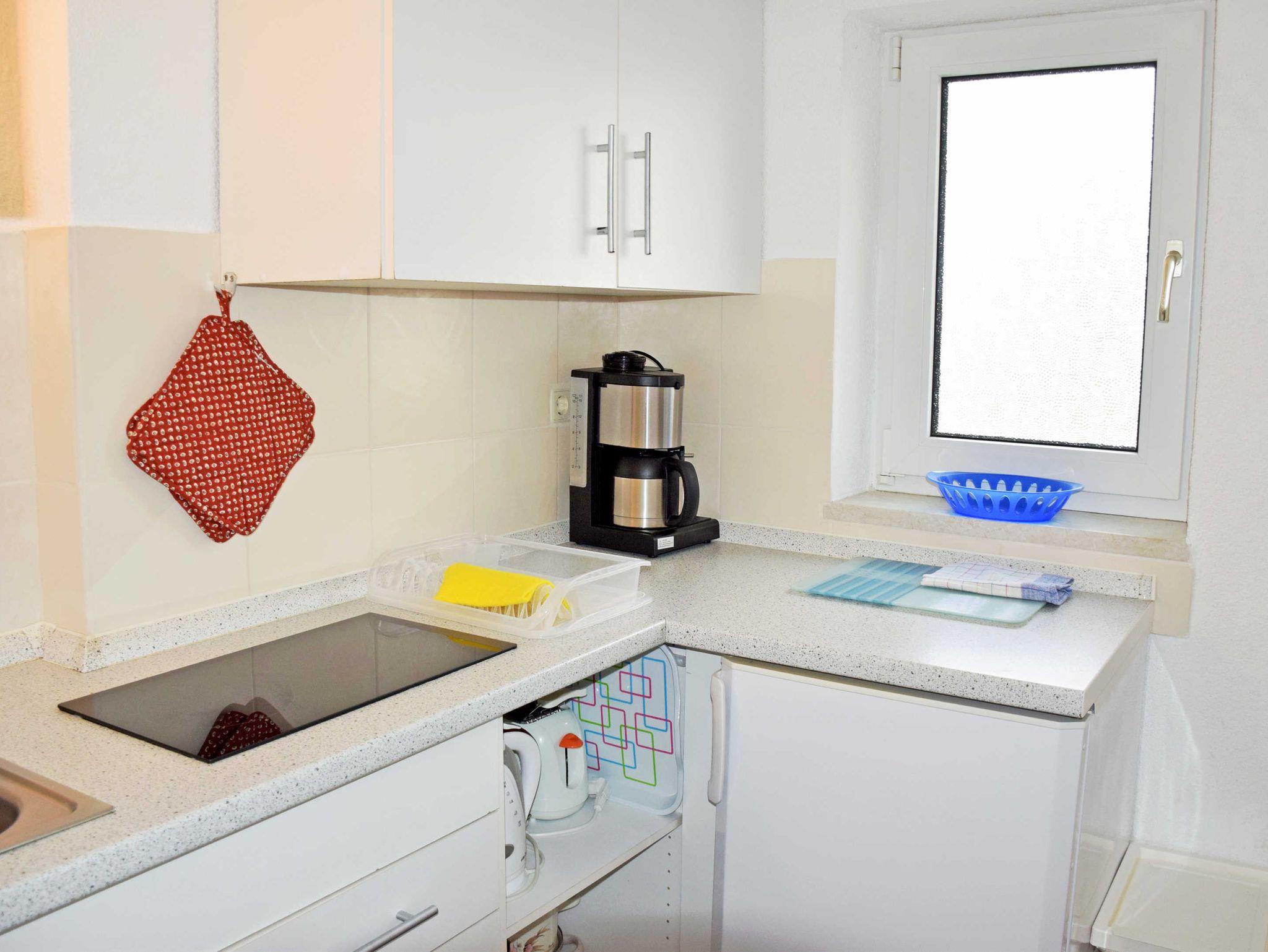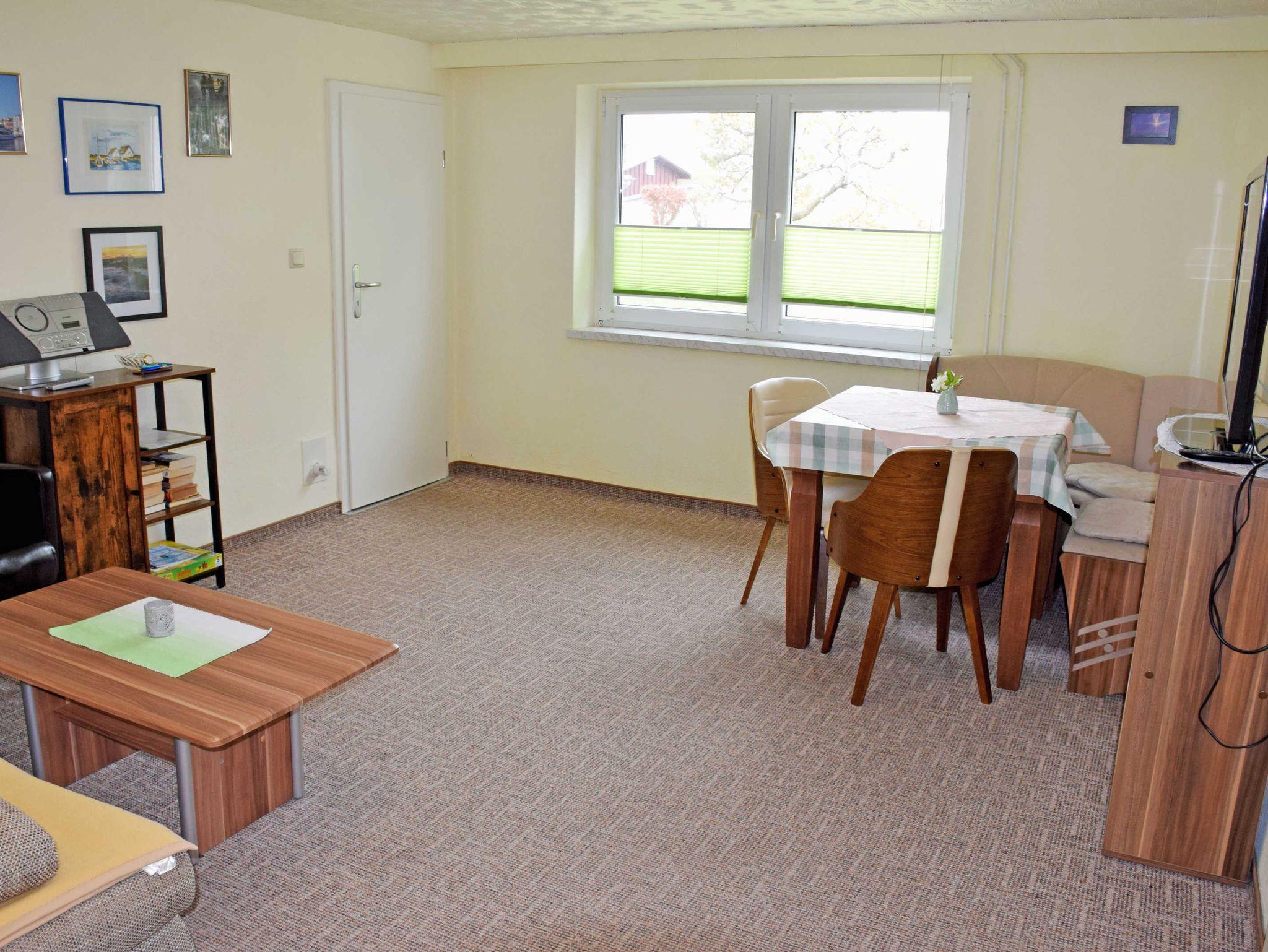 Unsere modern und liebevoll eingerichtete Ferienwohnung ost ist ca. 38qm groß, bietet Platz für maximal 2 Gäste. Im Schlafraum stehen ein bequemes Doppelbett mit Nachttischen und Leselampen sowie ein Schrank. Im Wohnzimmer befinden sich zwei Sessel mit Tisch, eine Sitzecke und ein moderner Flachbild-TV. In der kleinen Küche stehen eine Sitzecke mit Esstisch und eine Küchenzeile mit einem kleinen Cerankochfeld, Wasserkocher, Kaffeemaschine, Toaster und Kühlschrank ausgestattet. Vom Wohnzimmer aus gelangt man auf die Sonnenterrasse mit Gartenmöbeln, davor befindet sich eine Liegewiese zum Sonnen.