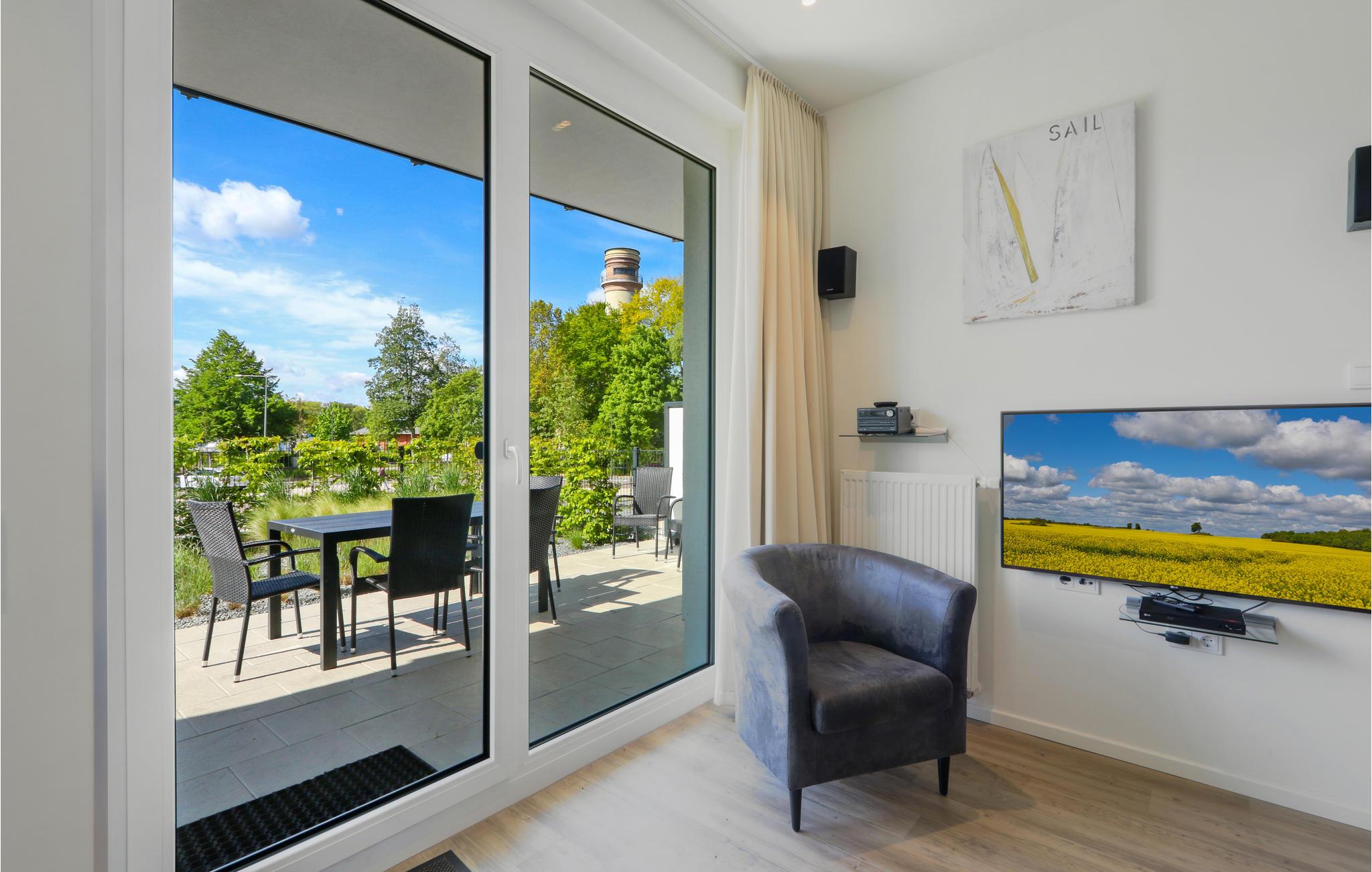 Der Ausblick von dieser Wohnung ist in Richtung Priwall Strand, Trave und dem historischen Leuchturm von Travemünde.