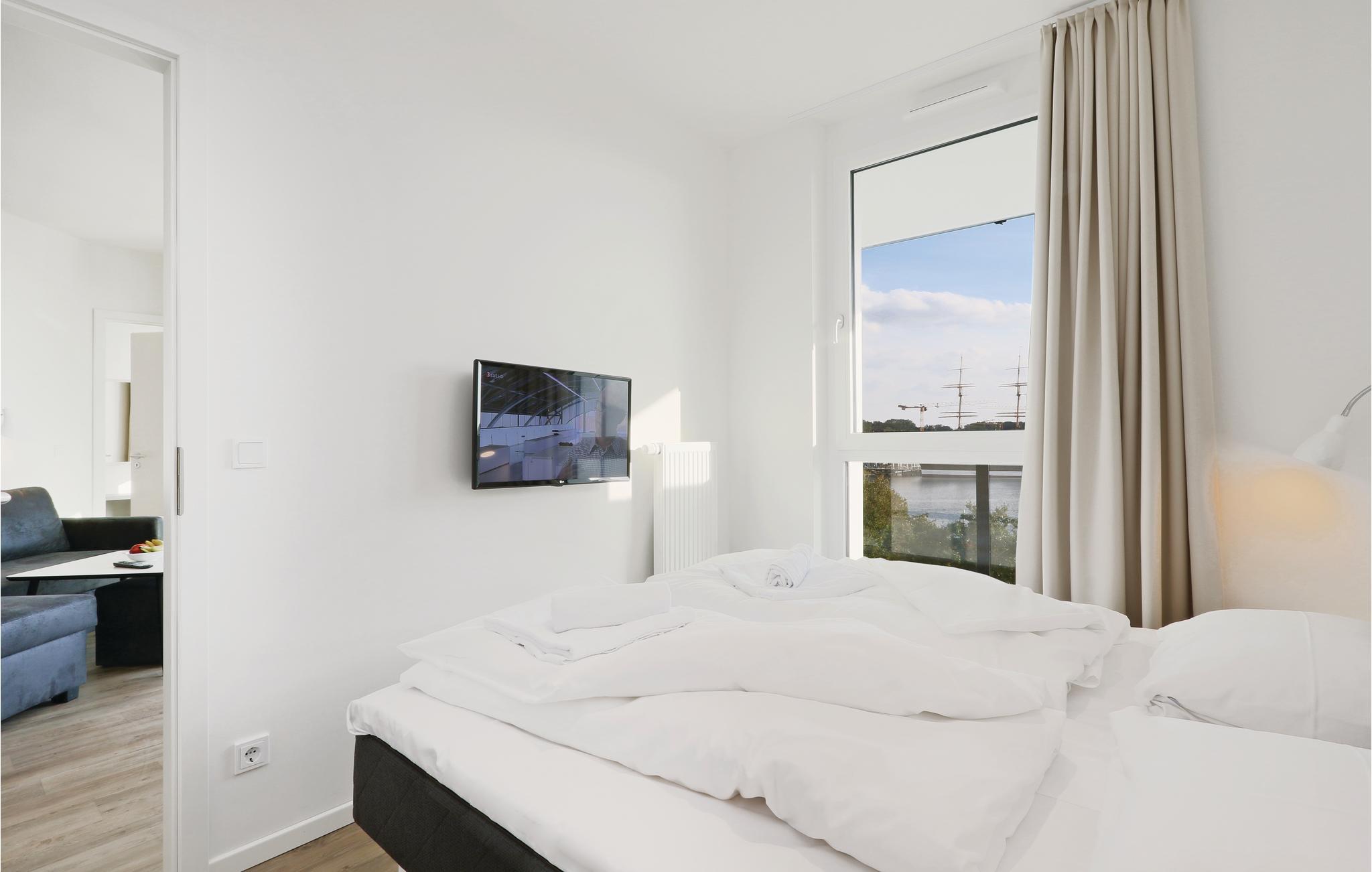 Ihre Ferienwohnung befindet sich im 3. Obergeschoss der Anlage, weshalb Sie eine einmalige Aussicht genießen. Von hier aus können Sie auf den Priwall, den Sandstrand sowie die Hafenausfahrt mit den vorbeiziehenden Schiffen blicken. Sie verfügt über zwei separate Schlafzimmer mit jeweils einem gemütlichen Doppelbett. Im Wohnbereich können Sie es sich vor dem wohligen Licht des Bio-Ethanol-Kamins gemütlich machen. Im Wohnbereich befindet sich außerdem das Schlafsofa, welches zwei weitere Schlafplätze bietet. Ein Kinderbett lässt sich ausschließlich im Wohnzimmer aufstellen, da im Schlafzimmer nicht ausreichend Platz zur Verfügung steht.