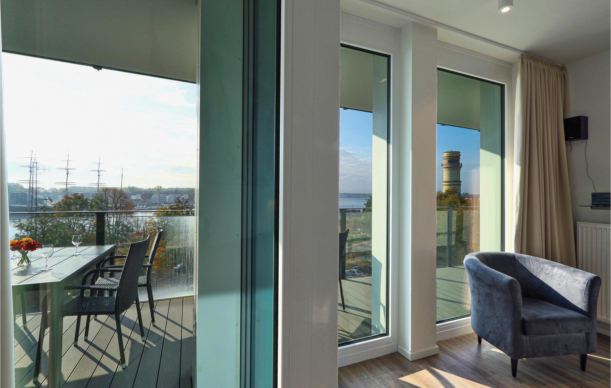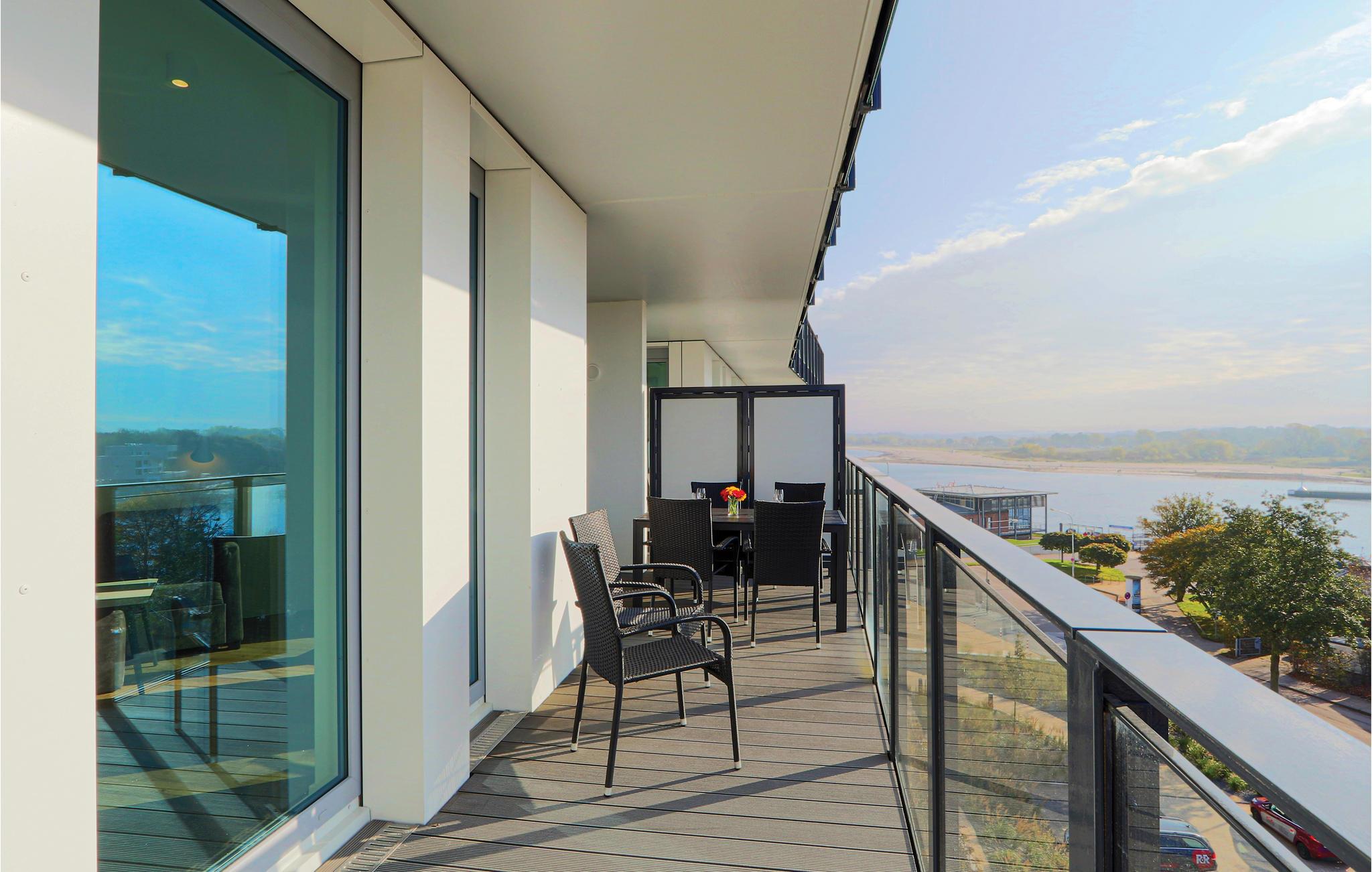 Auf dem Balkon, der nach Süden ausgerichtet ist, können Sie die frische Ostseeluft und die Sonne genießen. Von hier aus schauen Sie auf den Priwall, den Strand und die Travemündung. Entspannen Sie mit dem Blick auf die vorbeziehenden Schiffe. Gartenmöbel stehen hier für gemeinsame Mahlzeiten mit der Familie zur Verfügung. Gegen ein kleines Pfand können Sie sich an der Rezeption ein Fernglas ausleihen, mit dem Sie die das Treiben der Umgebung und die Natur beobachten können.