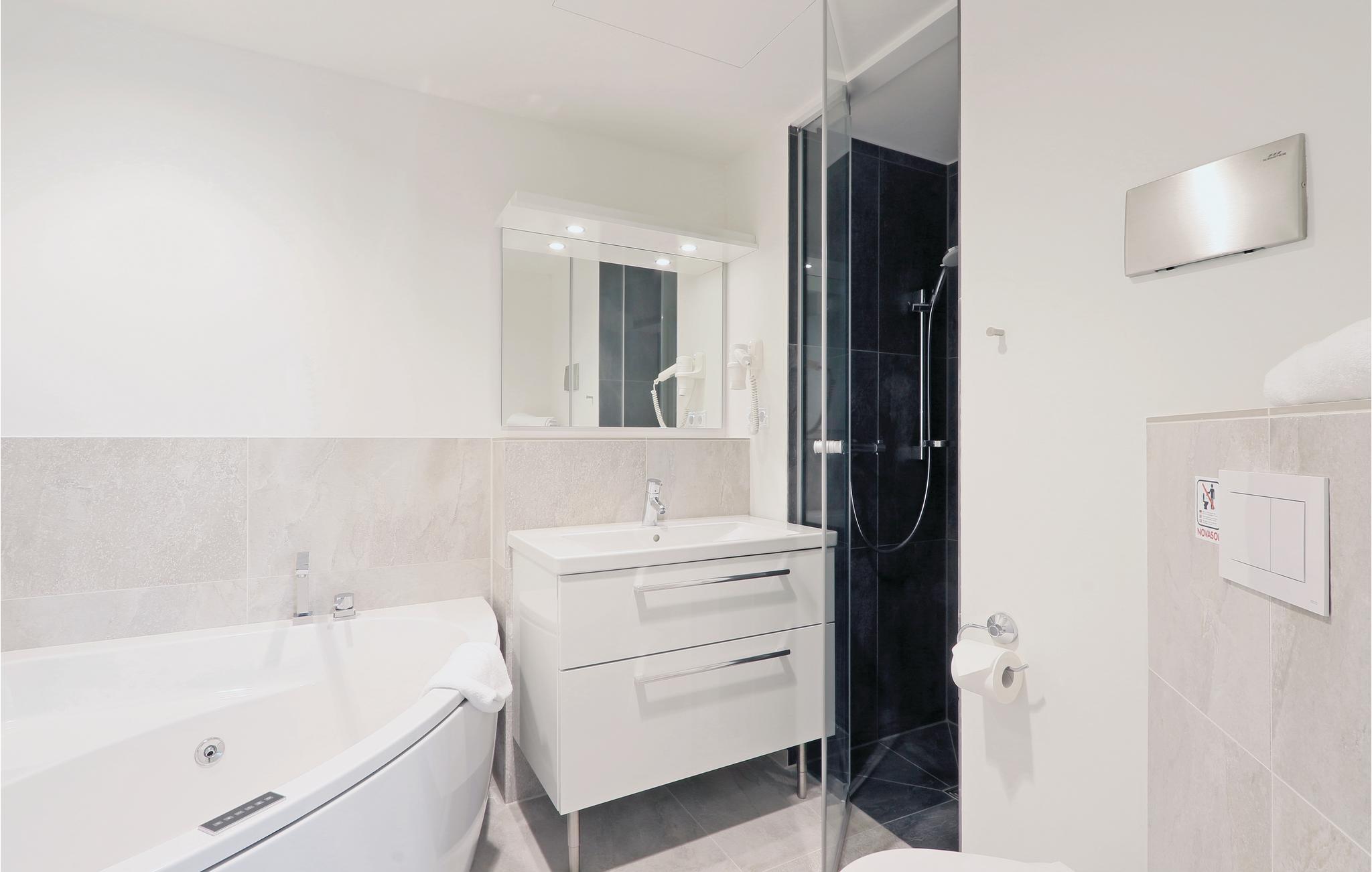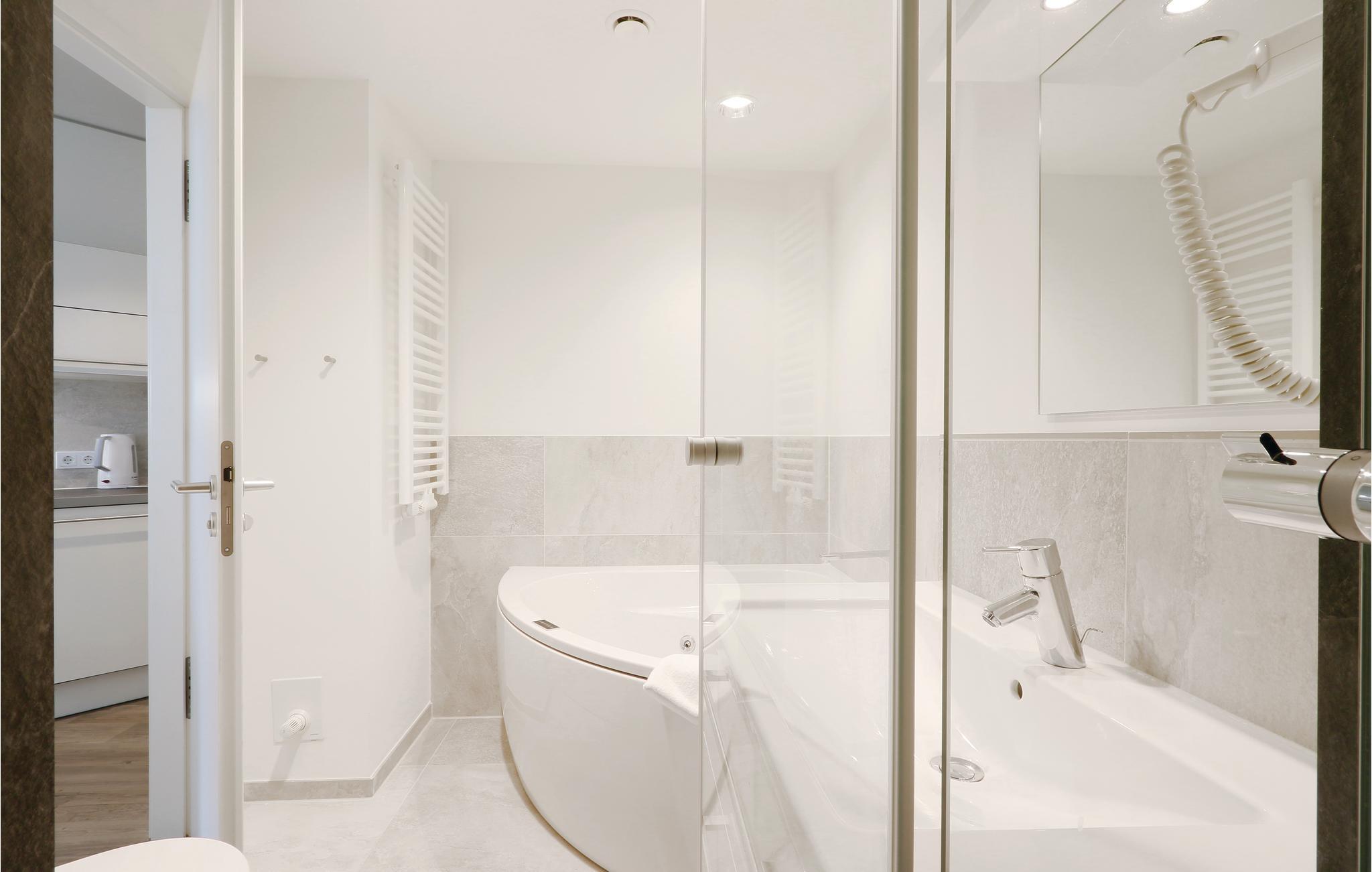 In der Wohnung befinden sich zwei Badezimmer, die sich als Ihr persönlicher Wellness-Bereich präsentieren. Hier können Sie sich nach einem langen Spaziergang an der Ostsee in der Sauna aufwärmen. Außerdem gibt es ein Dampfbad mit Regendusche sowie ein Whirlpool für zwei Personen. Hier lässt es sich herrlich entspannen.
