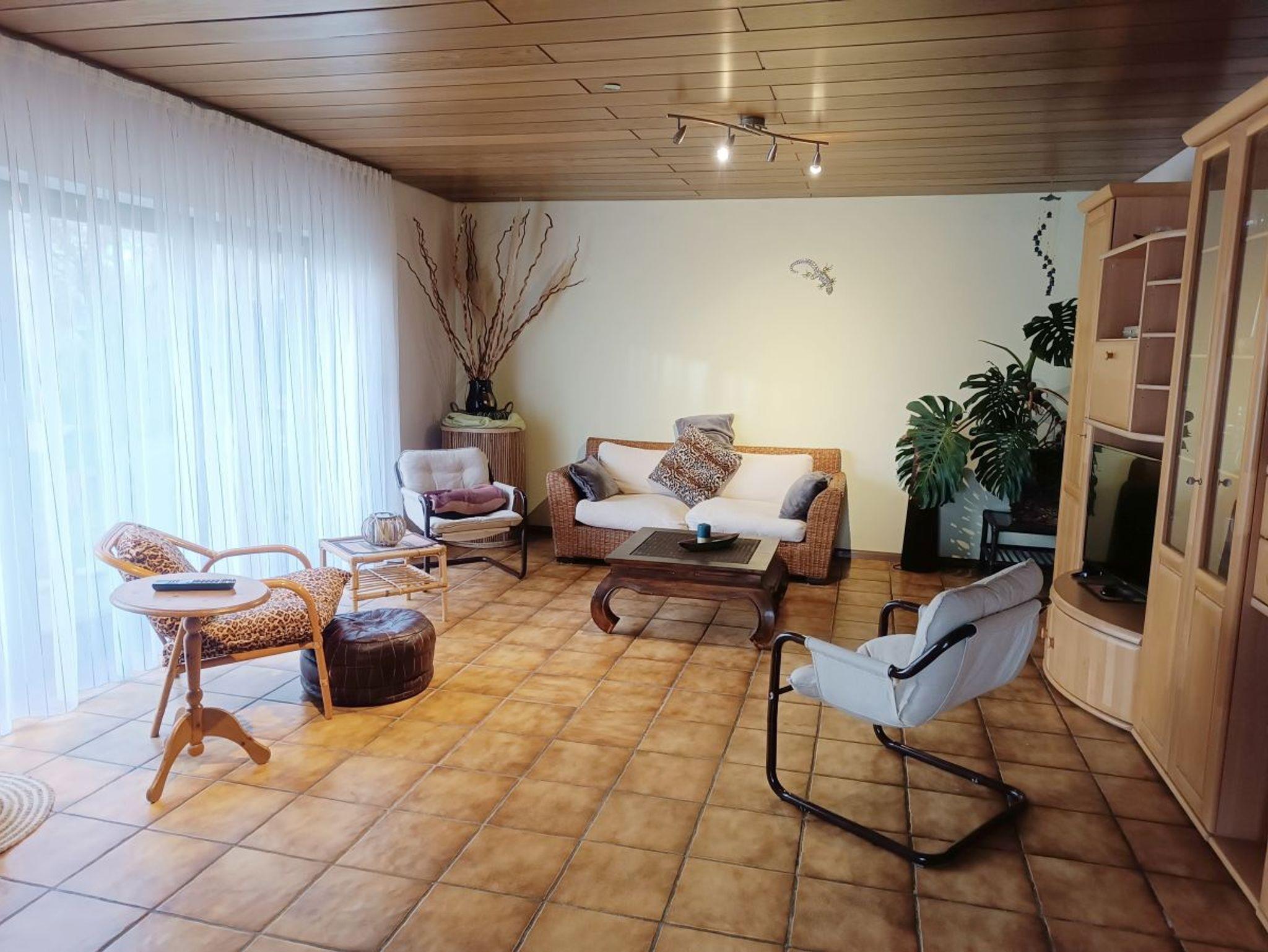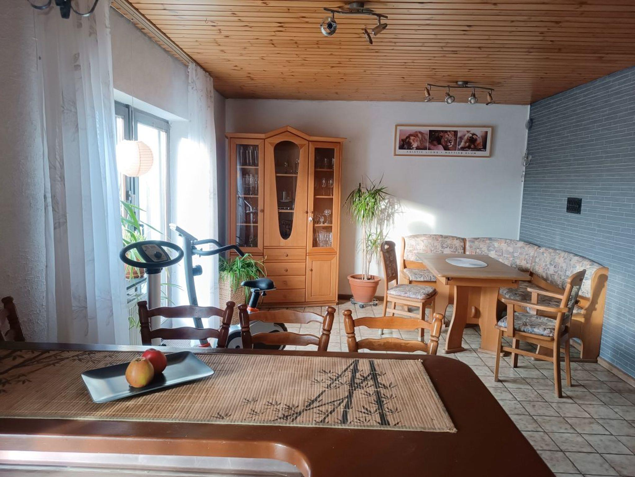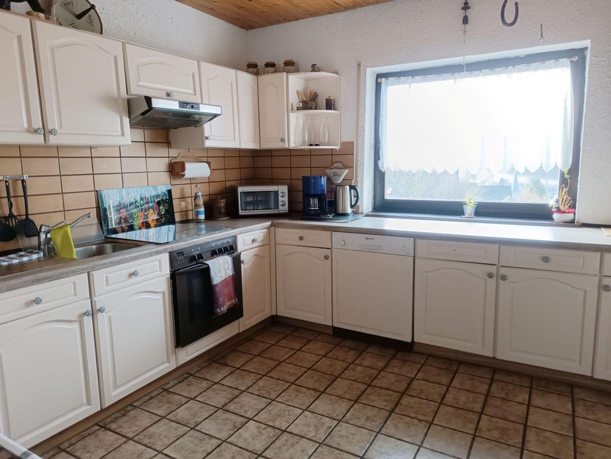 Genießen Sie erholsame Tage in unserer großzügigen, ca. 100 m² großen Ferienwohnung, die keine Wünsche offen lässt. Die voll ausgestattete Küche lädt zum Kochen ein, und auf Anfrage steht Ihnen eine kleine Kühltruhe zur Verfügung. Eine stilvolle Theke trennt die Küche vom geräumigen Essbereich, von dem aus Sie direkt auf die sonnige Terrasse gelangen – ein perfekter Ort zum Entspannen.