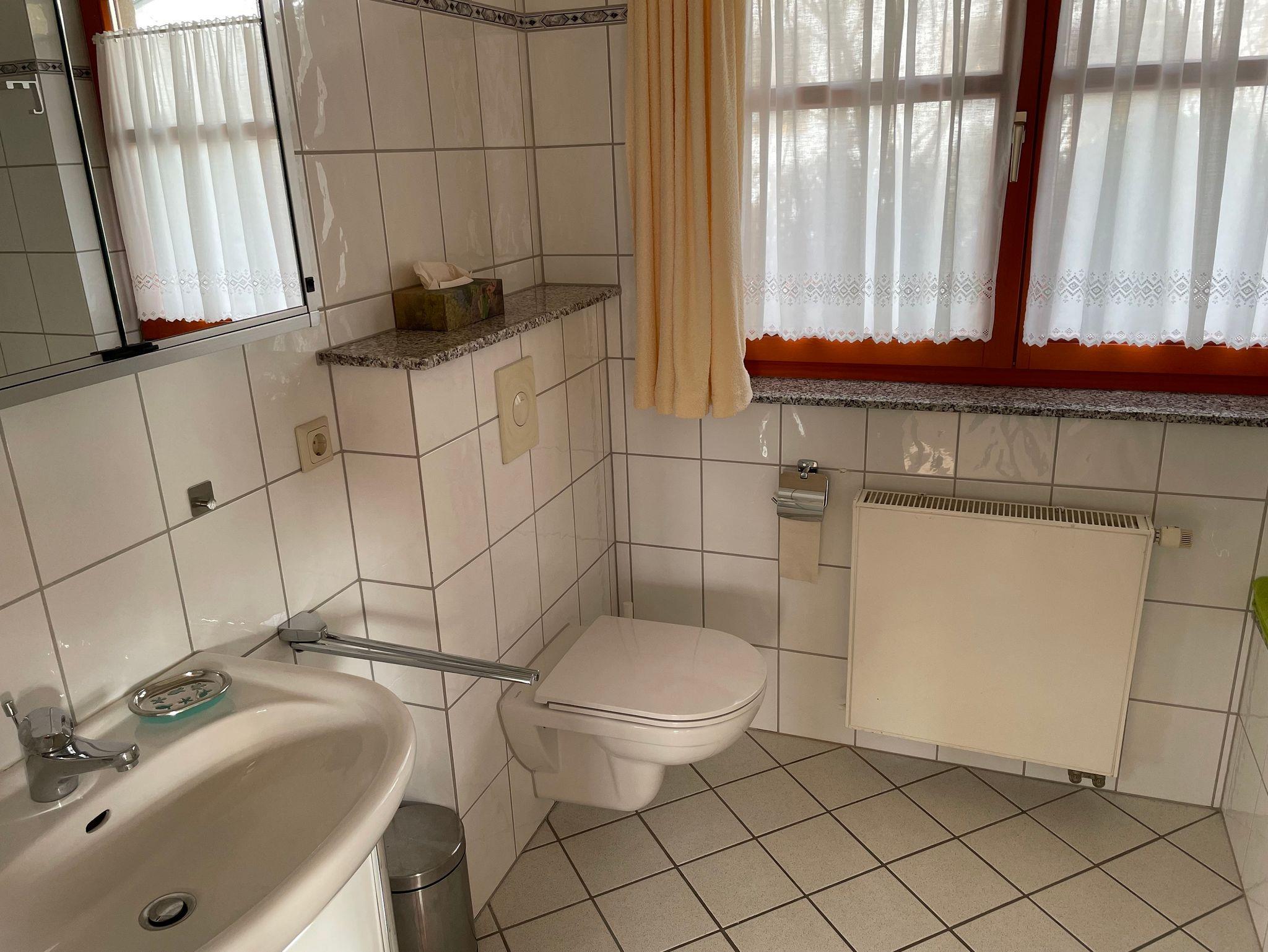 Das Bad ist mit einer Wanne ausgestattet; ein Dusch-Spritzschutz ist vorhanden.