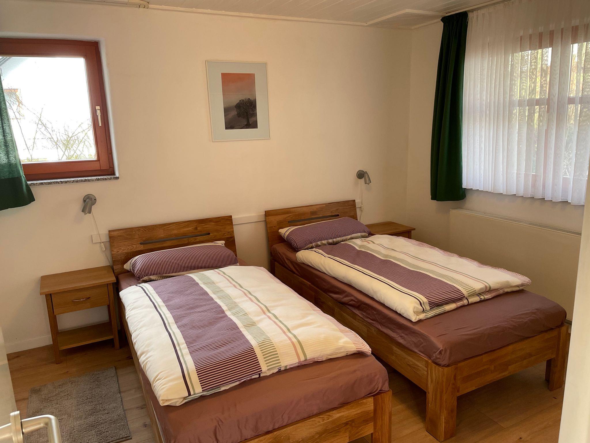 Das Schlafzimmer bietet ausreichend Stauraum im großen Kleiderschrank. Die zwei Einzelbetten können leicht auch als Doppelbett zusammengestellt werden.