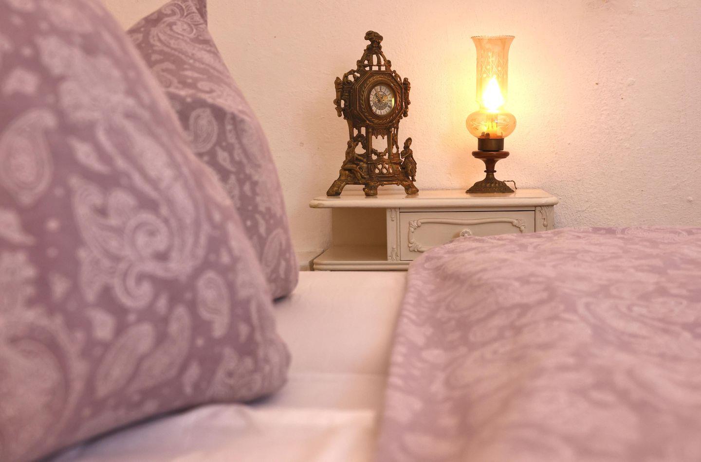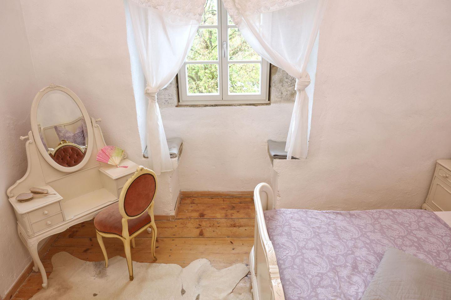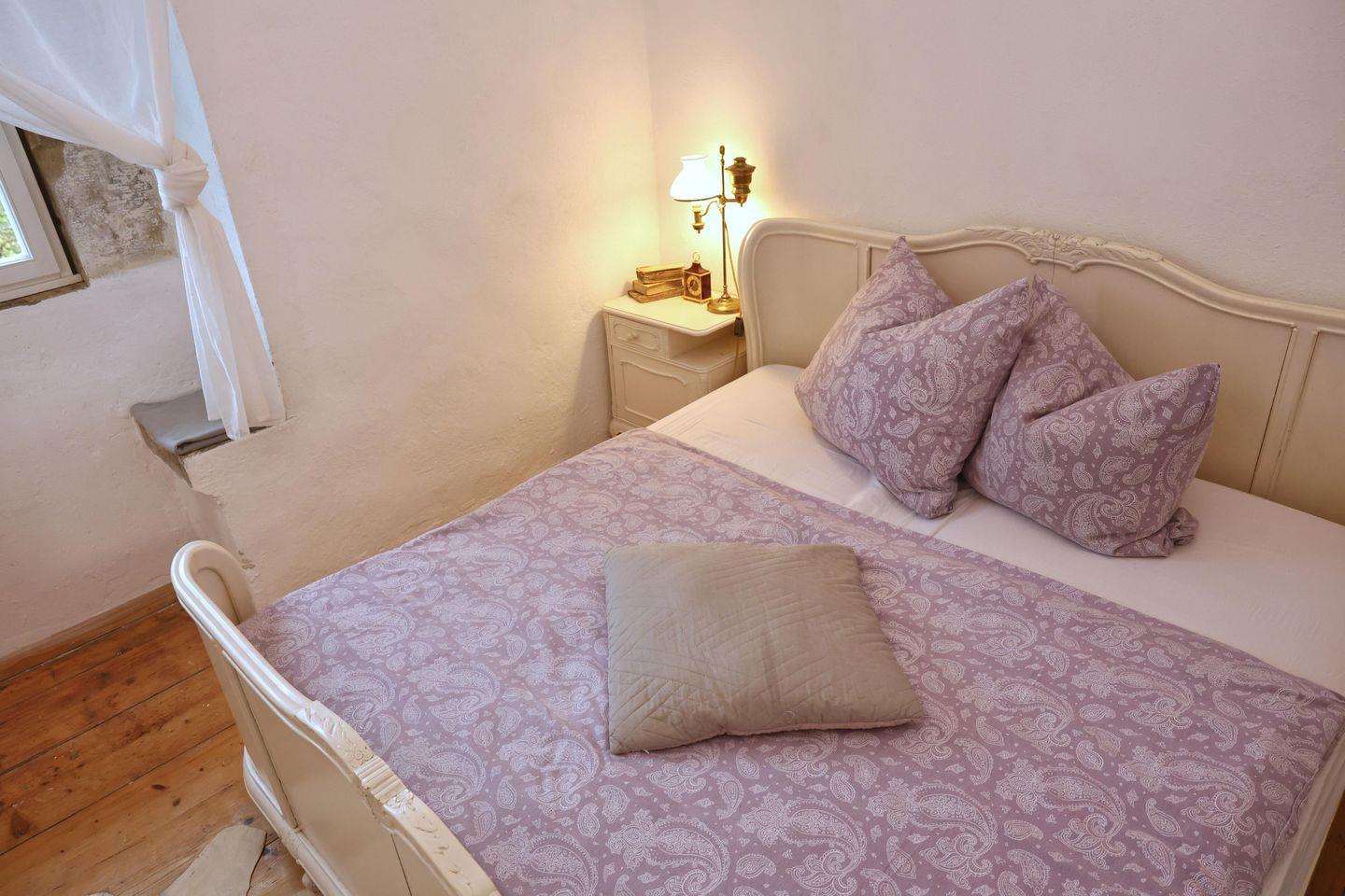In der Fensternische im Schlafzimmer gibt es außerdem zwei historische Sitzsteine. In die Fensternische im Wohnzimmer ist eine Chaiselongue eingepasst, die sowohl als Sofa wie als Bett für eine etwaige dritte Person bestens funktioniert.