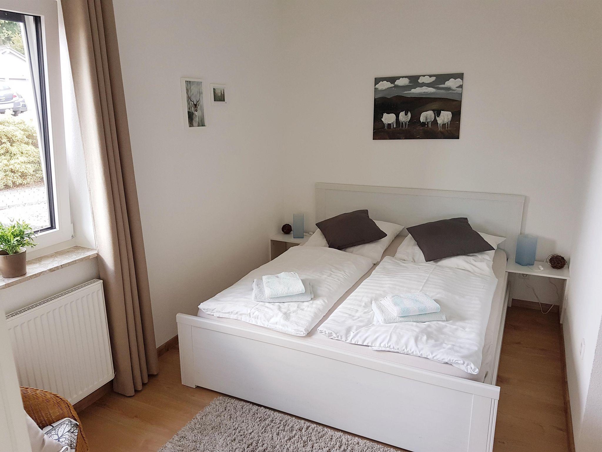 Die freundliche Ferienwohnung ist ca. 60 qm groß. Sie ist ebenerdig über einen separaten Eingang zugänglich und verfügt über 2 DZ mit Bad/WC sowie DU/WC. Der Wohn-/ Essraum mit gemütlicher Sitzgruppe (Sat.-TV) und neuer gut ausgestatteter Küche eignet sich für gemeinsame Stunden in gemütlicher Atmosphäre. Die Ferienwohnung verfügt über eine Sonnenterrasse mit Sitzgruppe und Sonnenschirm und lädt zum Entspannen ein. WLAN ist zur kostenfreien Nutzung. Die Mindestaufenthaltsdauer beträgt 3 Nächte. Der Grundpreis für 2 Personen gilt bei Nutzung nur eines DZ. Es sind keine Haustiere möglich.
