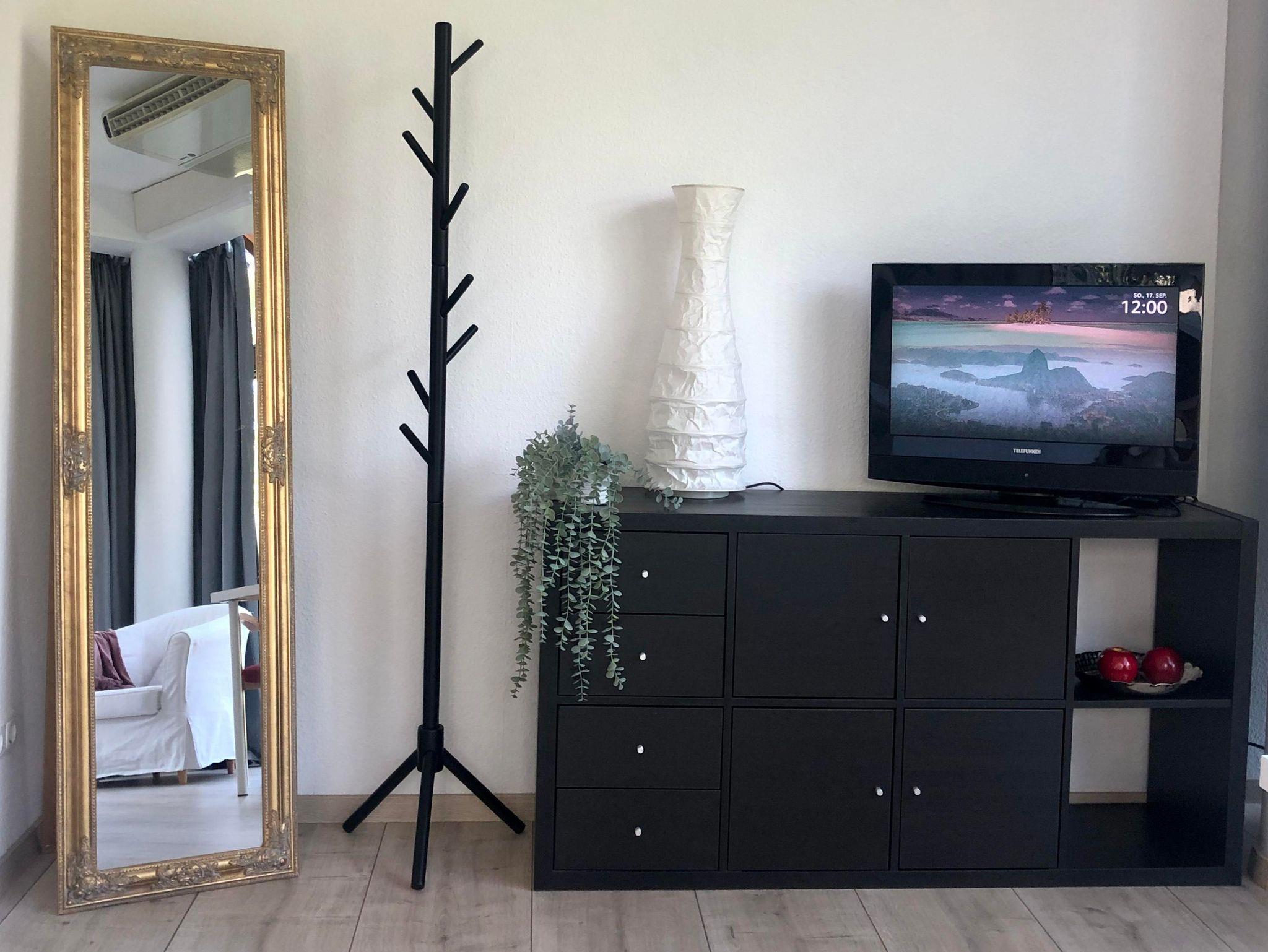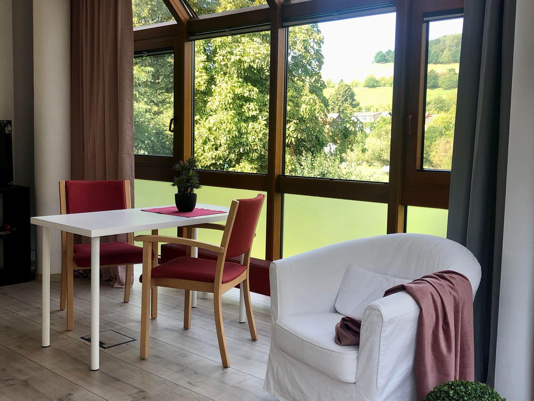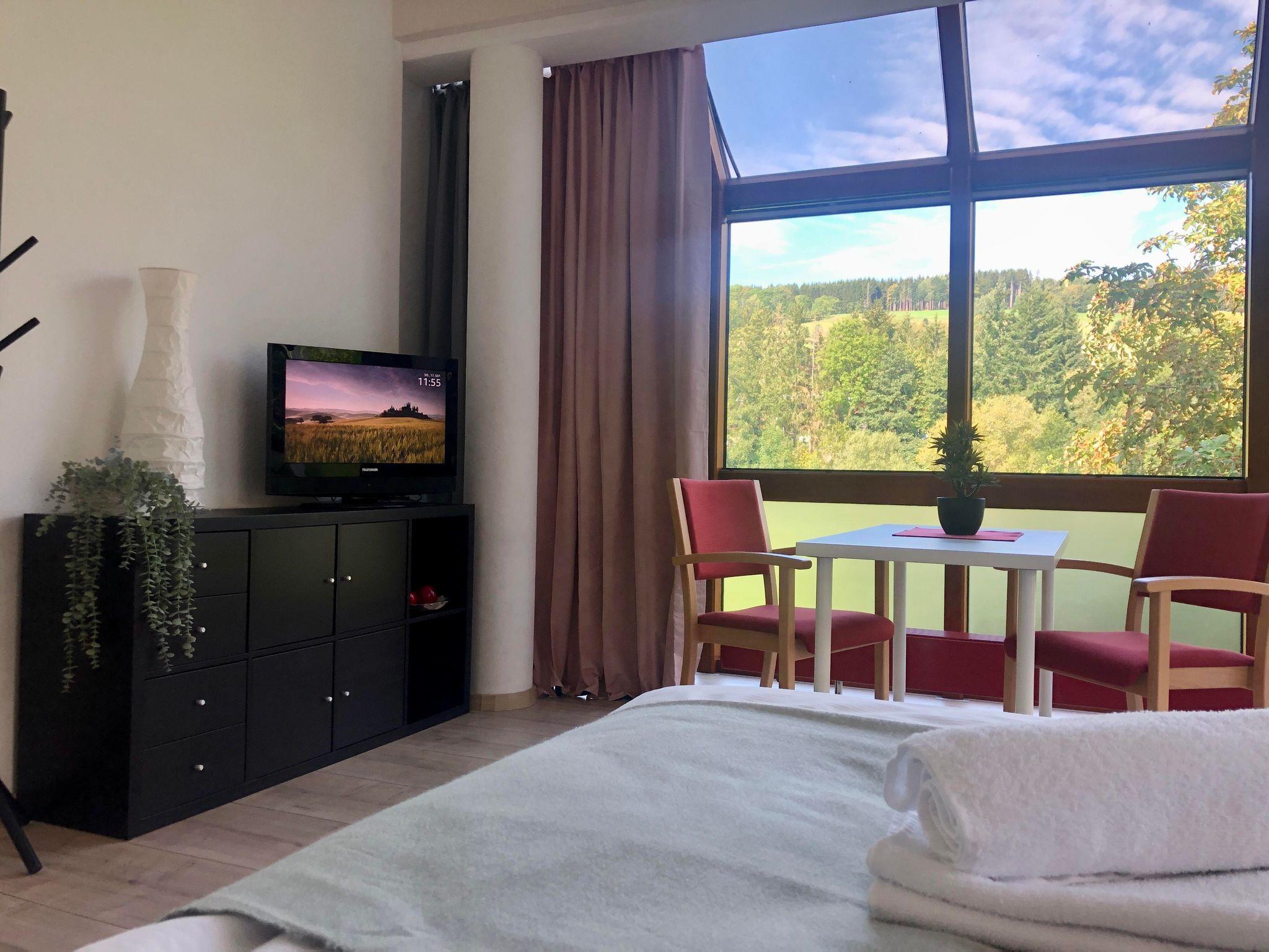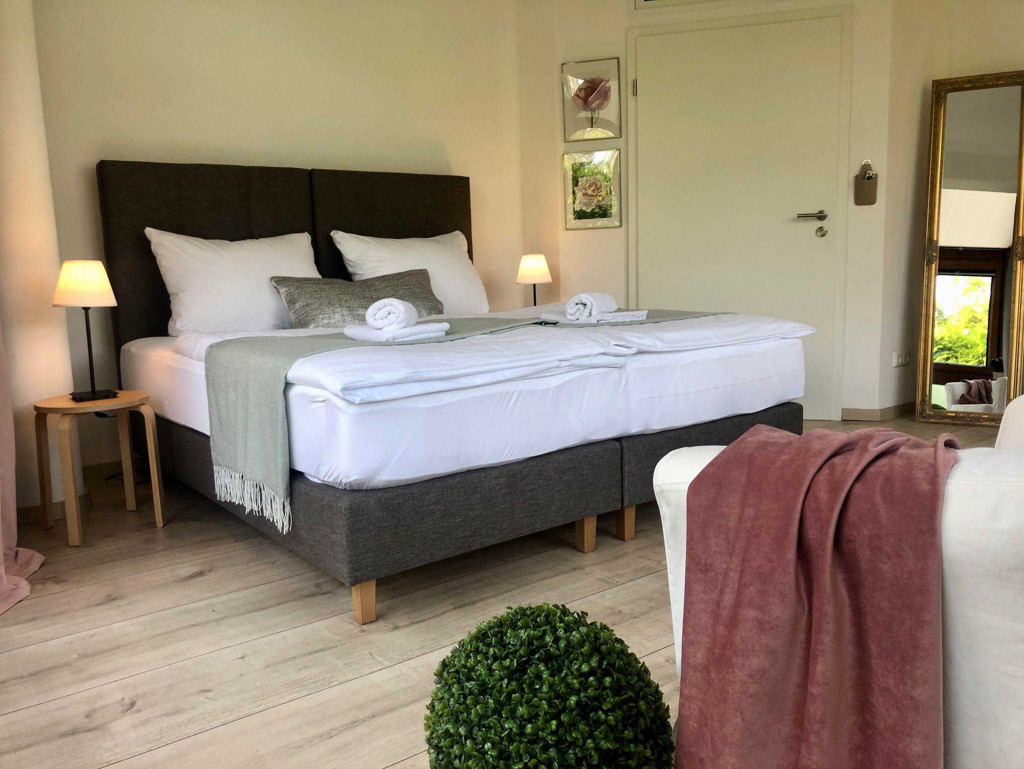 Unser Doppelzimmer (25m²) mit großzügigem Blick ins Grüne ist hell und modern eingerichtet. Es ist ausgestattet mit einem Doppelbett (2 Boxspringbetten mit Federkernmatratzen, Größe 180x200cm), Tisch mit 2 Stühlen, Sessel, Spiegel, Kommode mit smart-TV und Garderobe. Über die großen Fensterflächen haben Sie einen schönen Blick in unseren Garten und die Landschaft.