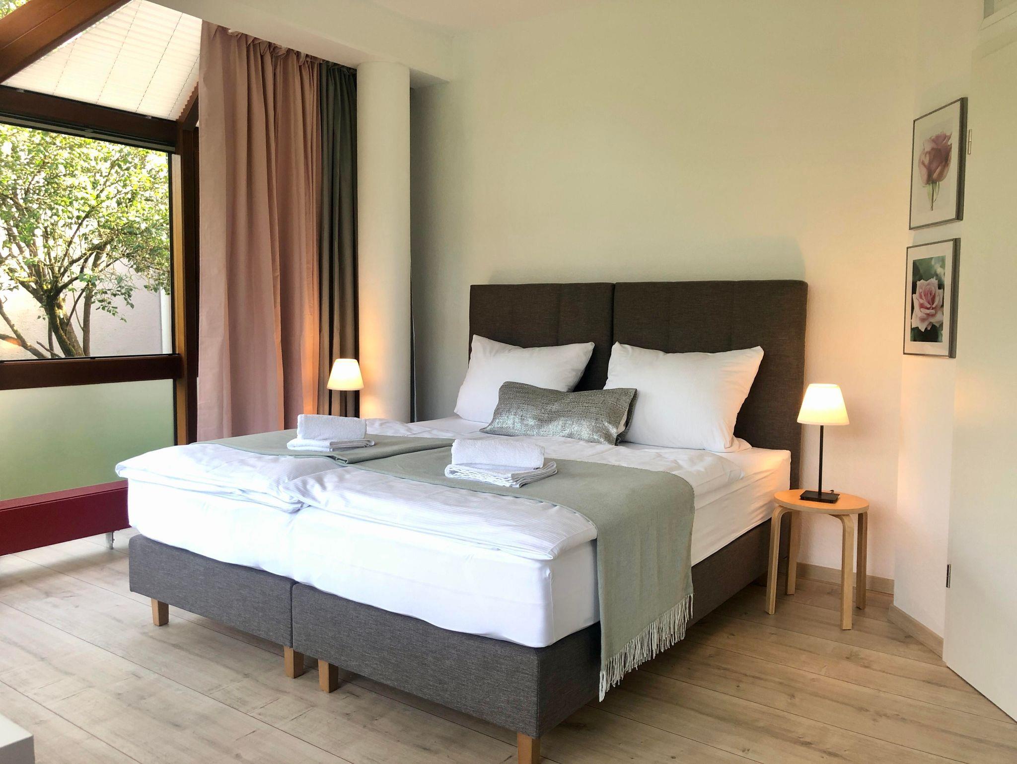 Entspannen Sie in unseren ruhigen Doppel- und Einzelzimmern von einem aktiven Tag.