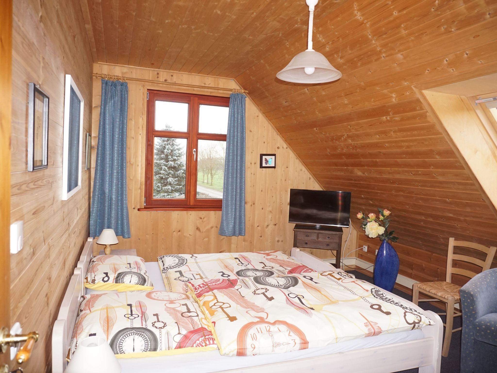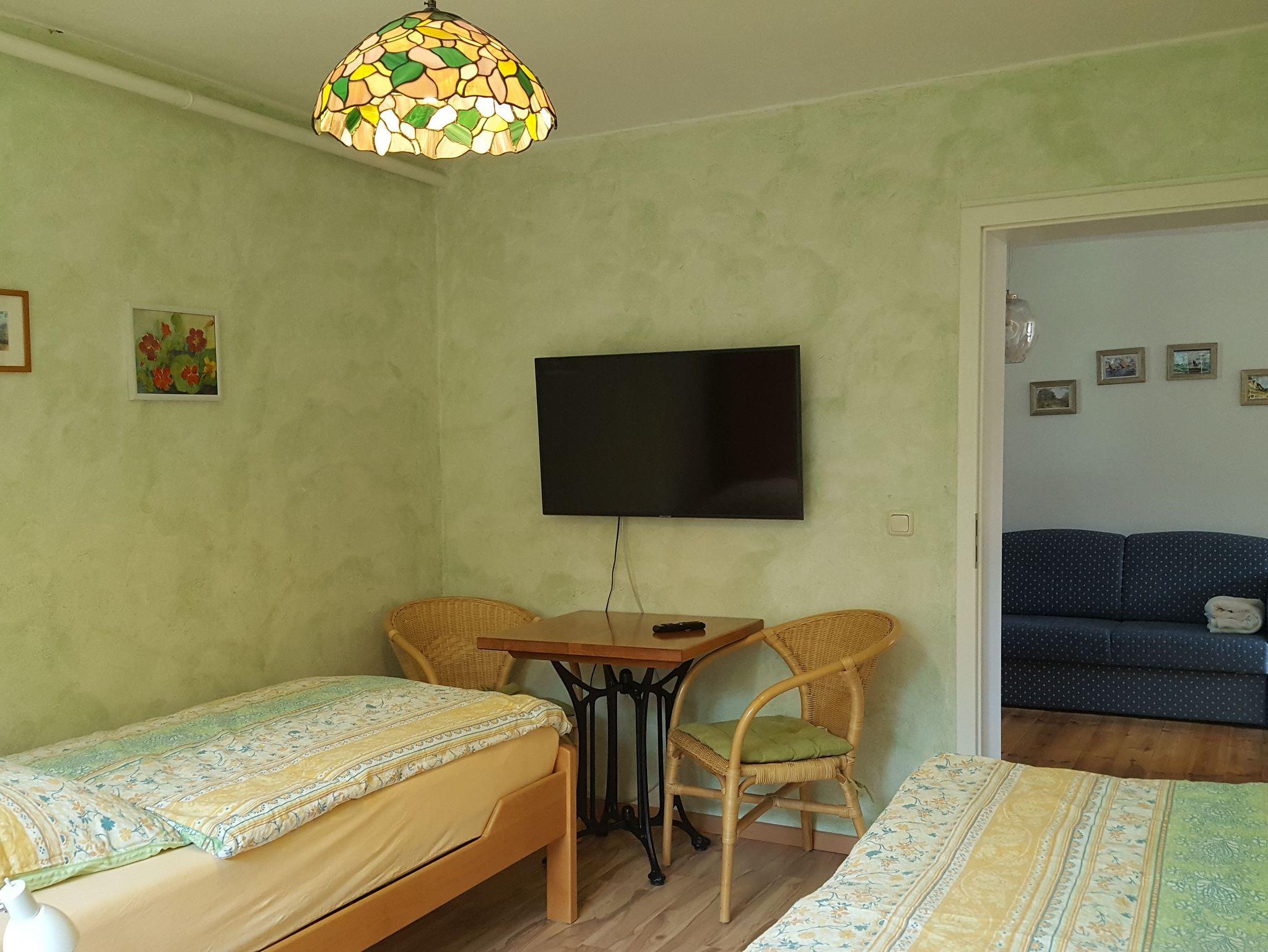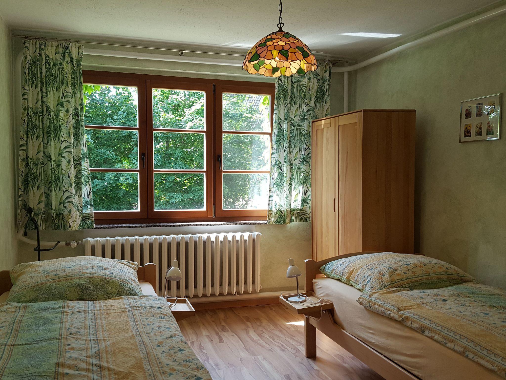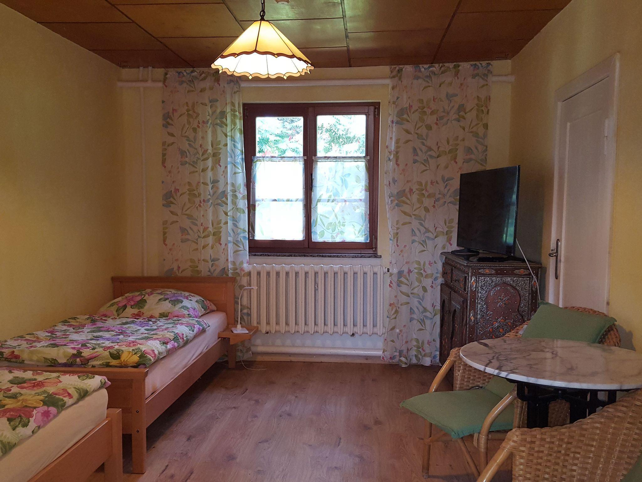 Das Zweibettzimmer befindet sich im Kleinen Steinhaus (Baujahr 1995; Komplettsanierung 2022) und ist ganz individuell mit Holzmöbeln ausgestattet. Zwei Fenster zum Hof geben Ausblick auf einen ehemaligen Bauernhof. Es ist ausgestattet mit TV, Bettwäsche und Handtüchern. Das Bad mit Dusche und WC befindet sich in einem separaten Raum und wird gegebenenfalls mit einem Gast in einem Einzelzimmer gemeinsam genutzt. Die Küche wird von allen Gästen genutzt. Ein Reisekinderbett (10,- Euro) und ein Kinderhochstuhl (3,- Euro) wird Ihnen auf Anfrage zur Verfügung gestellt.