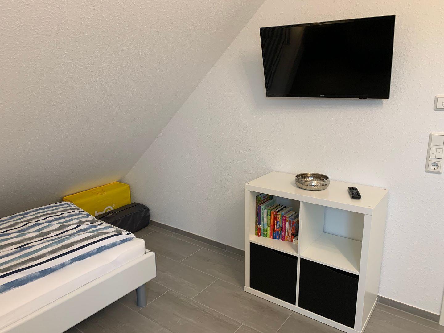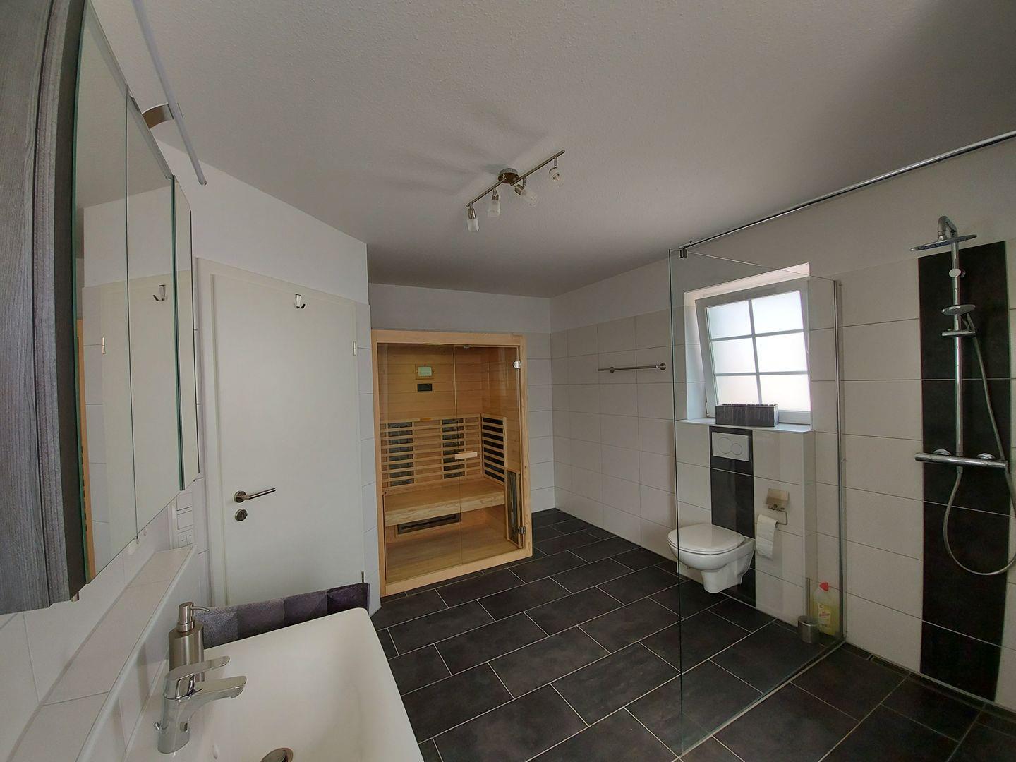 Ein Schlafzimmer mit einem Boxspringdoppelbett (durchgehende Matratze 180 x 200 m) in Komforthöhe, Flachbildfernseher und ein großer Schrank befindet sich im EG, ebenso ein Badezimmer mit ebenerdiger Dusche, WC und Föhn. Die moderne Infrarotwärmekabine bietet Ihnen außer einem Duo-Vital-Strahlersystem mit Vollspektrum-Light- und Carbonflächenwärmstrahlern, auch abschaltbare Wadenstrahler, ein Musiksystem sowie eine Farblichttherapie.