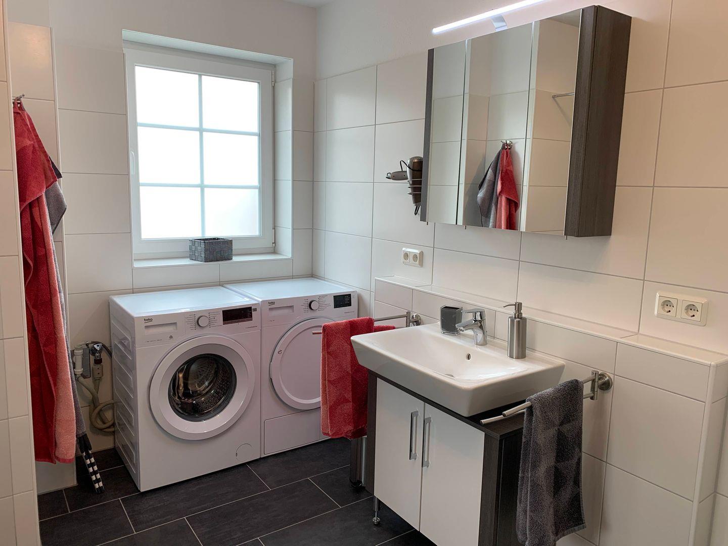 Waschmaschine, Trockner, Wäscheständer, Bügelbrett- und Eisen sowie Putzutensilien sind vorhanden.
